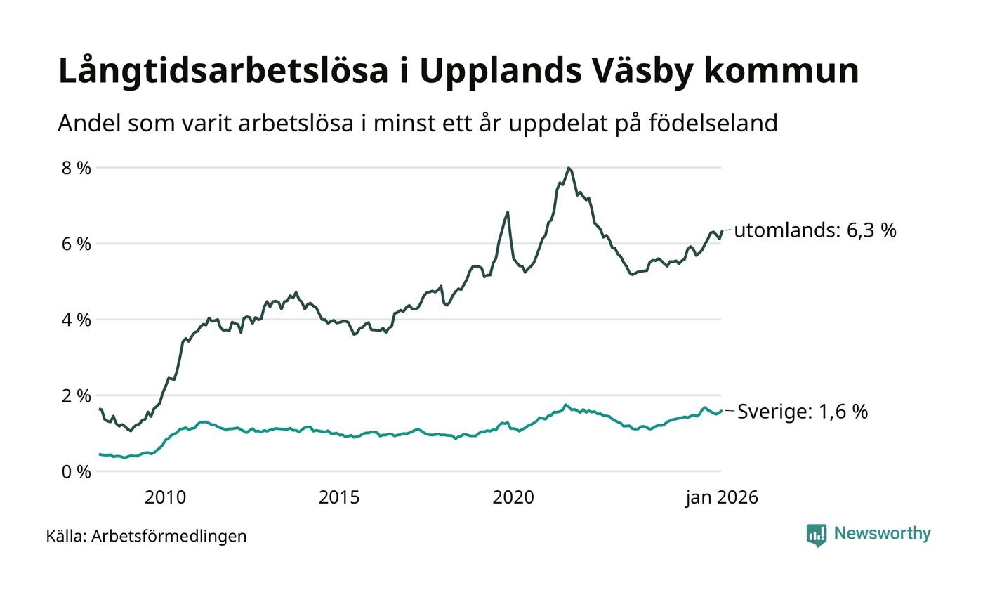 237 av de långtidsarbetslösa i Upplands Väsby är födda i Sverige, medan 729 är födda utomlands. Det innebär att långtidsarbetslösheten bland Sverigefödda är 1,6 procent, medan den är fyra gånger så hög – 6,3 procent – bland födda utomlands. Även i riket som helhet är arbetslösheten högre bland utrikesfödda.