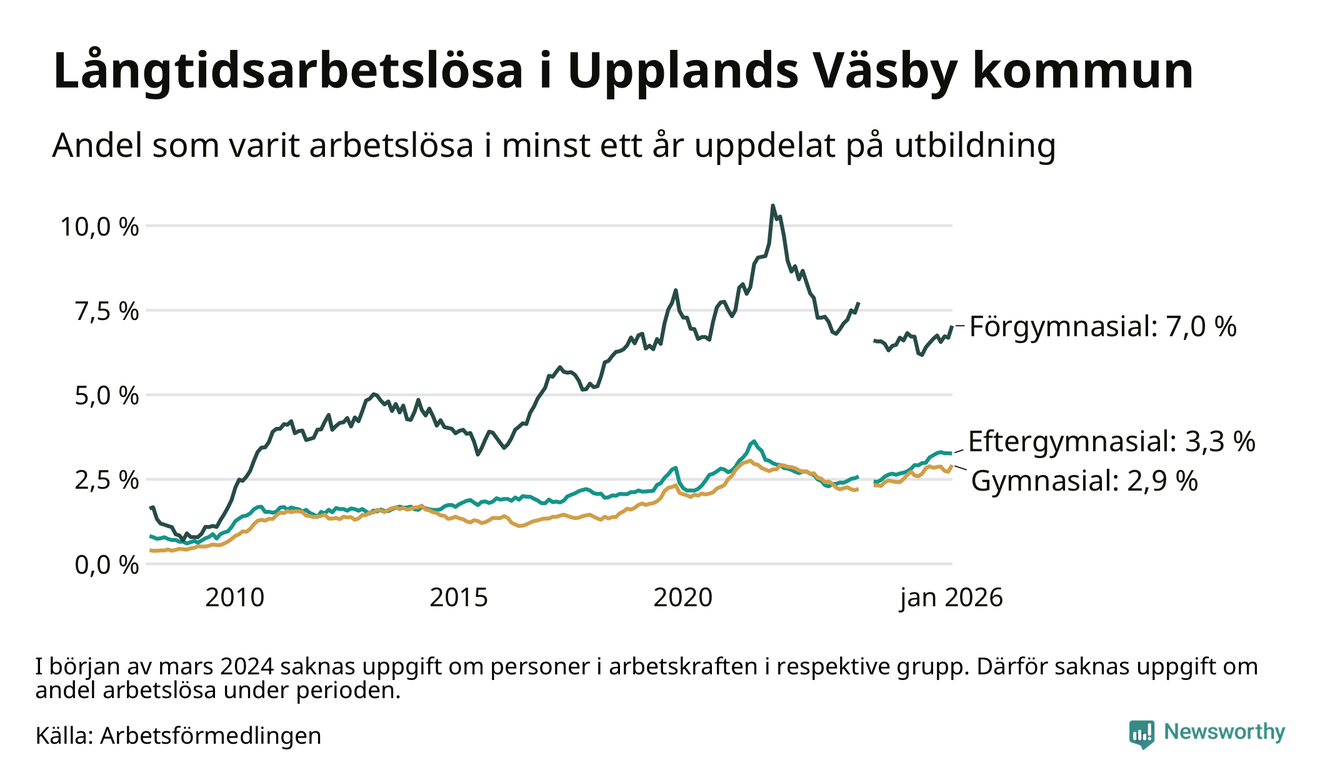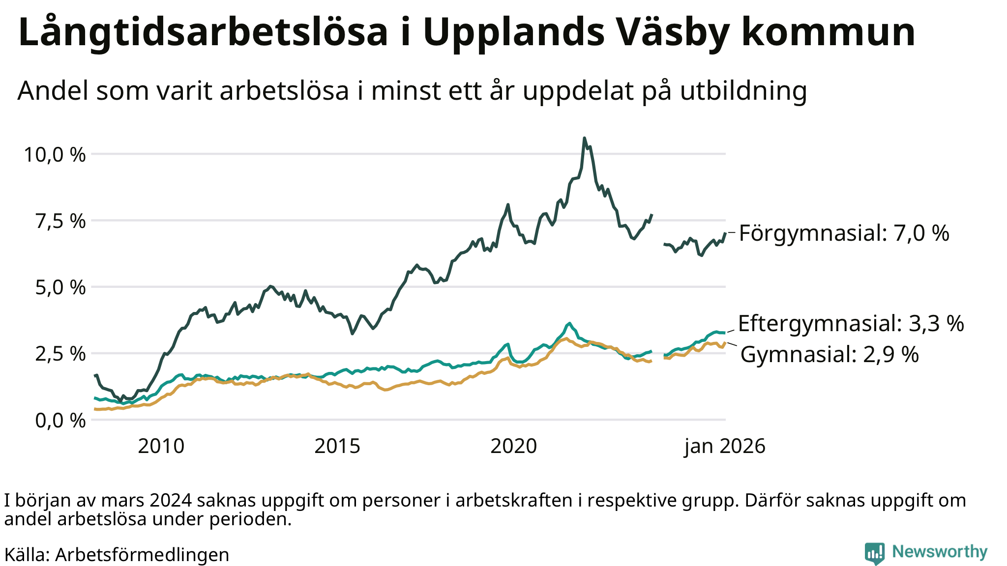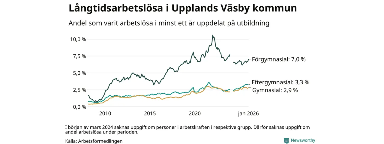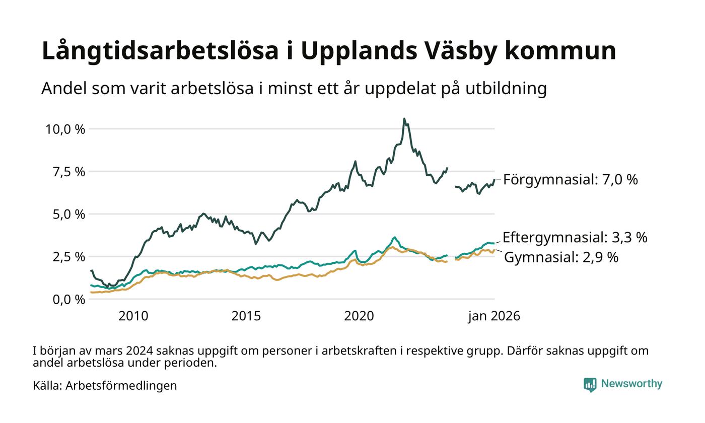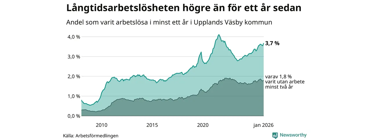 Inte sedan mars 2022 har andelen långtidsarbetslösa varit så hög i Upplands Väsby. Det visar Arbetsförmedlingens senaste månadsstatistik.