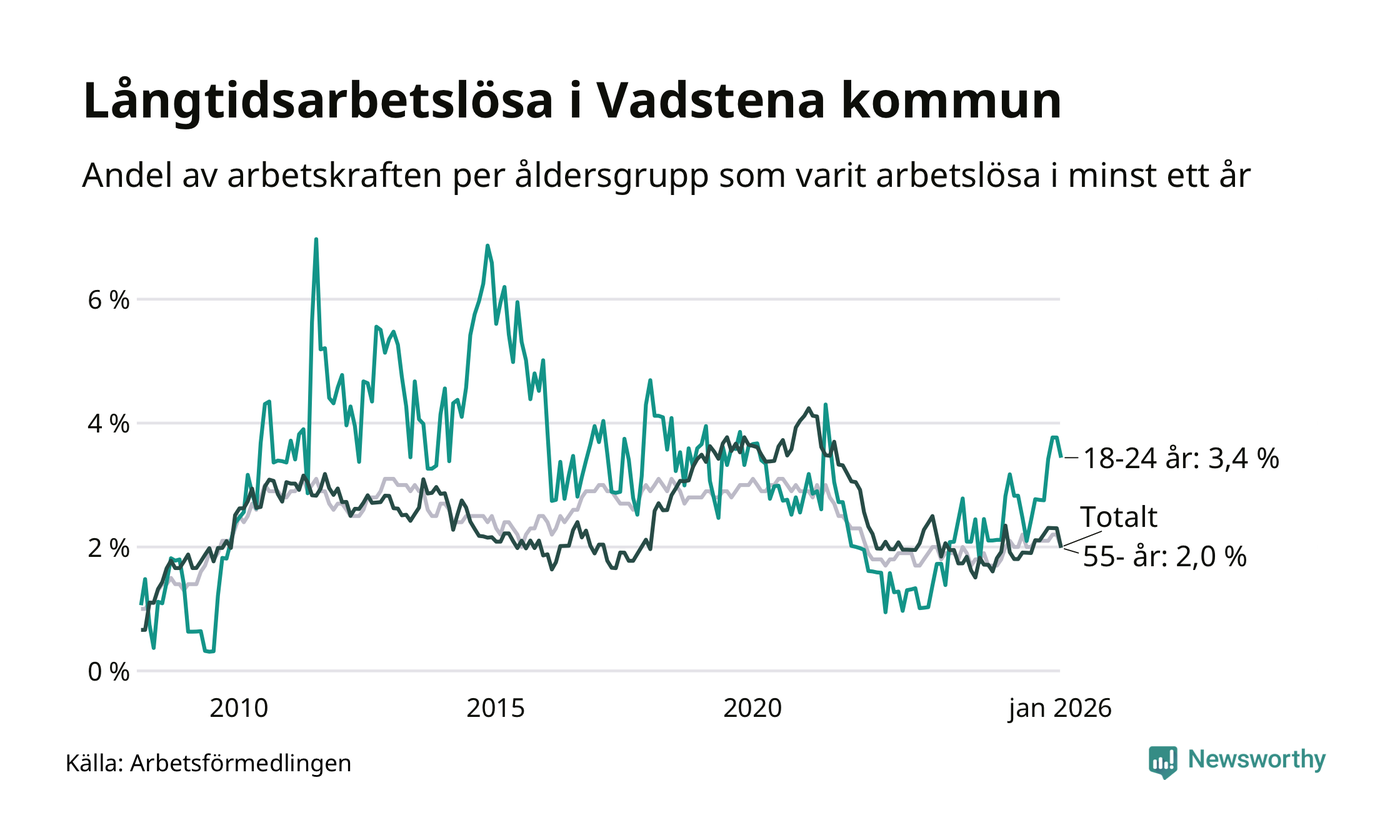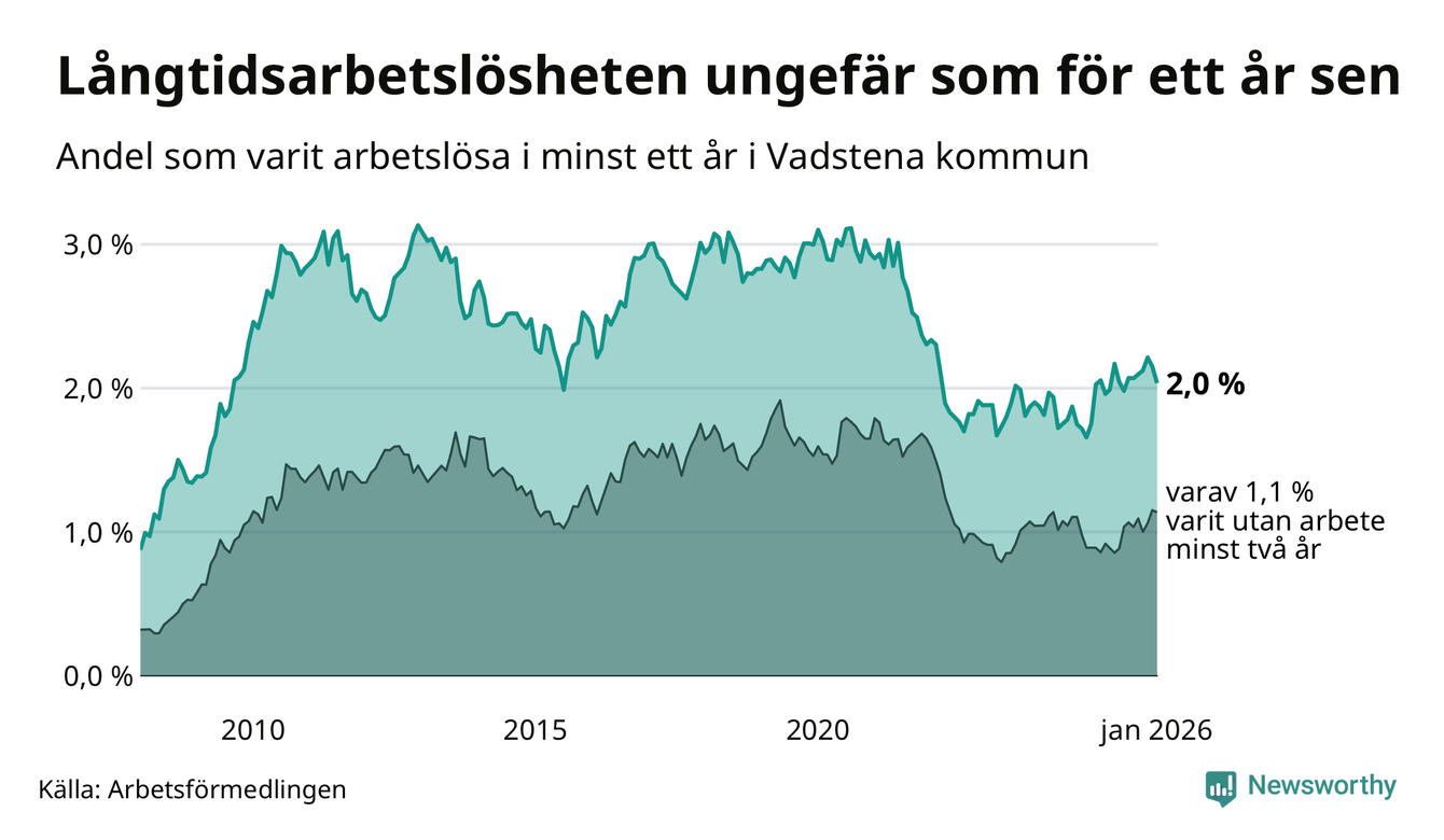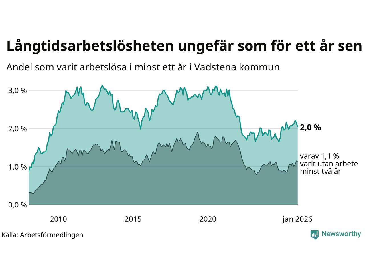 I januari hade 68 Vadstenabor varit arbetslösa i minst ett år, vilket är tre färre än månaden innan. 68 personer motsvarar 2,0 procent av arbetskraften i kommunen – andelen långtidsarbetslösa är ungefär på samma nivå som för ett år sedan.