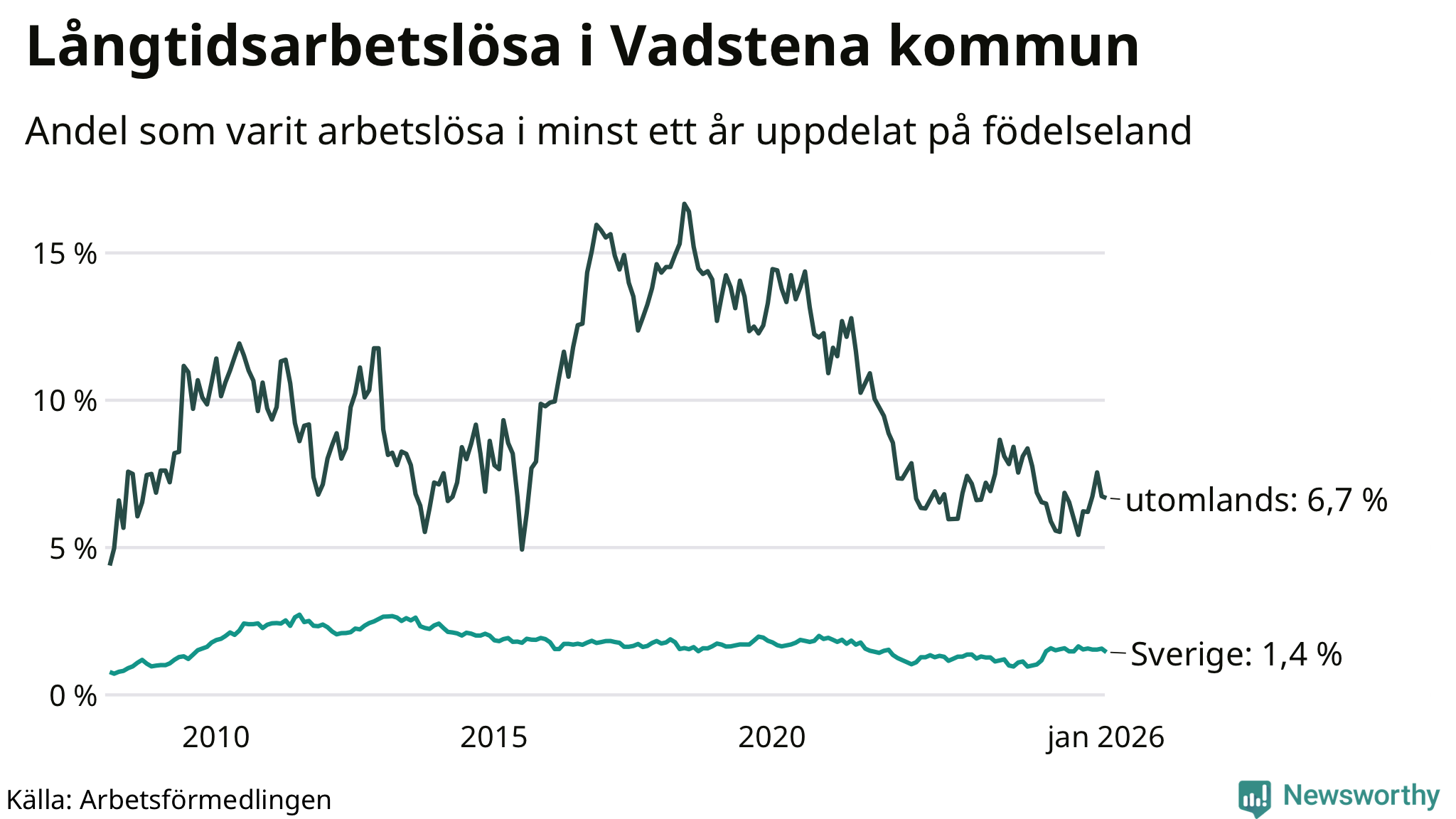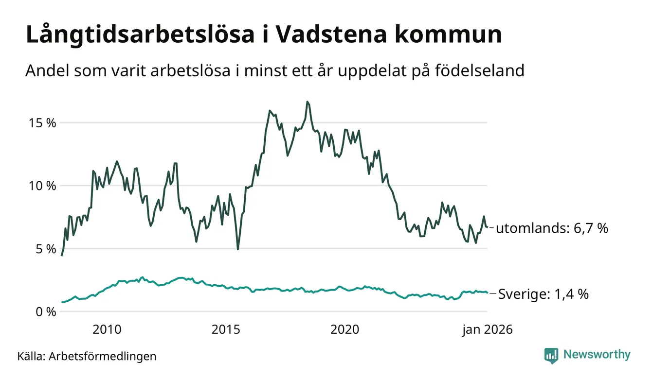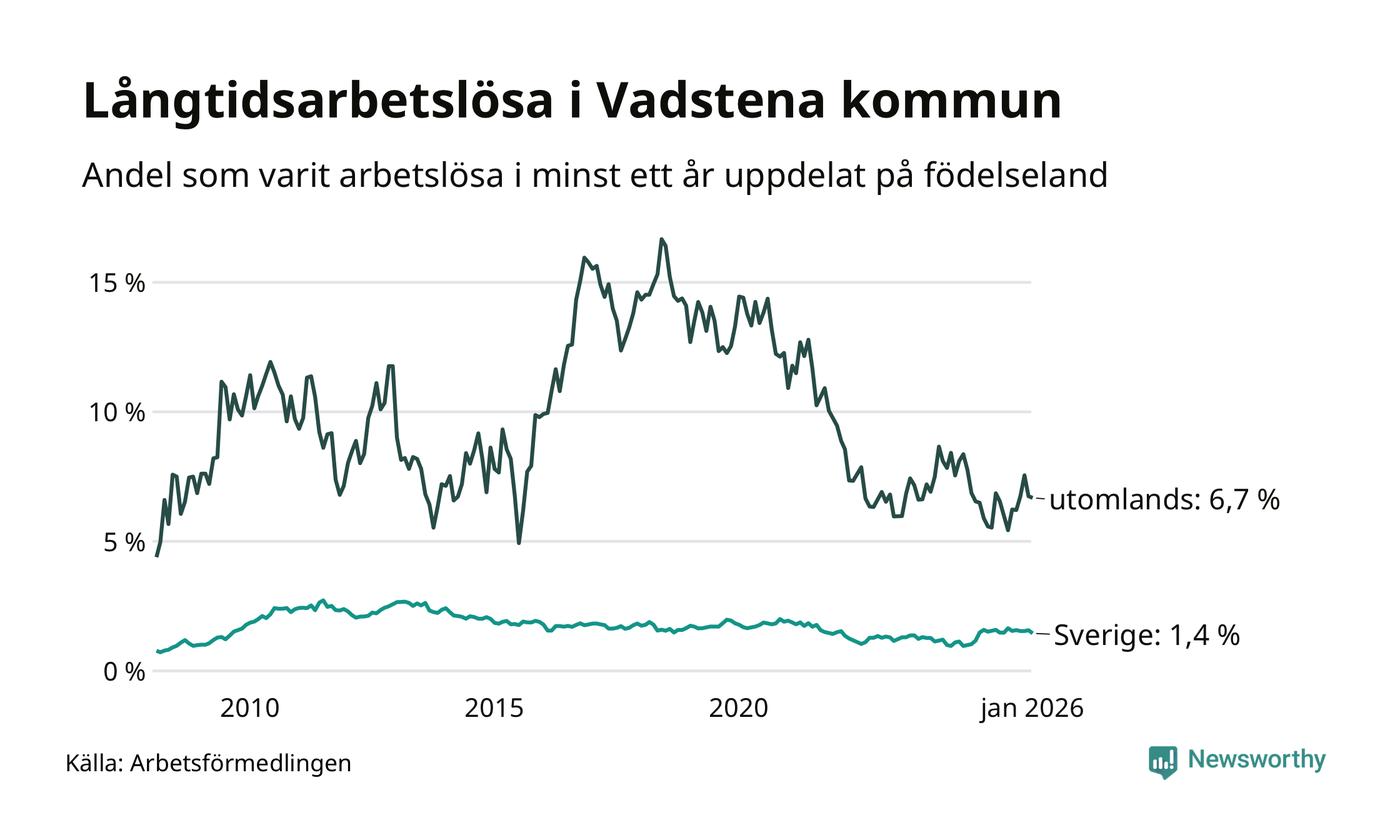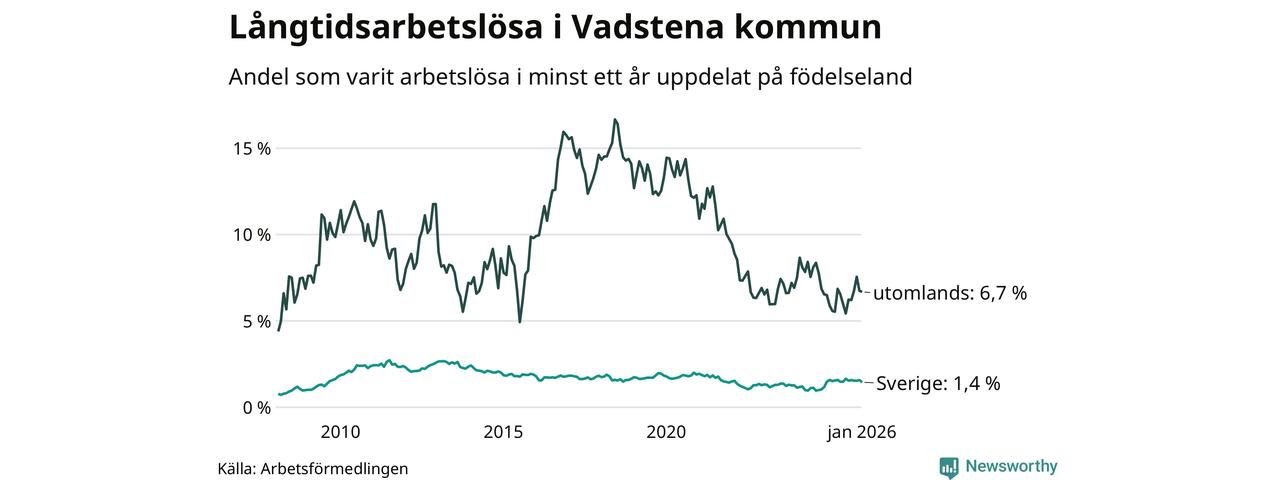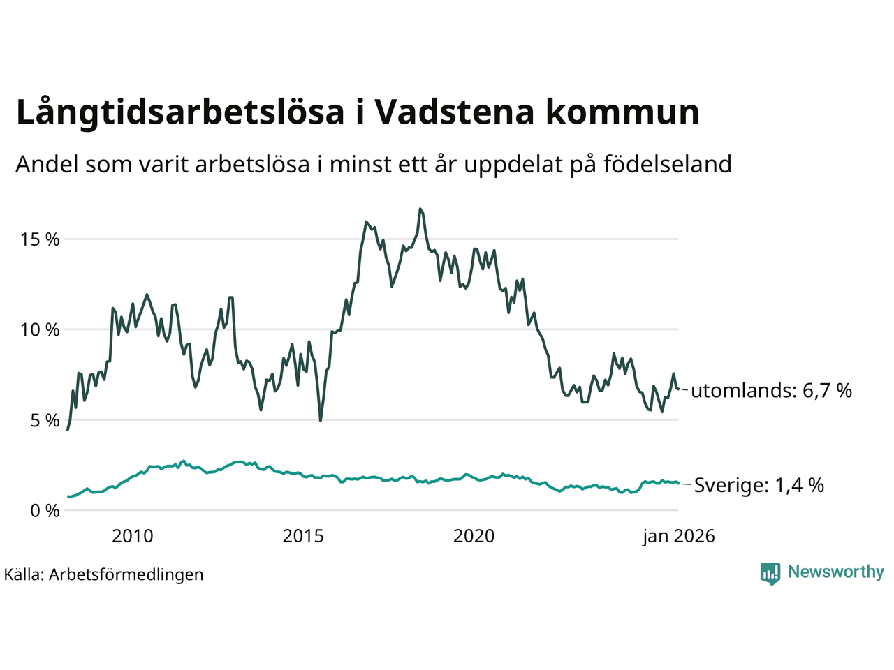 43 av de långtidsarbetslösa i Vadstena är födda i Sverige, medan 25 är födda utomlands. Det innebär att långtidsarbetslösheten bland Sverigefödda är 1,4 procent, medan den är fem gånger så hög – 6,7 procent – bland födda utomlands. Även i riket som helhet är arbetslösheten högre bland utrikesfödda.