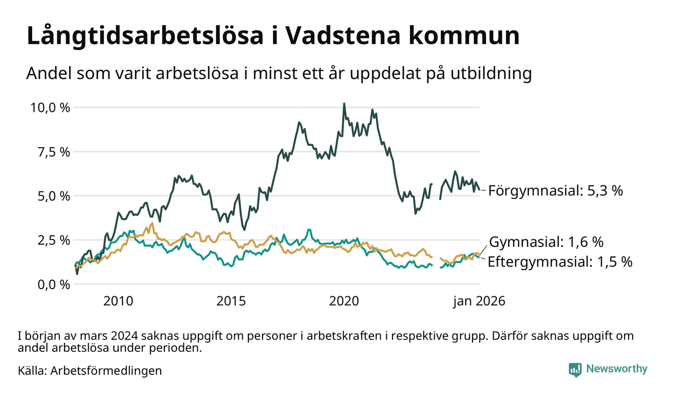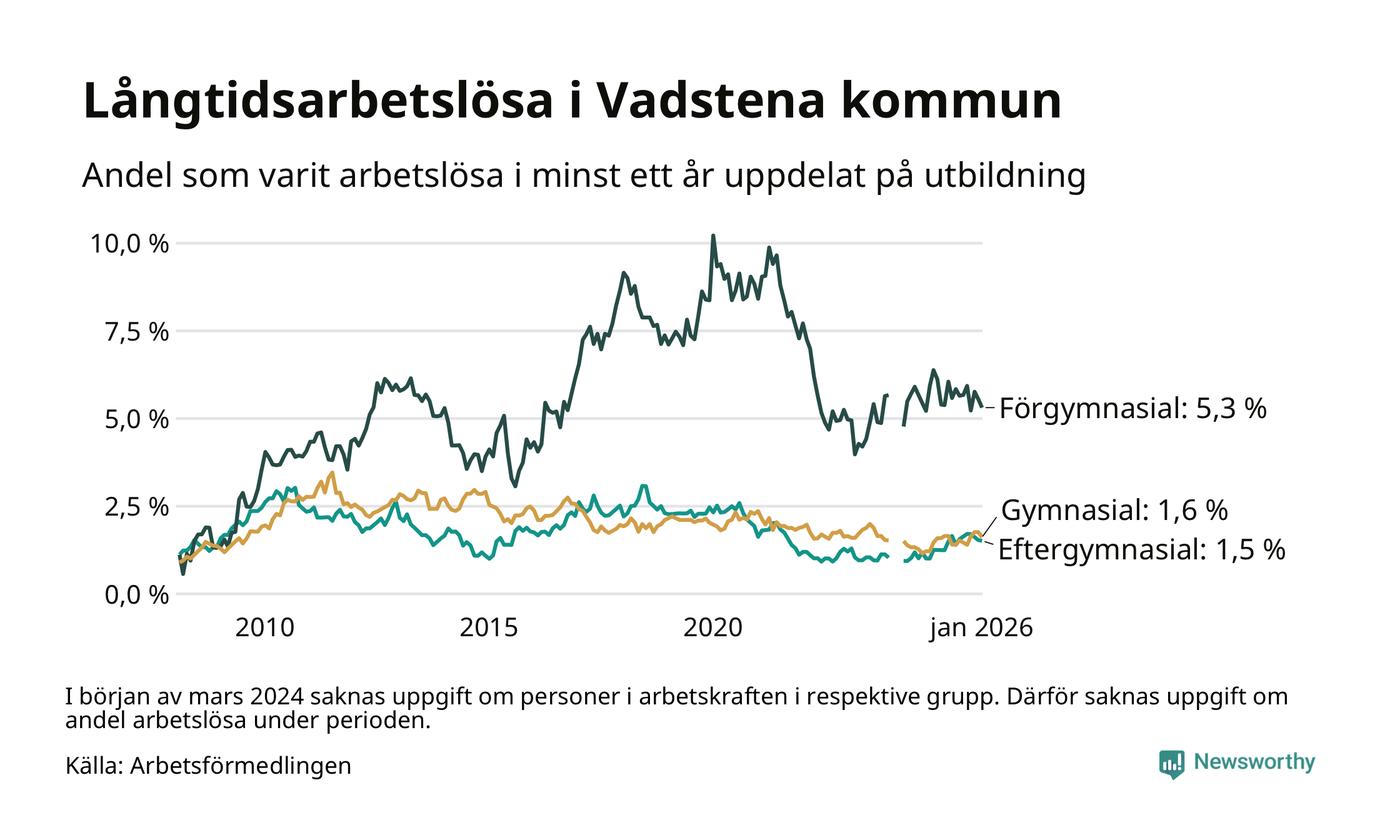 Av de 68 personerna som varit arbetslösa i mer än ett år i Vadstena kommun är 19 personer mellan 55 och 661 år och tio är mellan 18 och 24 år.