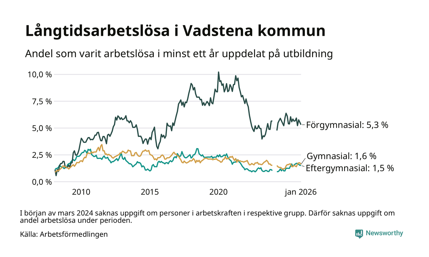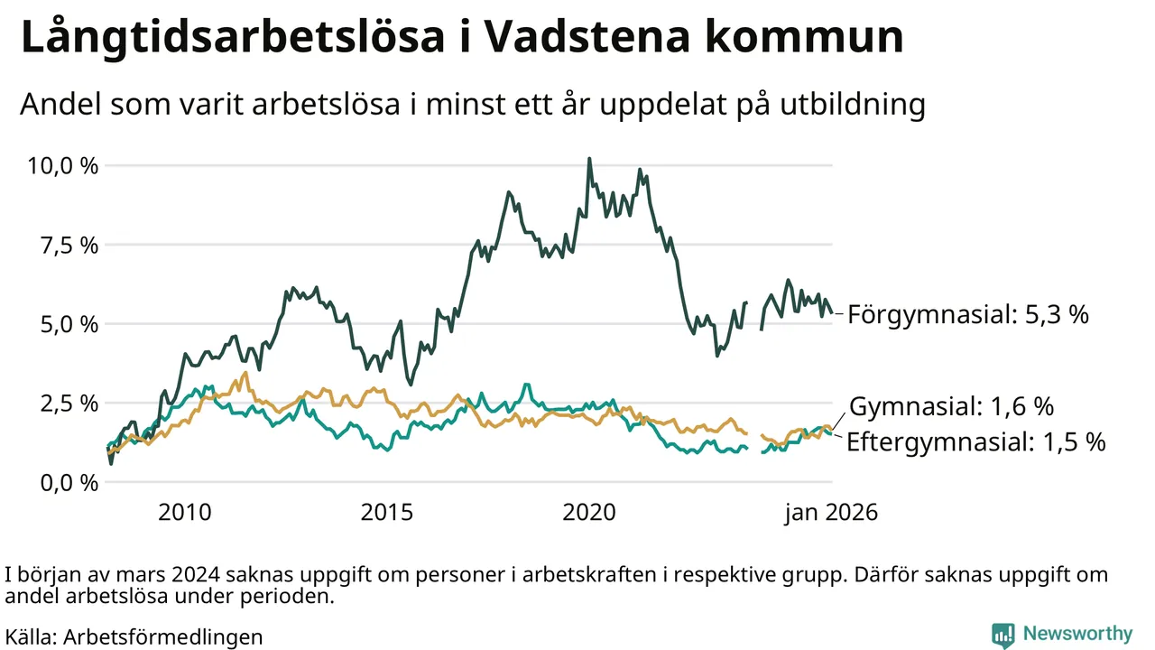Andelen som varit utan arbete i minst ett år i Vadstena var ungefär lika stor i januari jämfört med samma månad för ett år sedan. Det visar Arbetsfömedlingens senaste månadsstatistik.