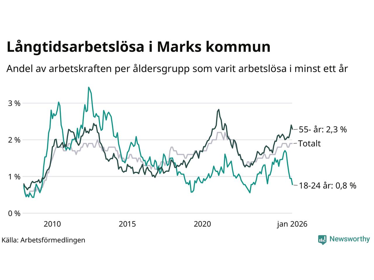 Av de 328 personerna som varit arbetslösa i mer än ett år i Marks kommun är 92 personer mellan 55 och 661 år och 13 är mellan 18 och 24 år. För den äldre gruppen är andelen arbetslösa 2,3 procent medan den i den yngre gruppen är 0,8 procent. Även i riket som helhet är långtidsarbetslösheten högre i gruppen äldre.