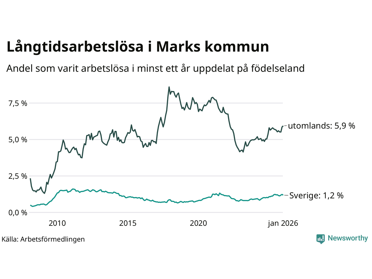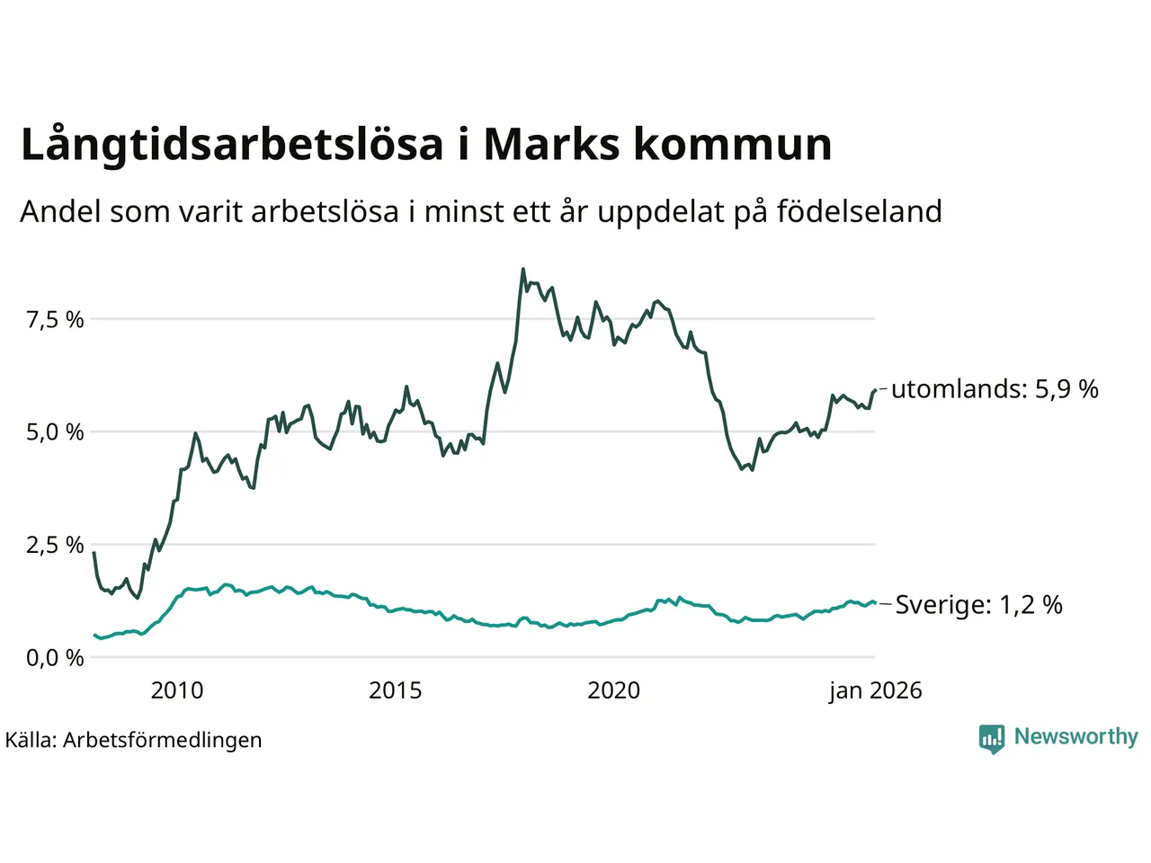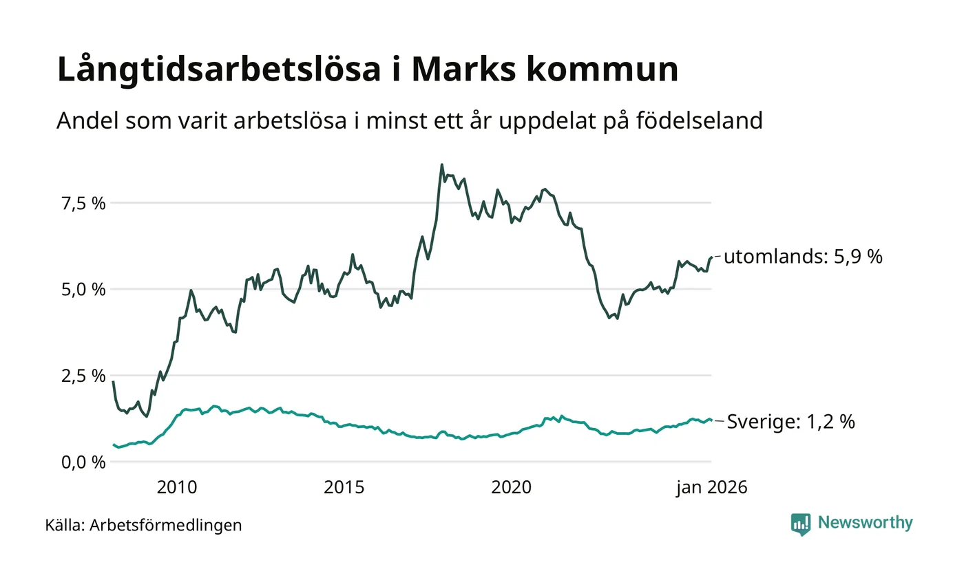 171 av de långtidsarbetslösa i Mark är födda i Sverige, medan 157 är födda utomlands. Det innebär att långtidsarbetslösheten bland Sverigefödda är 1,2 procent, medan den är fem gånger så hög – 5,9 procent – bland födda utomlands. Även i riket som helhet är arbetslösheten högre bland utrikesfödda.