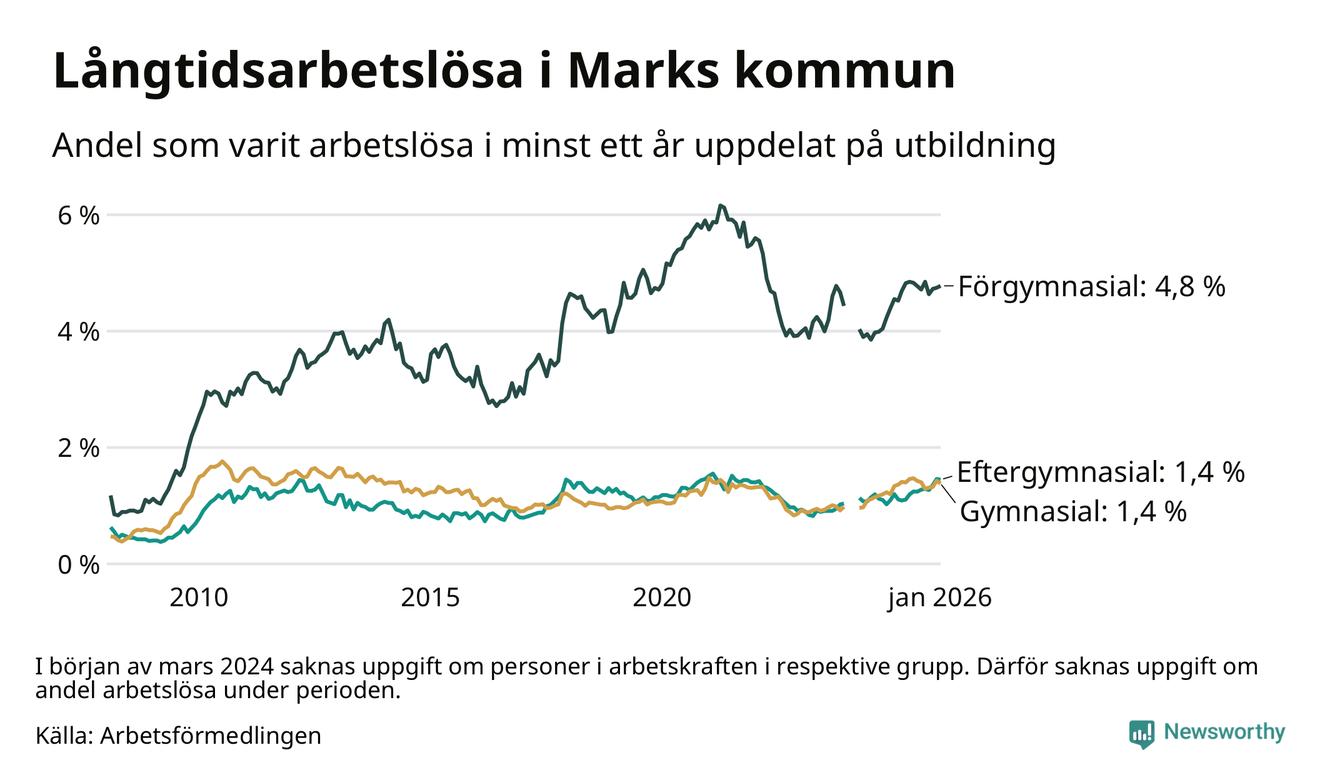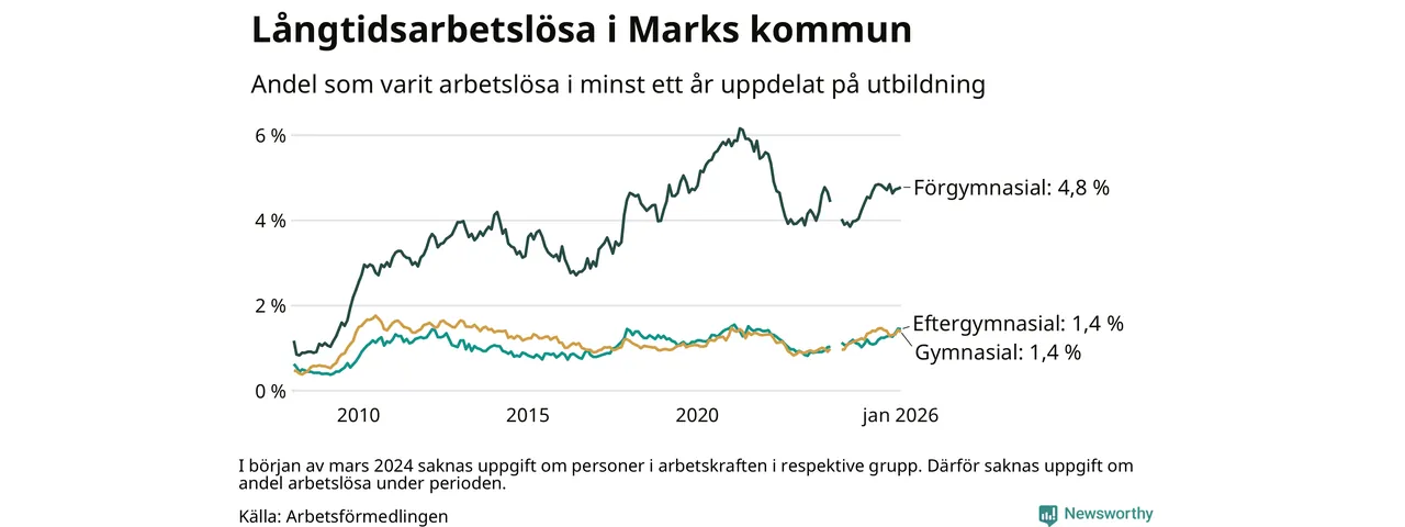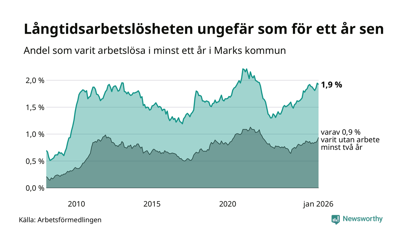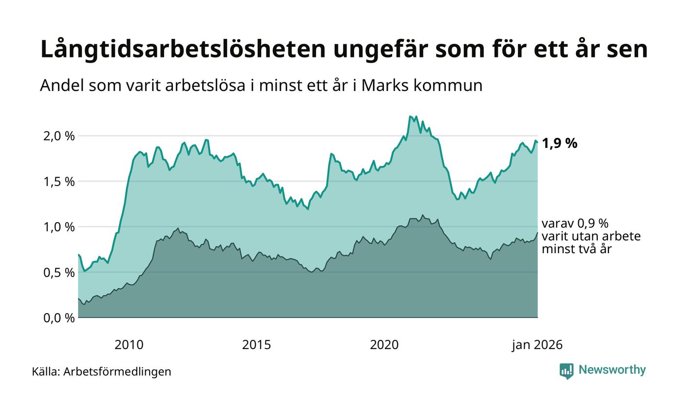 Andelen som varit utan arbete i minst ett år i Mark var ungefär lika stor i januari jämfört med samma månad för ett år sedan. Det visar Arbetsfömedlingens senaste månadsstatistik.