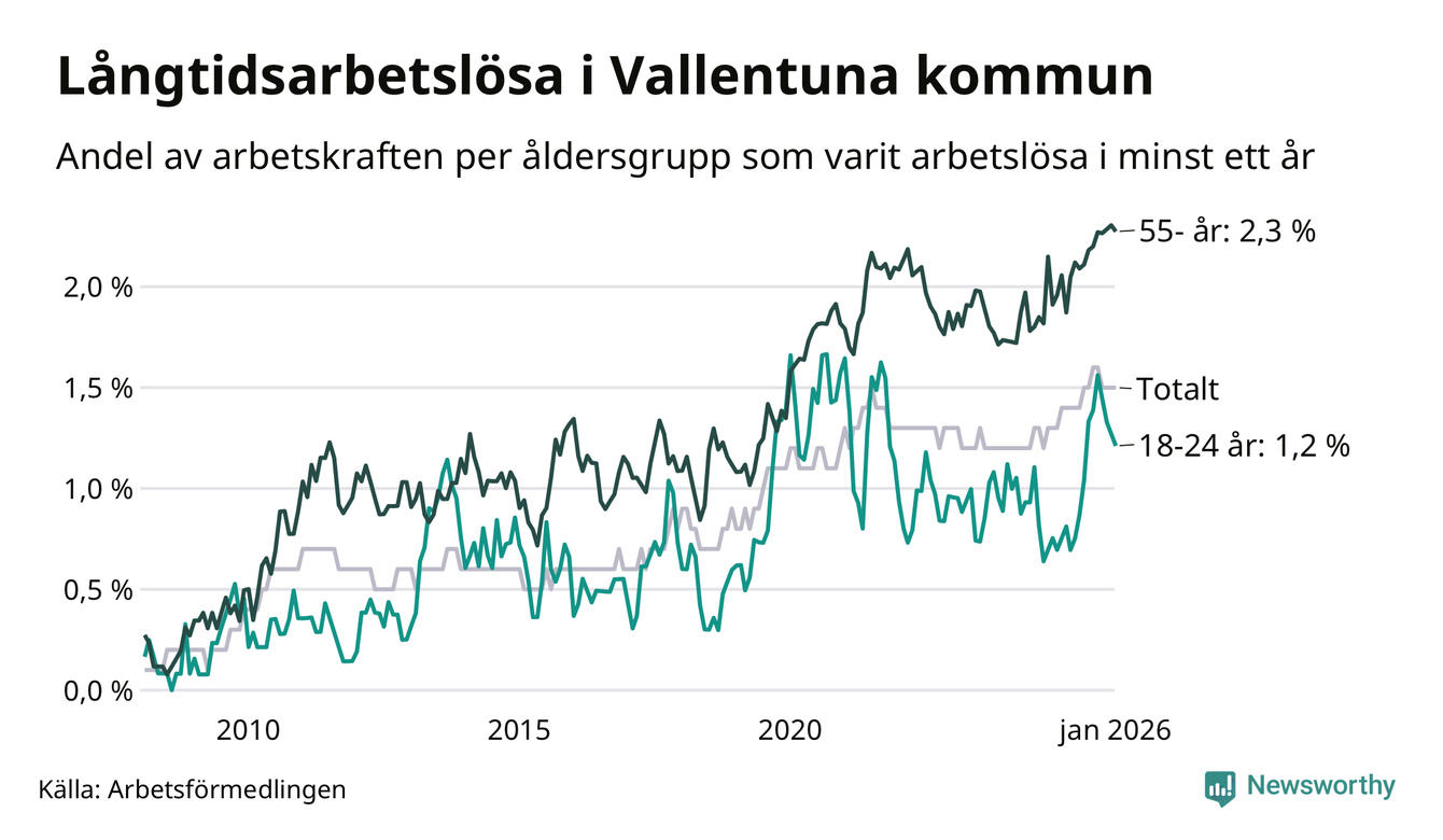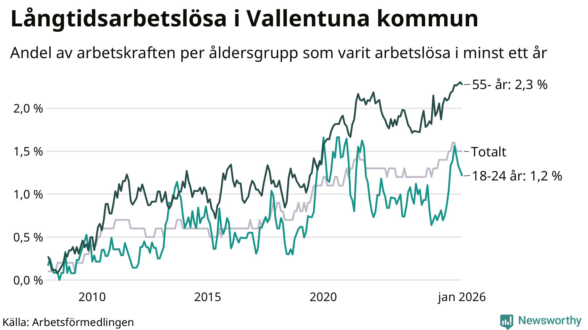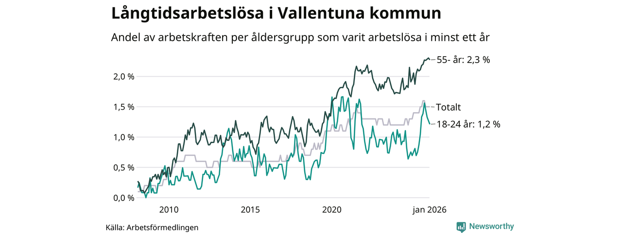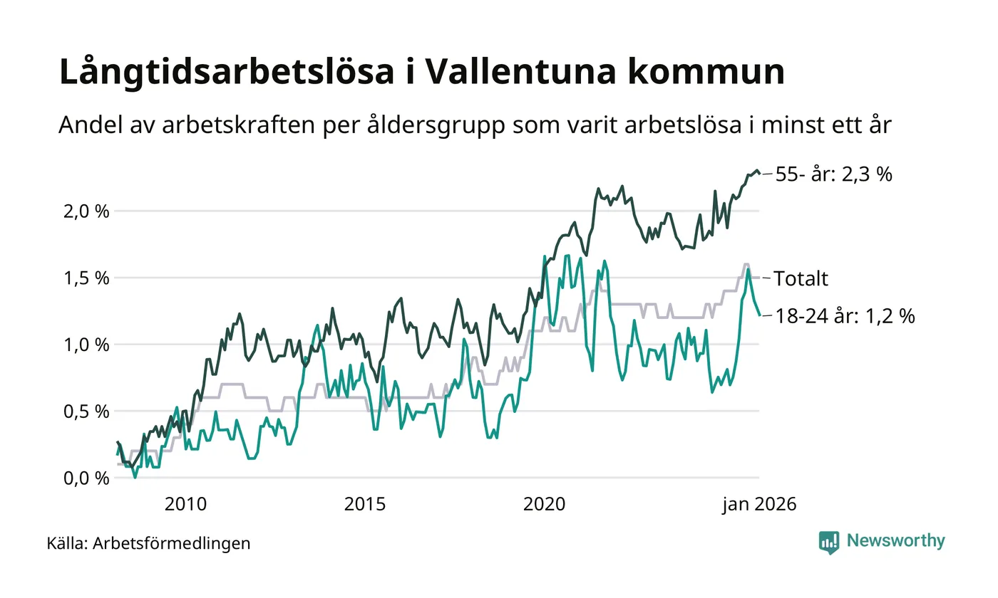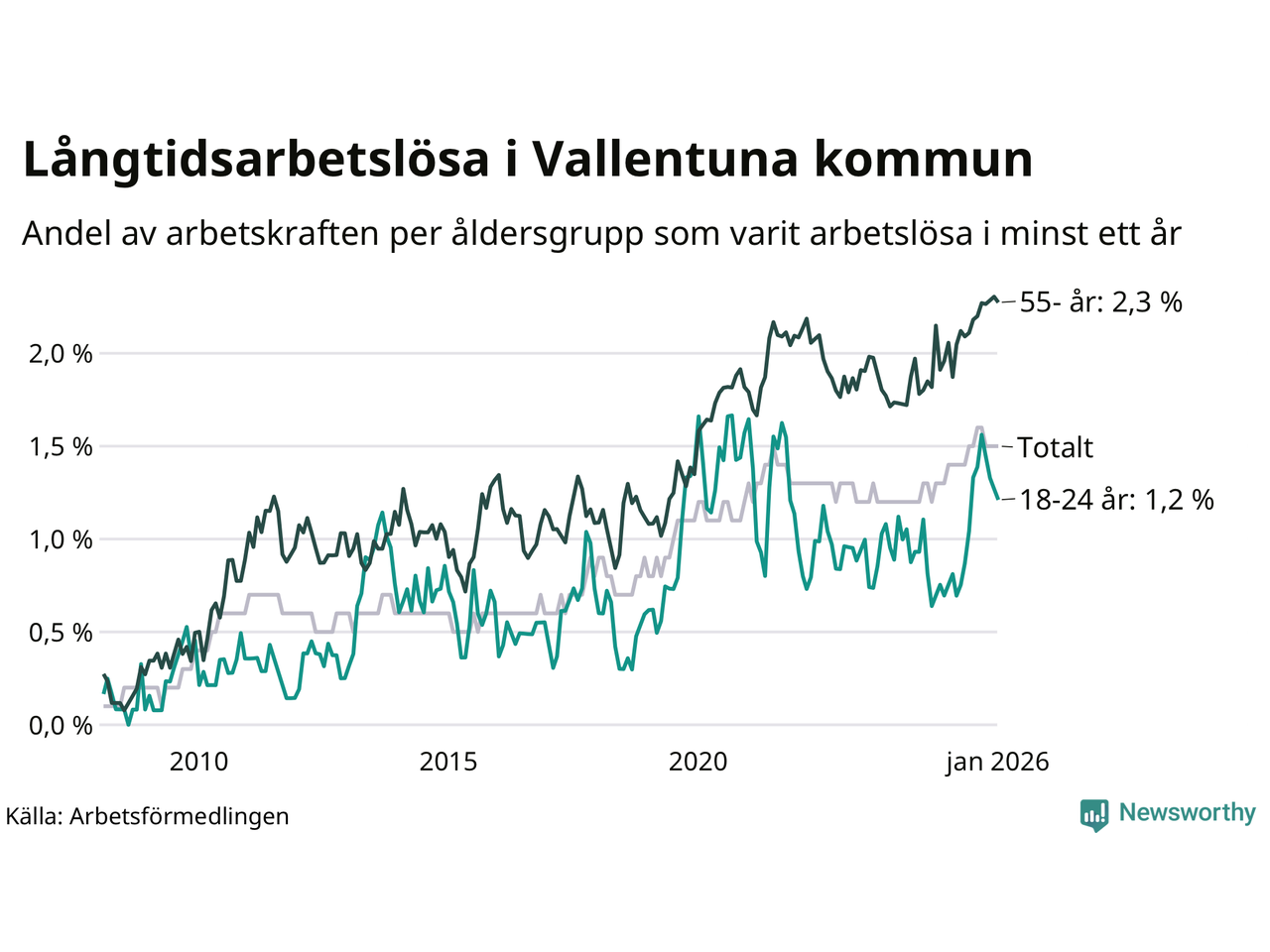 Av de 283 personerna som varit arbetslösa i mer än ett år i Vallentuna kommun är 91 personer mellan 55 och 661 år och 21 är mellan 18 och 24 år. För den äldre gruppen är andelen arbetslösa 2,3 procent medan den i den yngre gruppen är 1,2 procent. Även i riket som helhet är långtidsarbetslösheten högre i gruppen äldre.