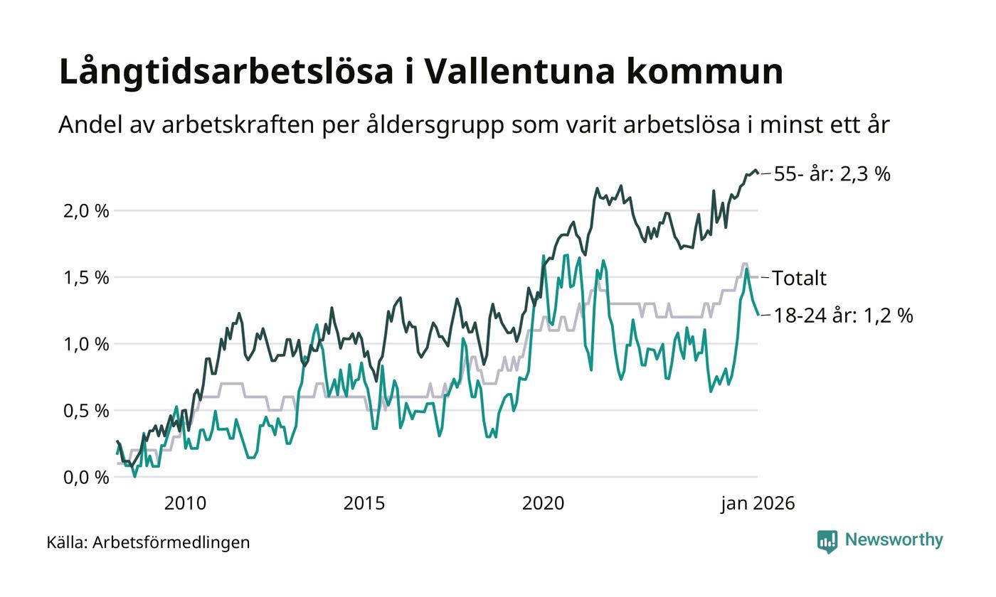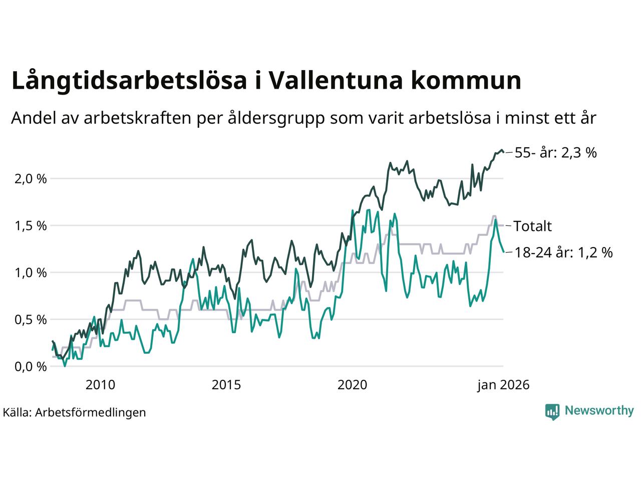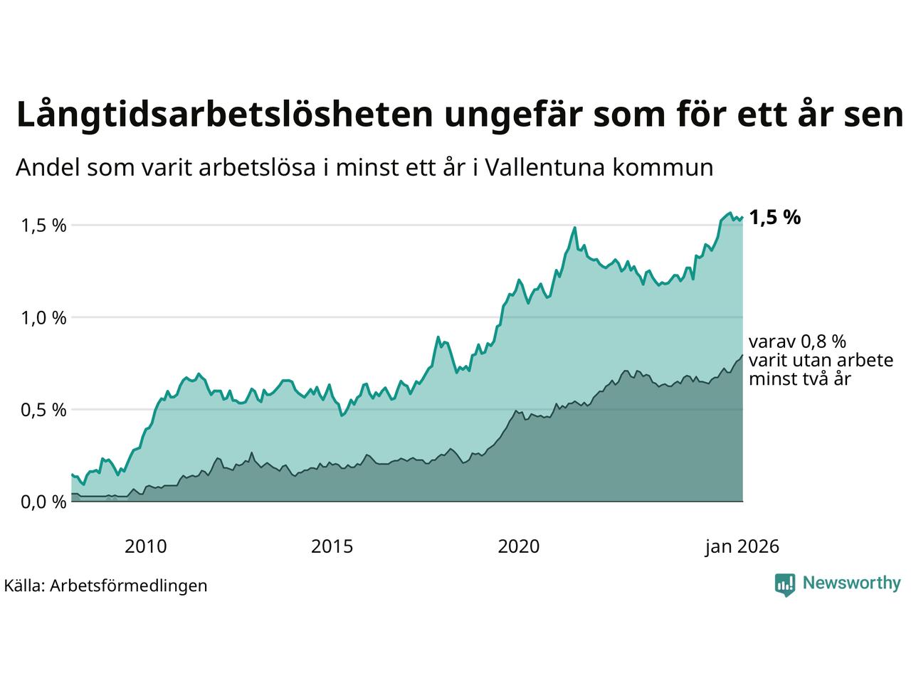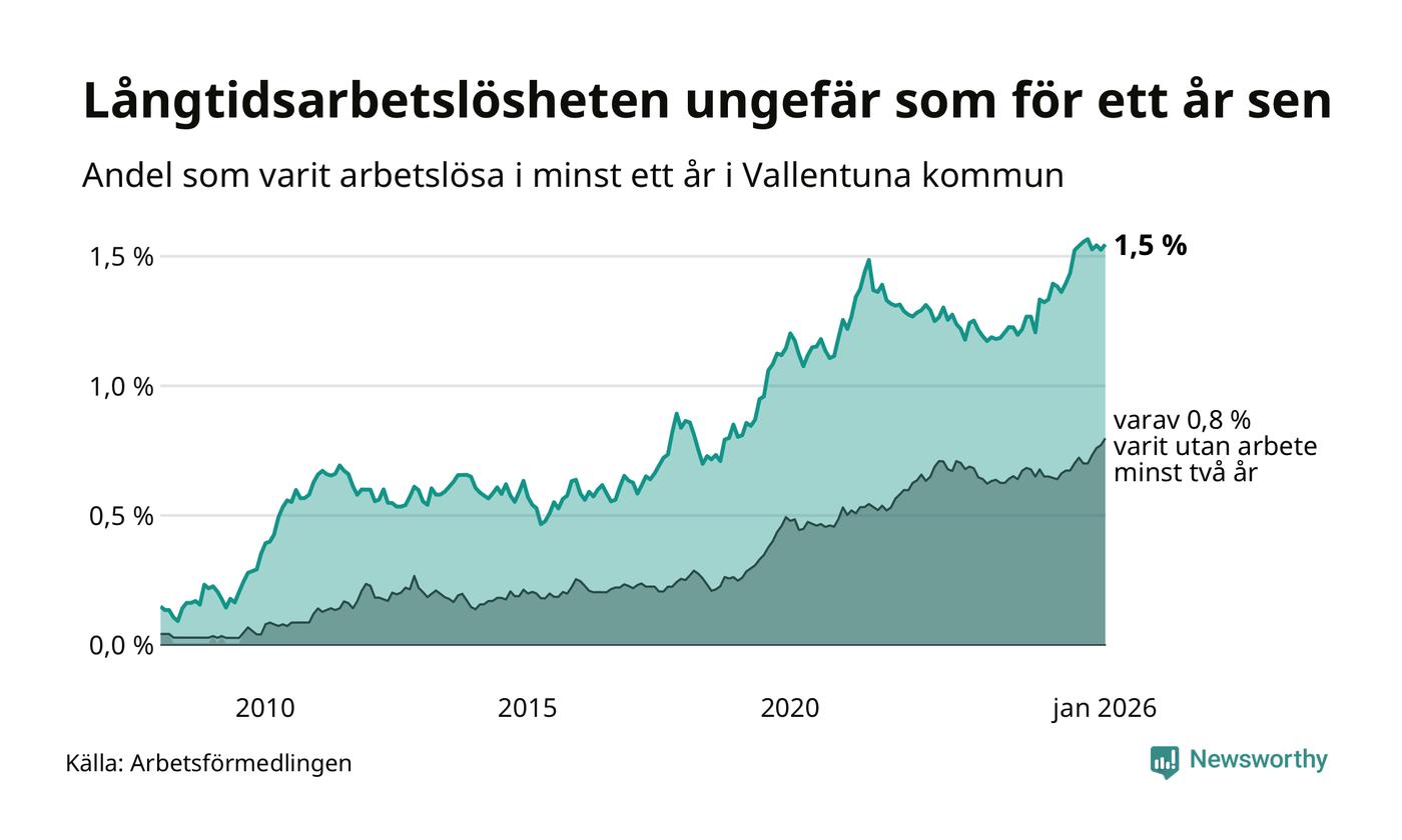 I januari hade 283 Vallentunabor varit arbetslösa i minst ett år, vilket är sex fler än månaden innan. 283 personer motsvarar 1,5 procent av arbetskraften i kommunen – andelen långtidsarbetslösa är ungefär på samma nivå som för ett år sedan.