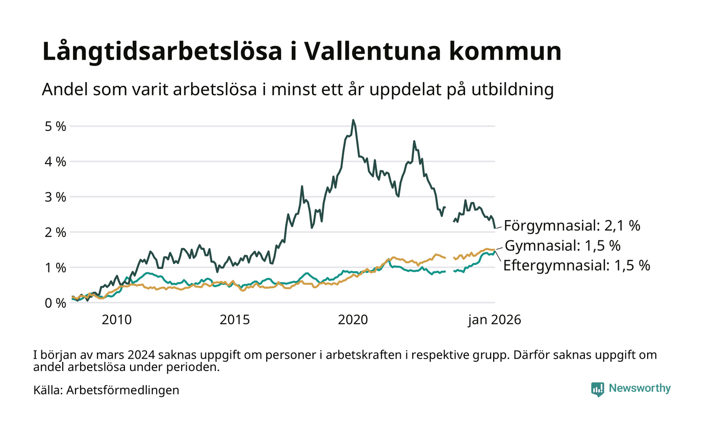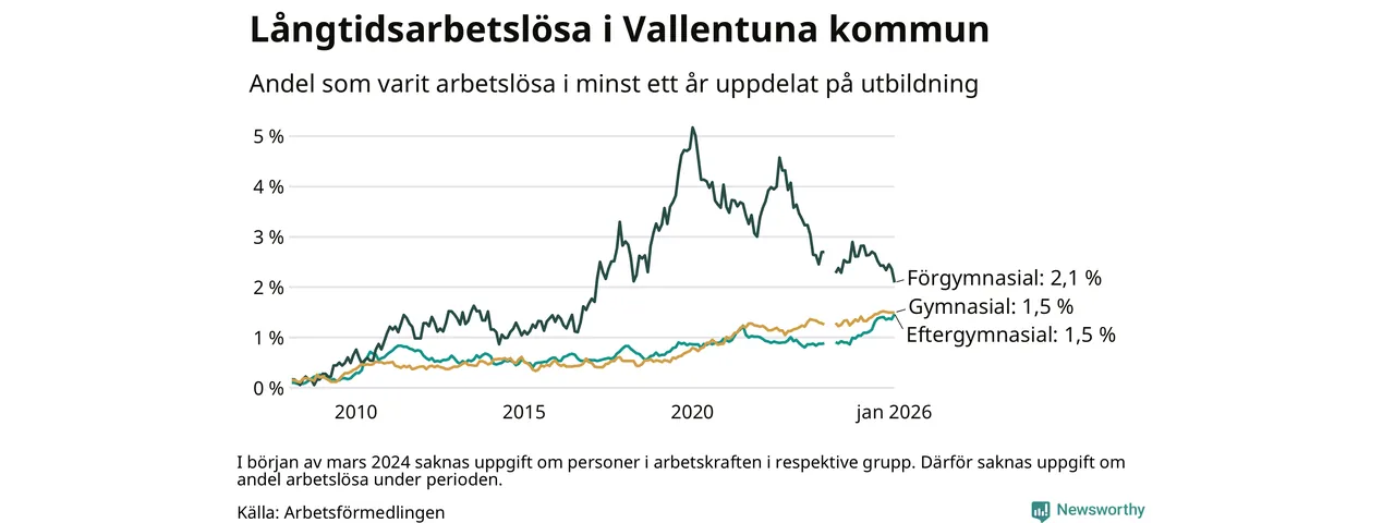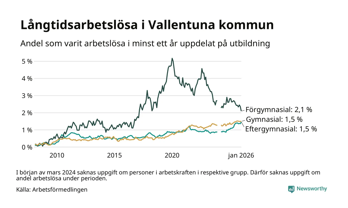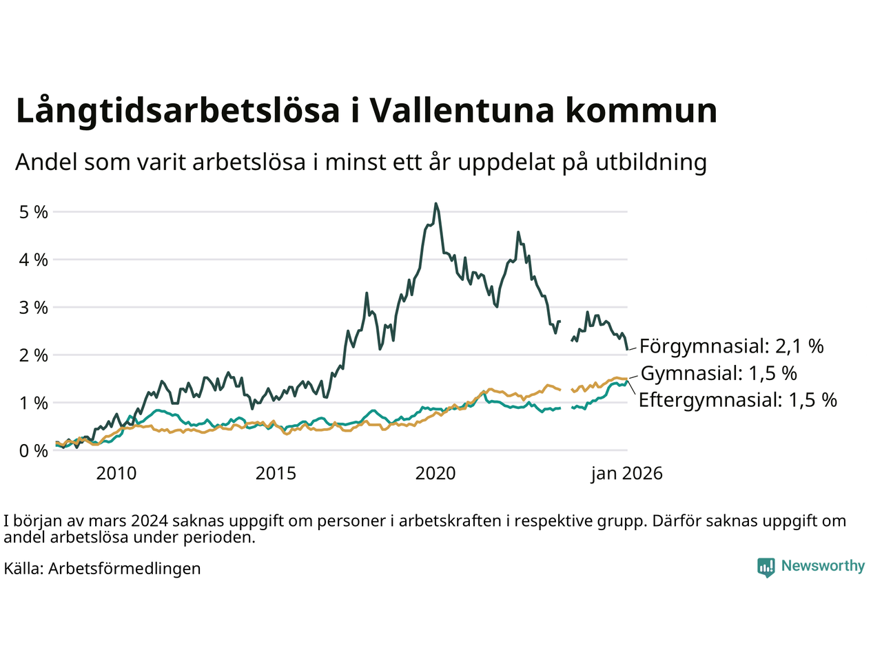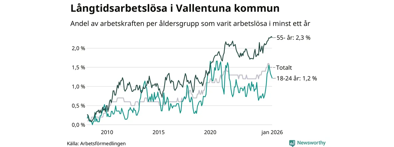 I januari hade 283 Vallentunabor varit arbetslösa i minst ett år, vilket är sex fler än månaden innan. 283 personer motsvarar 1,5 procent av arbetskraften i kommunen – andelen långtidsarbetslösa är ungefär på samma nivå som för ett år sedan.