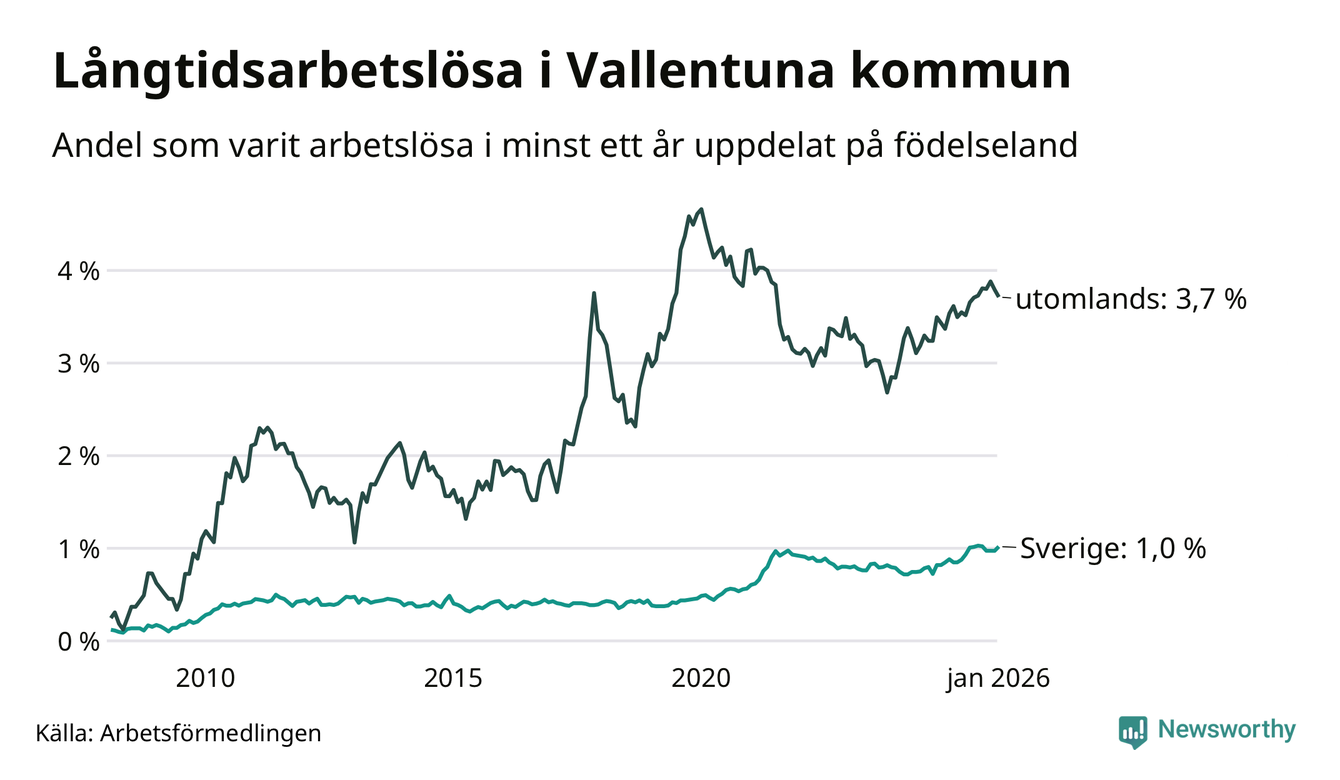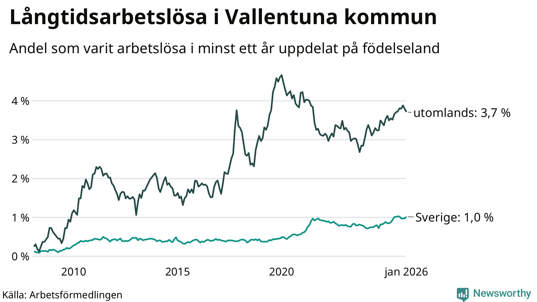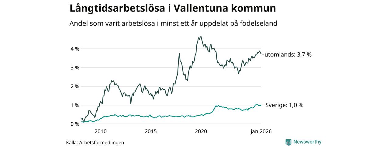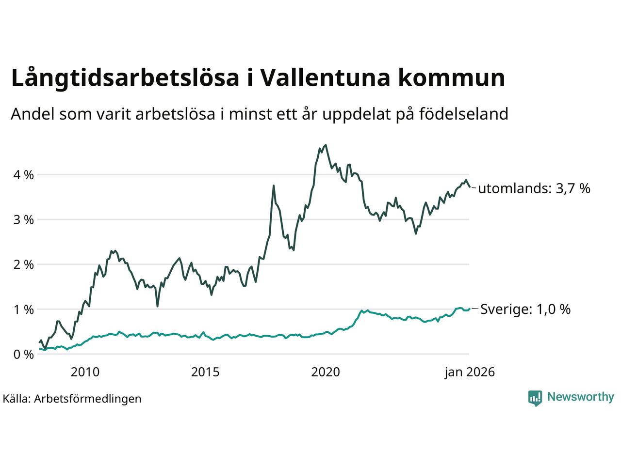 150 av de långtidsarbetslösa i Vallentuna är födda i Sverige, medan 133 är födda utomlands. Det innebär att långtidsarbetslösheten bland Sverigefödda är 1,0 procent, medan den är fyra gånger så hög – 3,7 procent – bland födda utomlands. Även i riket som helhet är arbetslösheten högre bland utrikesfödda.