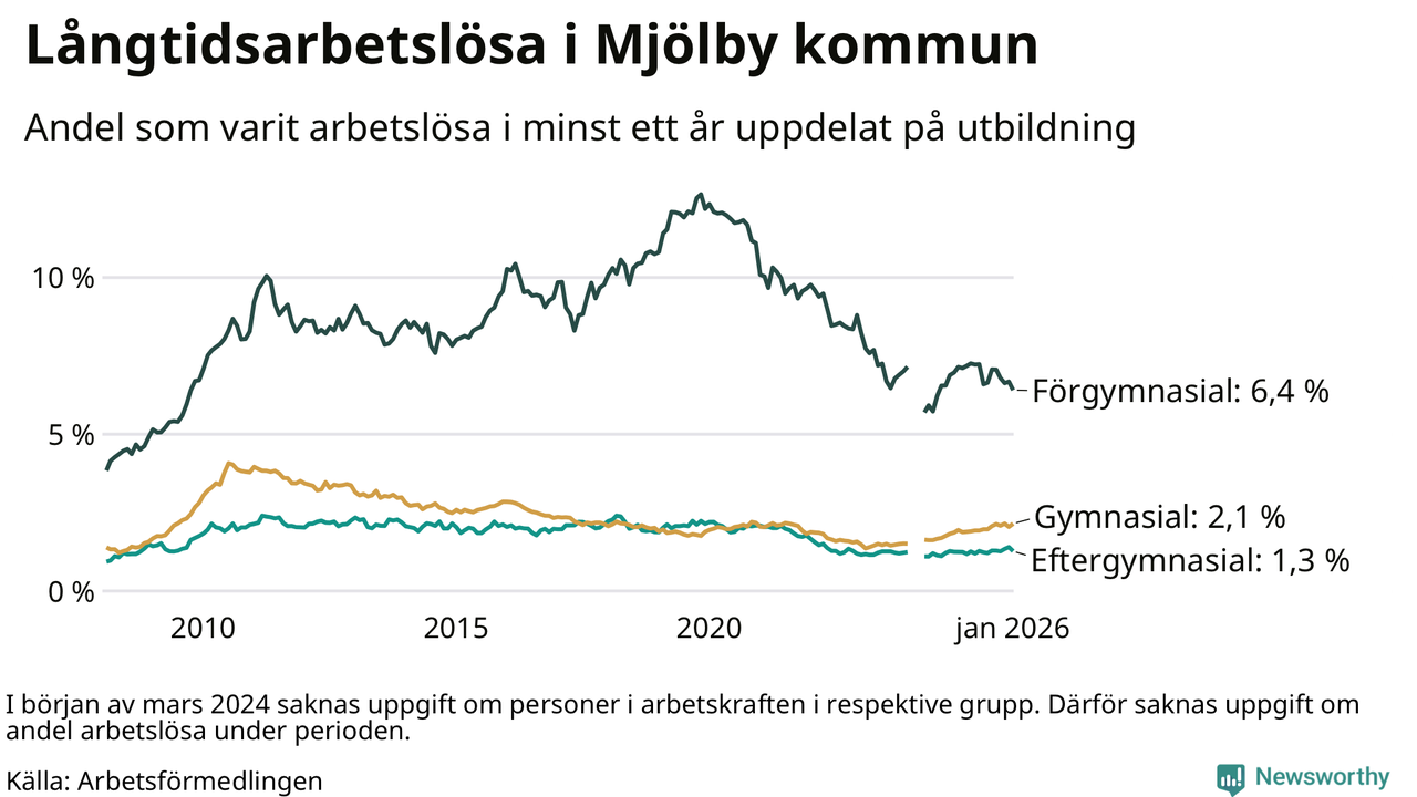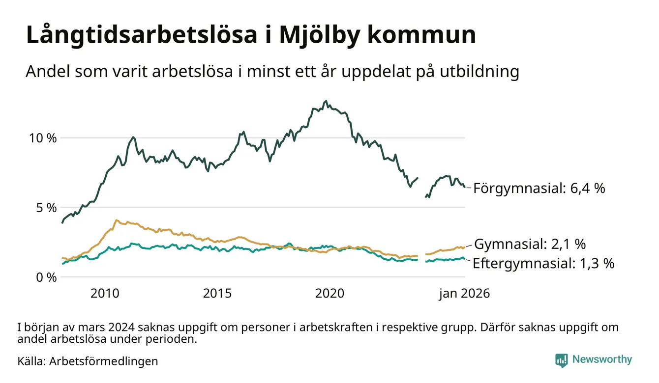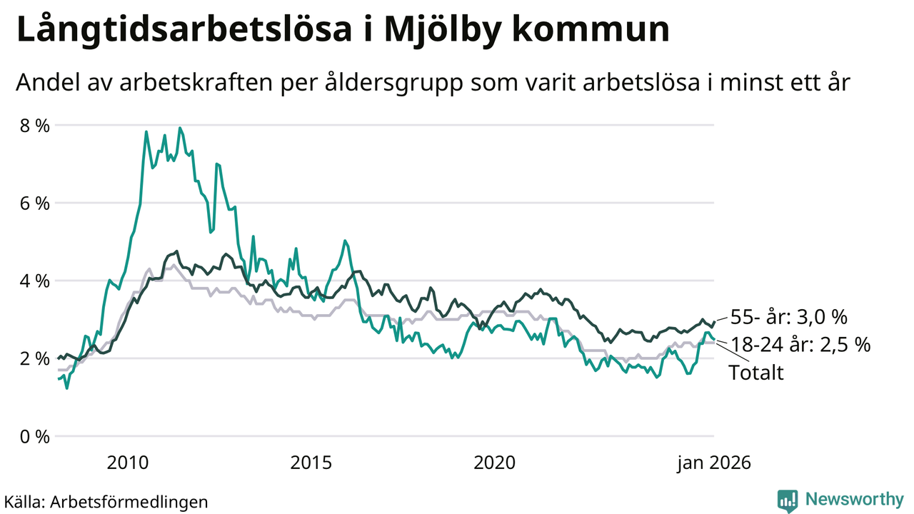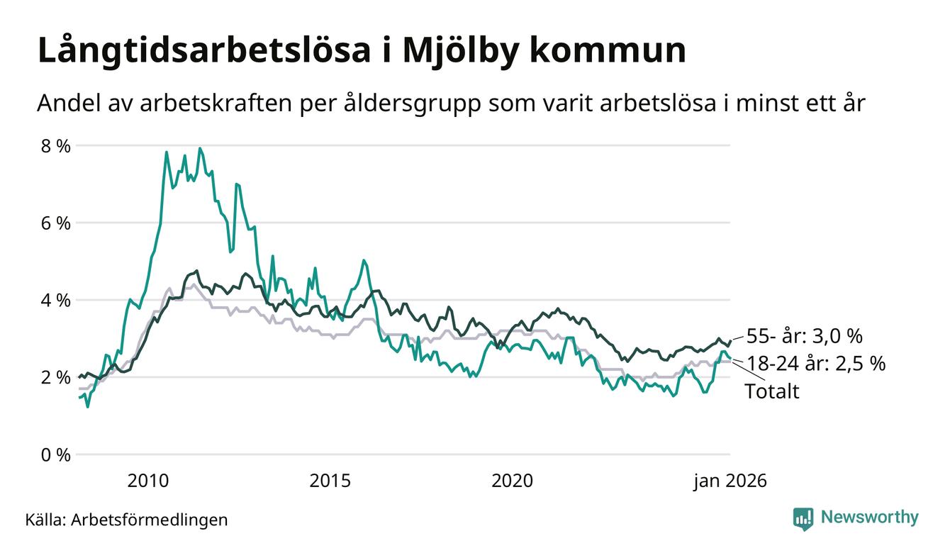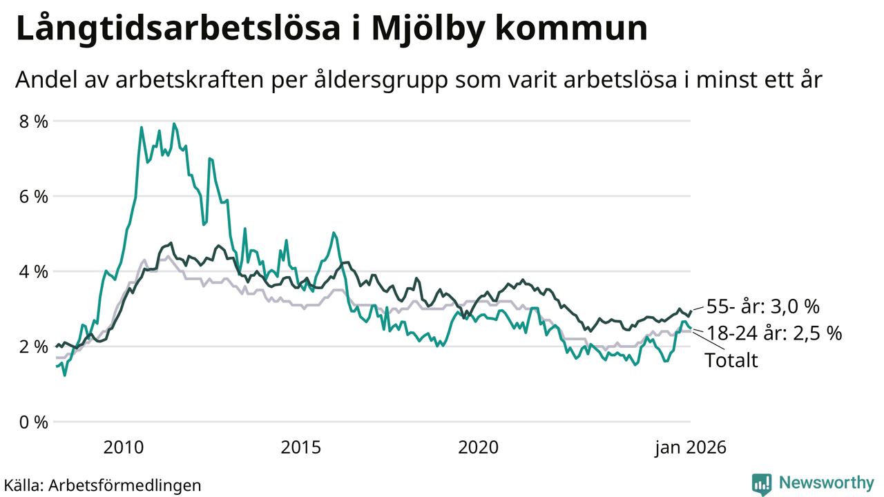 Av de 349 personerna som varit arbetslösa i mer än ett år i Mjölby kommun är 90 personer mellan 55 och 661 år och 36 är mellan 18 och 24 år. För den äldre gruppen är andelen arbetslösa 3,0 procent medan den i den yngre gruppen är 2,5 procent. Även i riket som helhet är långtidsarbetslösheten högre i gruppen äldre.