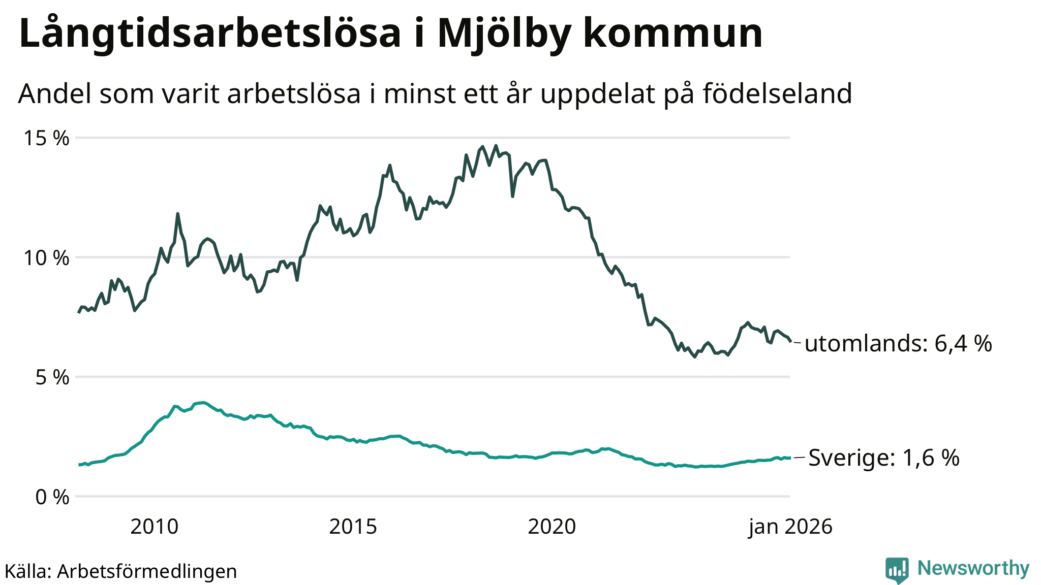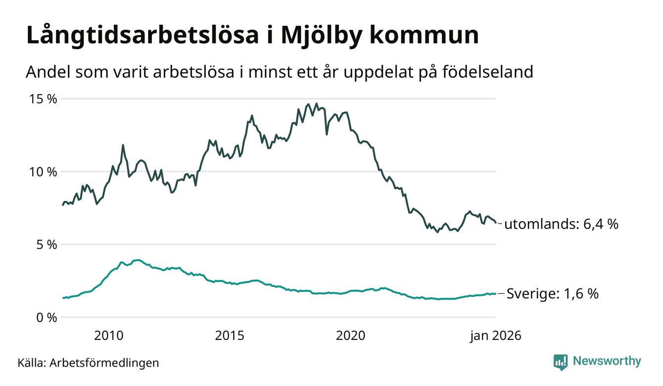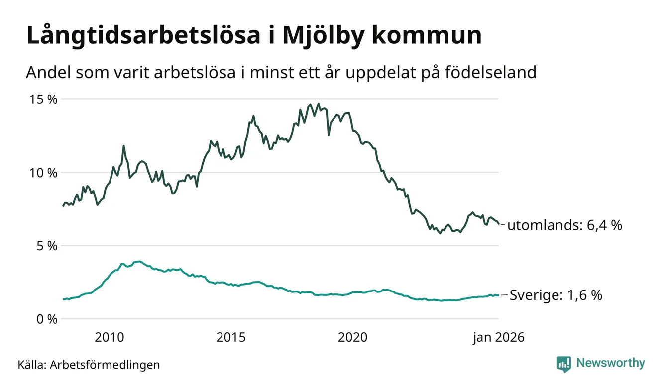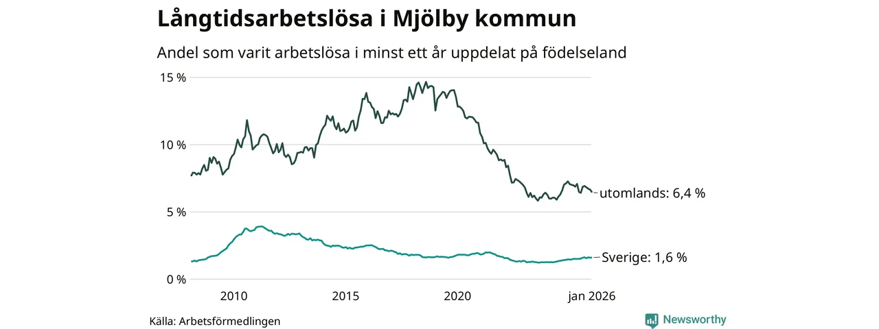 196 av de långtidsarbetslösa i Mjölby är födda i Sverige, medan 153 är födda utomlands. Det innebär att långtidsarbetslösheten bland Sverigefödda är 1,6 procent, medan den är fyra gånger så hög – 6,4 procent – bland födda utomlands. Även i riket som helhet är arbetslösheten högre bland utrikesfödda.