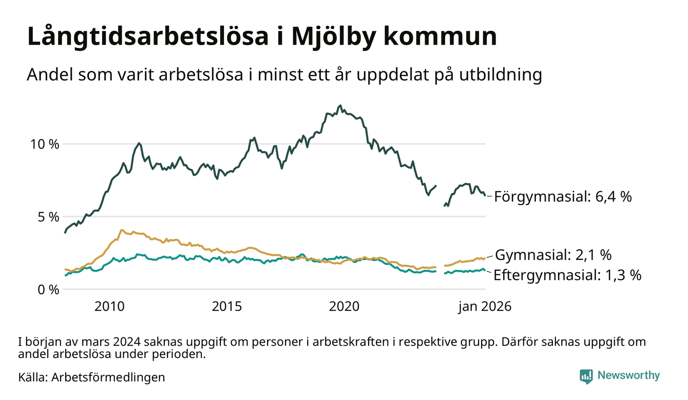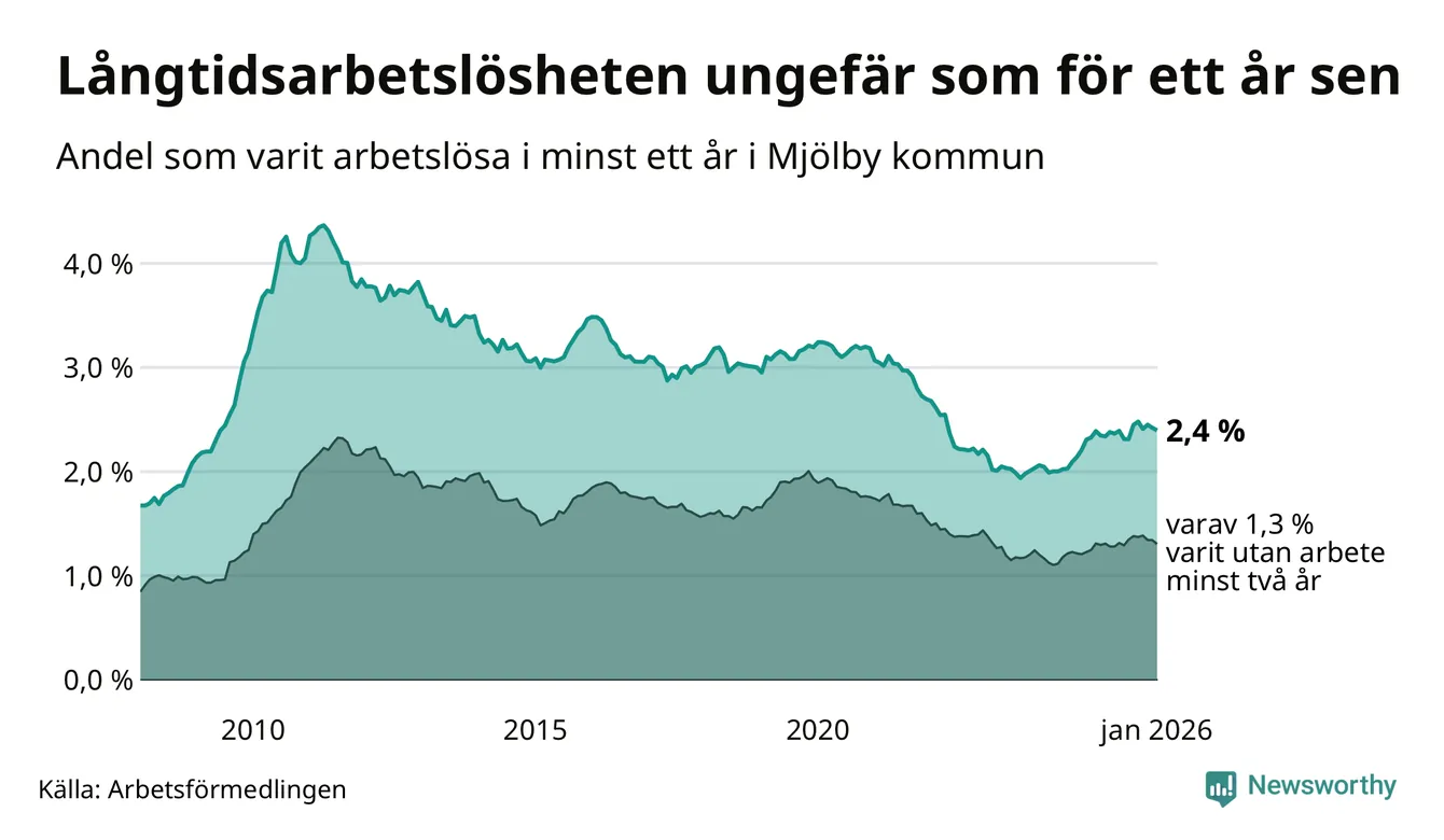 I januari hade 349 Mjölbybor varit arbetslösa i minst ett år, vilket är en färre än månaden innan. 349 personer motsvarar 2,4 procent av arbetskraften i kommunen – andelen långtidsarbetslösa är ungefär på samma nivå som för ett år sedan.