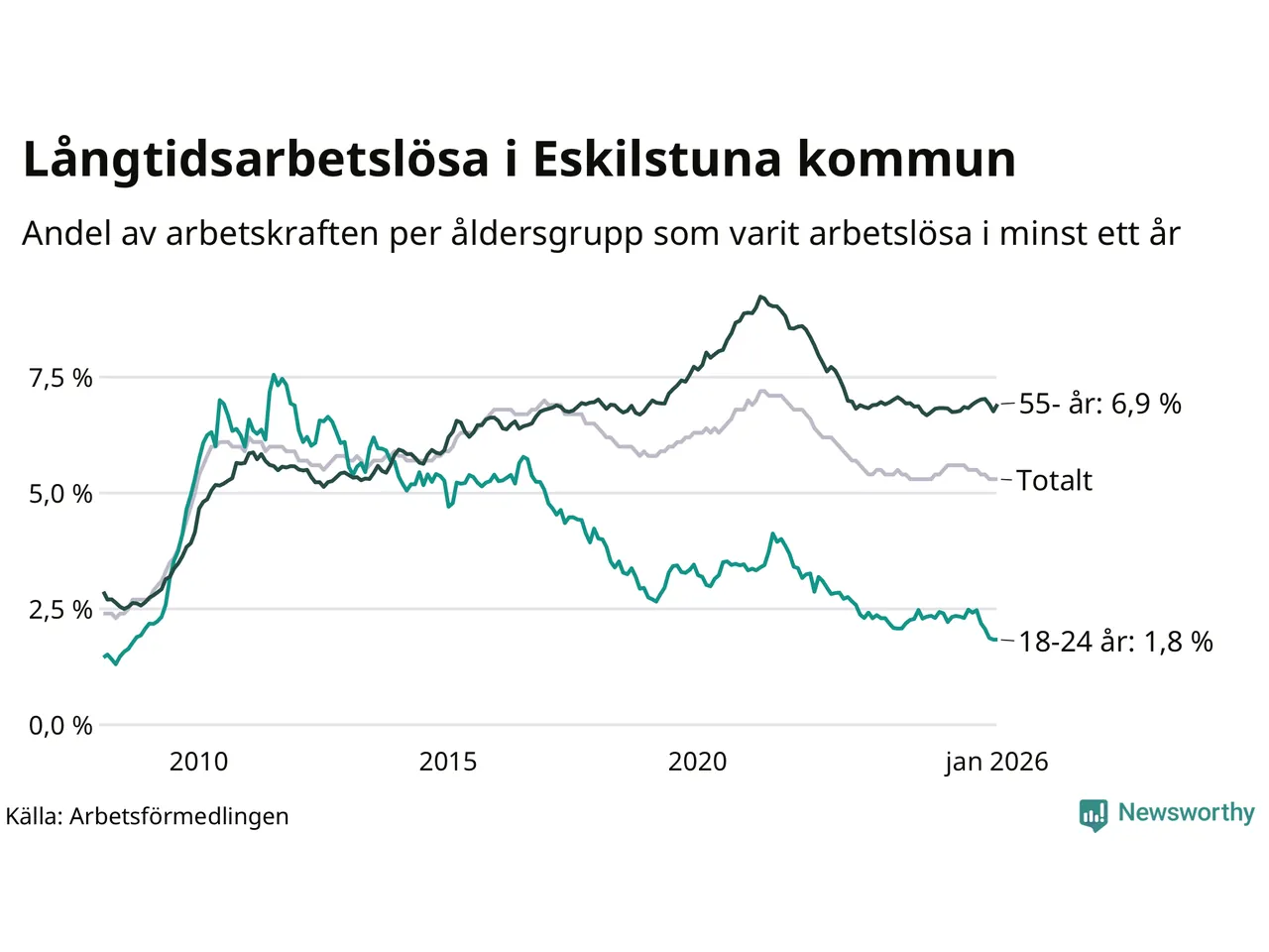 | Andel arbetslösa i minst två år | 3,4 % | 2,4 % | 1,6 % |