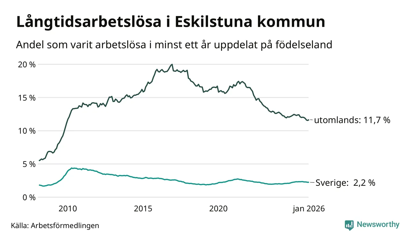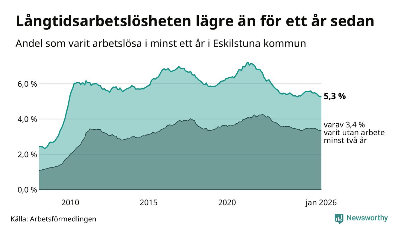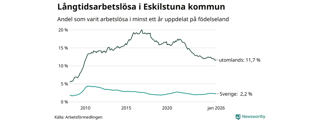 I januari hade 2 815 Eskilstunabor varit arbetslösa i minst ett år, vilket är 40 fler än månaden innan. Det är den första månaden sedan augusti 2025 som antalet arbetslösa ökar. 2 815 personer motsvarar 5,3 procent av arbetskraften i kommunen – andelen långtidsarbetslösa är 0,3 procentenheter lägre än samma månad för ett år sedan. Eskilstuna tillhör de kommuner som har högst andel långtidsarbetslösa i hela landet just nu.