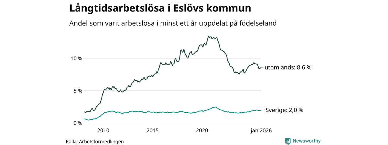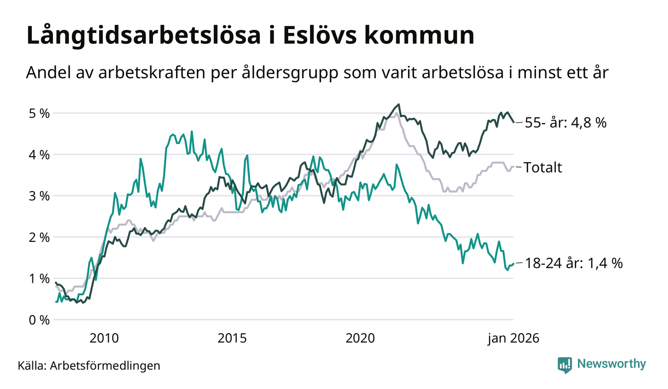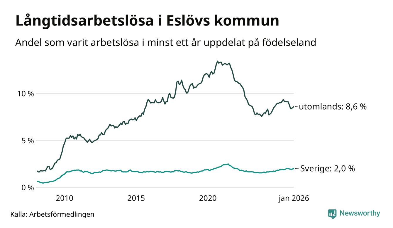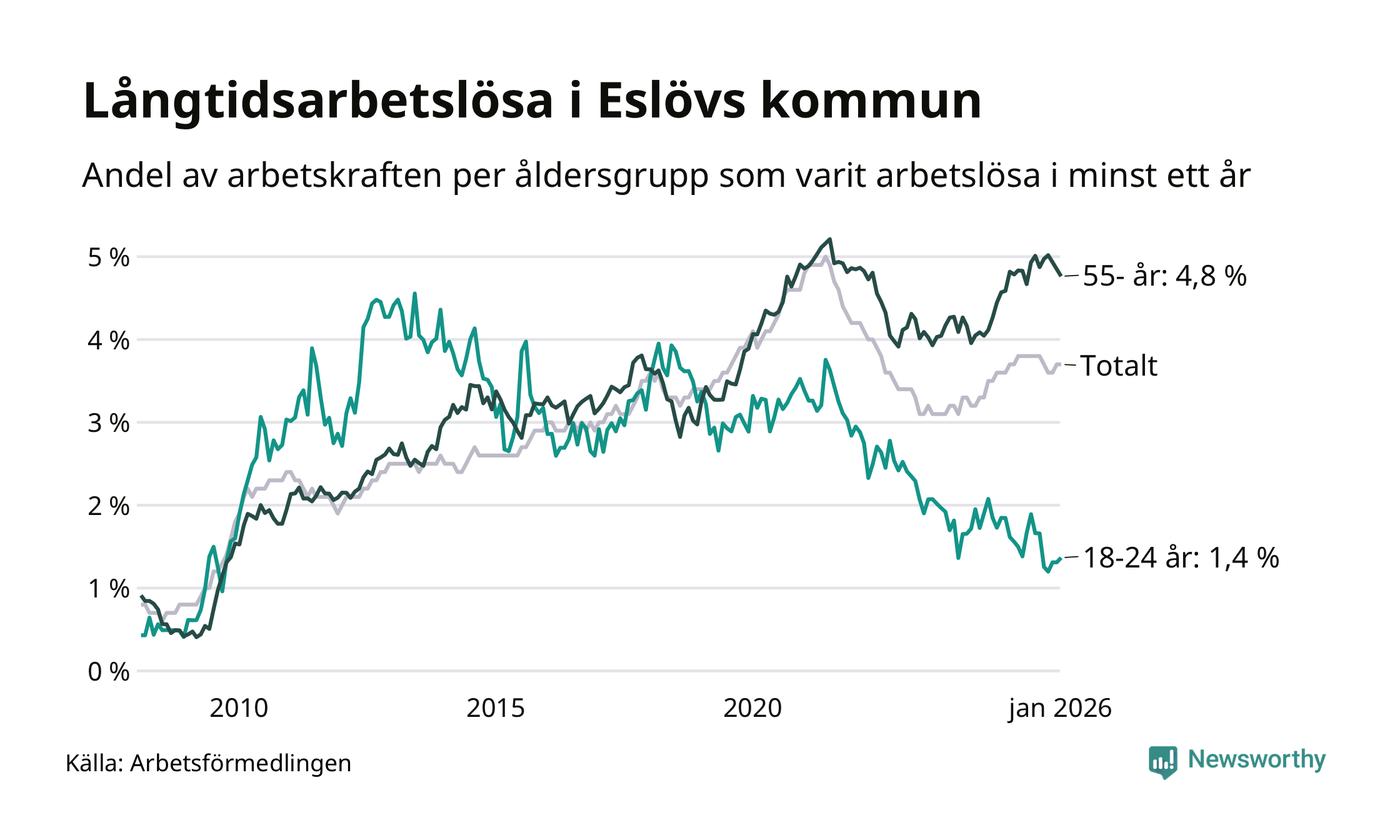I januari hade 648 Eslövsbor varit arbetslösa i minst ett år, vilket är 14 fler än månaden innan. 648 personer motsvarar 3,7 procent av arbetskraften i kommunen – andelen långtidsarbetslösa är ungefär på samma nivå som för ett år sedan.
