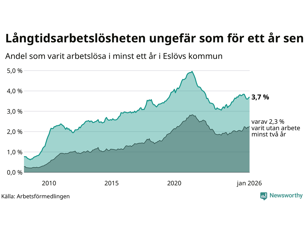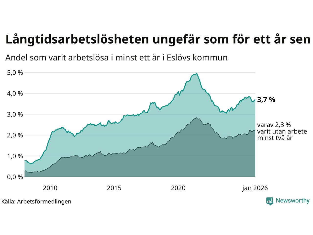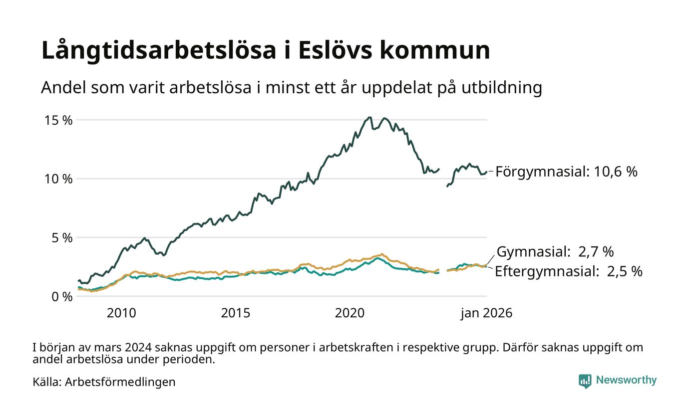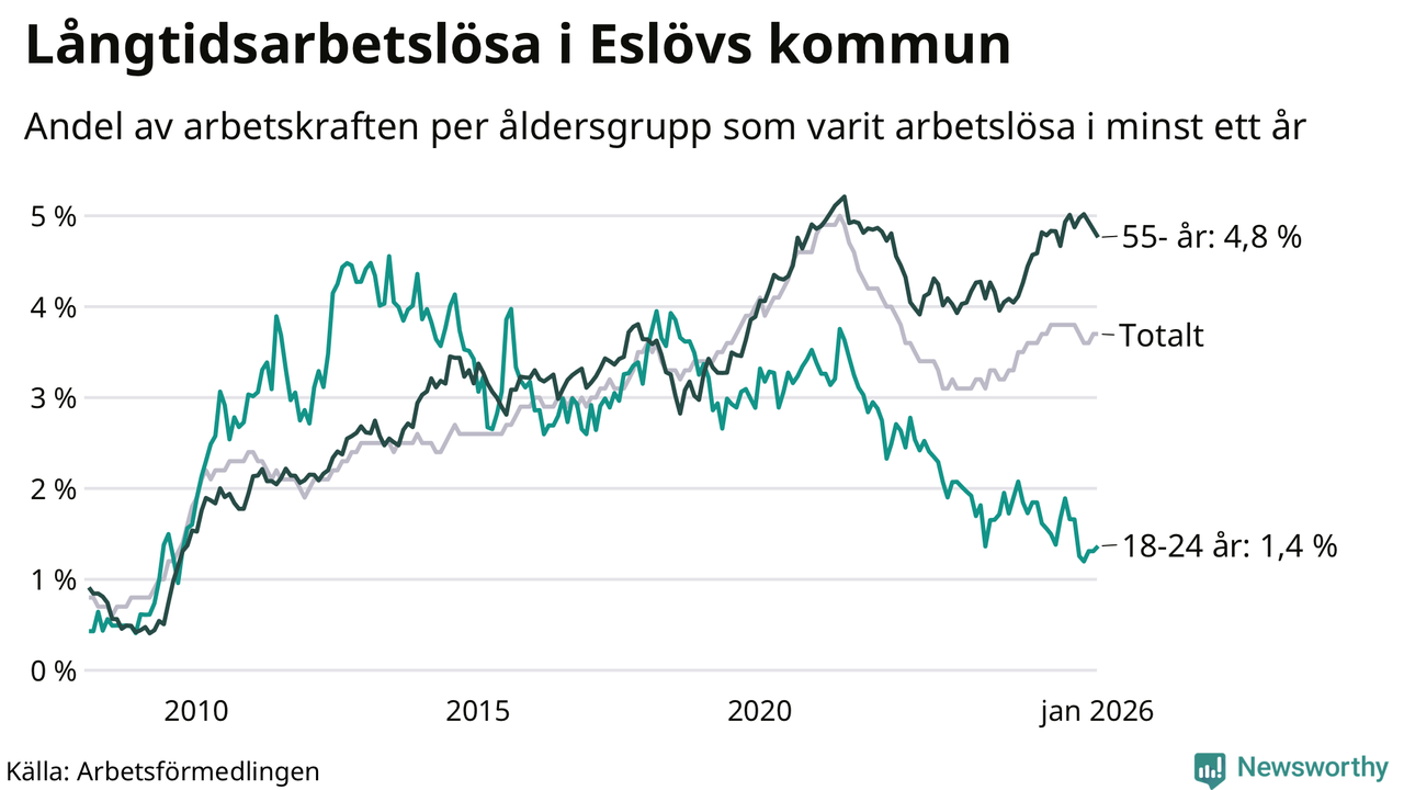 I januari hade 648 Eslövsbor varit arbetslösa i minst ett år, vilket är 14 fler än månaden innan. 648 personer motsvarar 3,7 procent av arbetskraften i kommunen – andelen långtidsarbetslösa är ungefär på samma nivå som för ett år sedan.
