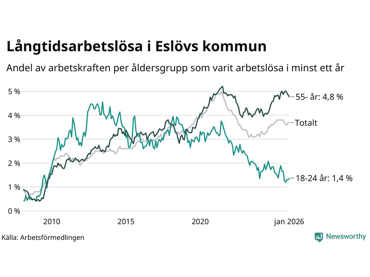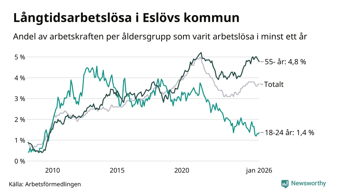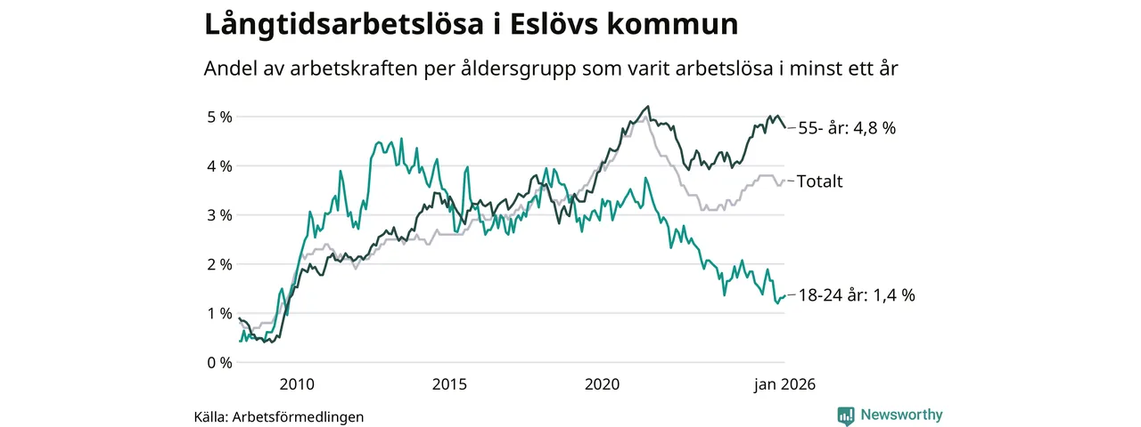 Av de 648 personerna som varit arbetslösa i mer än ett år i Eslövs kommun är 182 personer mellan 55 och 661 år och 24 är mellan 18 och 24 år. För den äldre gruppen är andelen arbetslösa 4,8 procent medan den i den yngre gruppen är 1,4 procent. Även i riket som helhet är långtidsarbetslösheten högre i gruppen äldre.