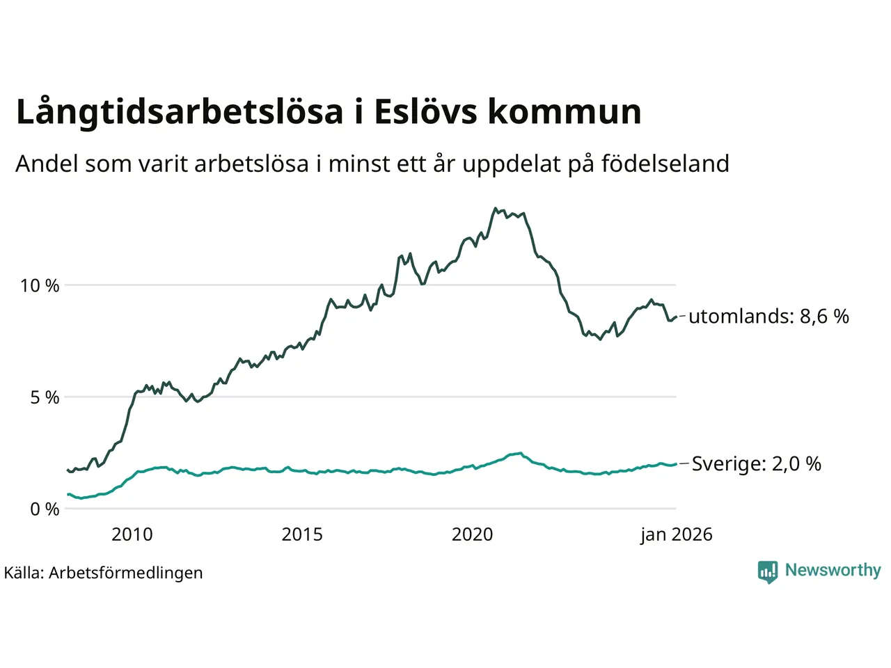 Graf: Andel arbetslösa uppdelat på födelseland i Eslöv