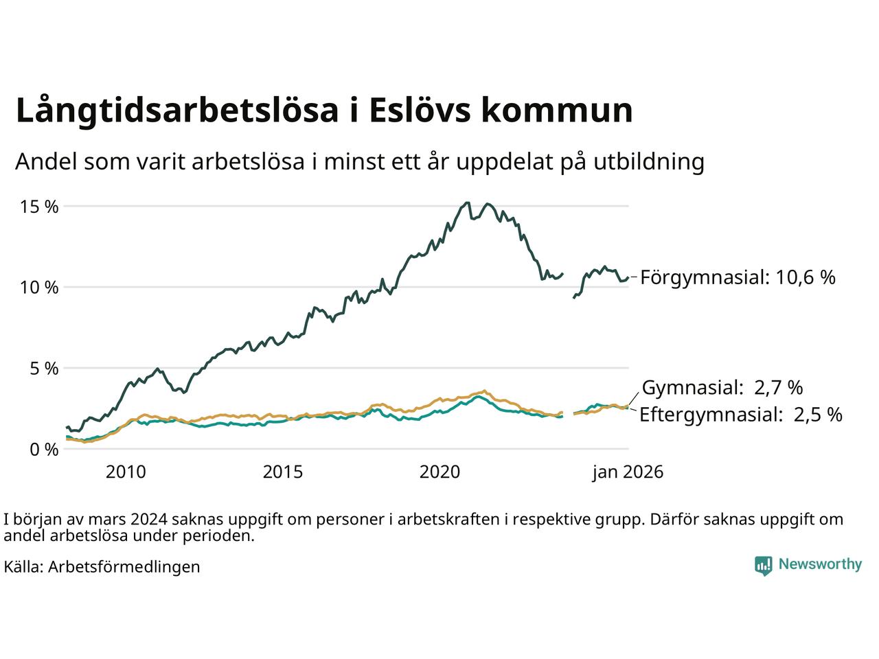 Graf: Andel arbetslösa i Eslöv som varit utan arbete i minst 12 månader