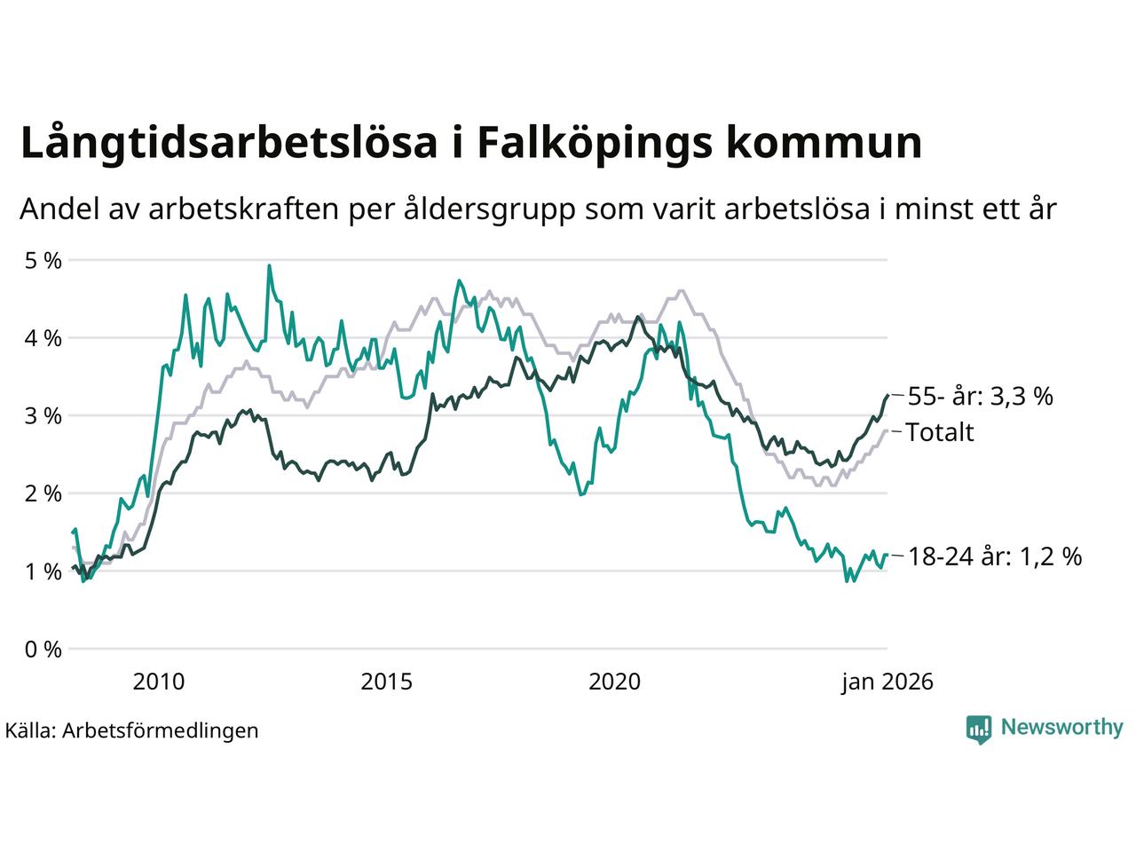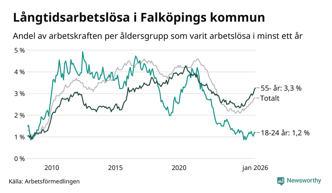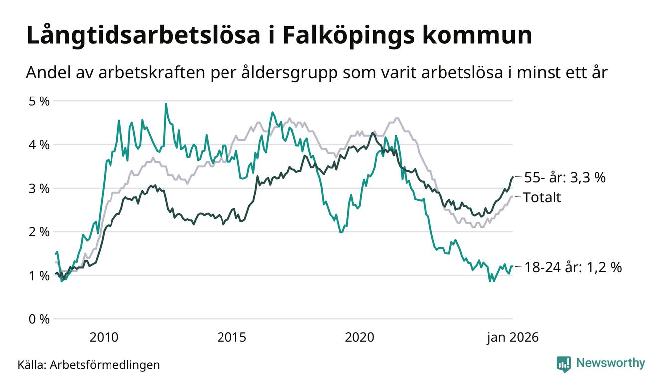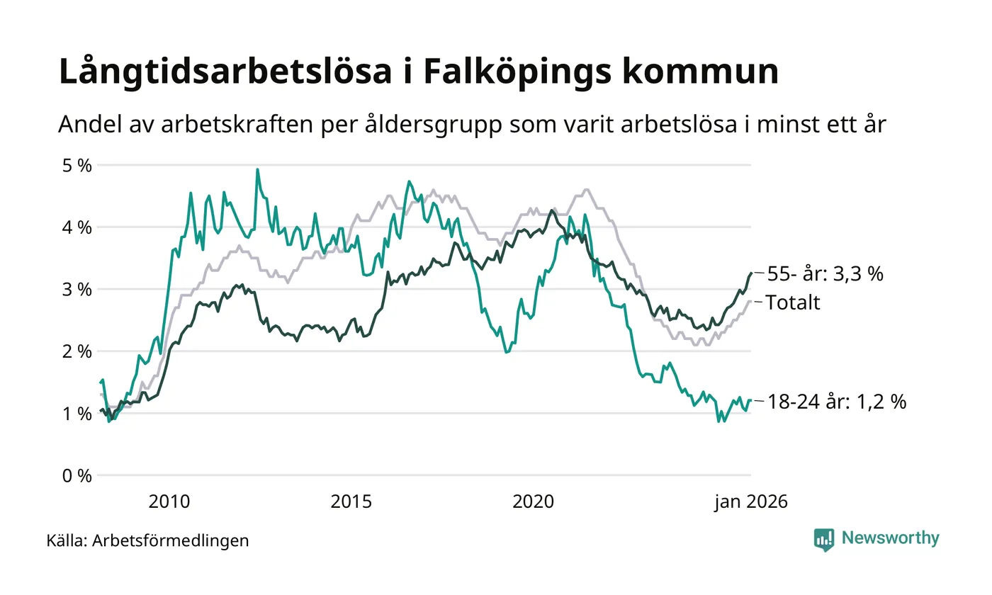 Av de 453 personerna som varit arbetslösa i mer än ett år i Falköpings kommun är 120 personer mellan 55 och 661 år och 22 är mellan 18 och 24 år. För den äldre gruppen är andelen arbetslösa 3,3 procent medan den i den yngre gruppen är 1,2 procent. Även i riket som helhet är långtidsarbetslösheten högre i gruppen äldre.