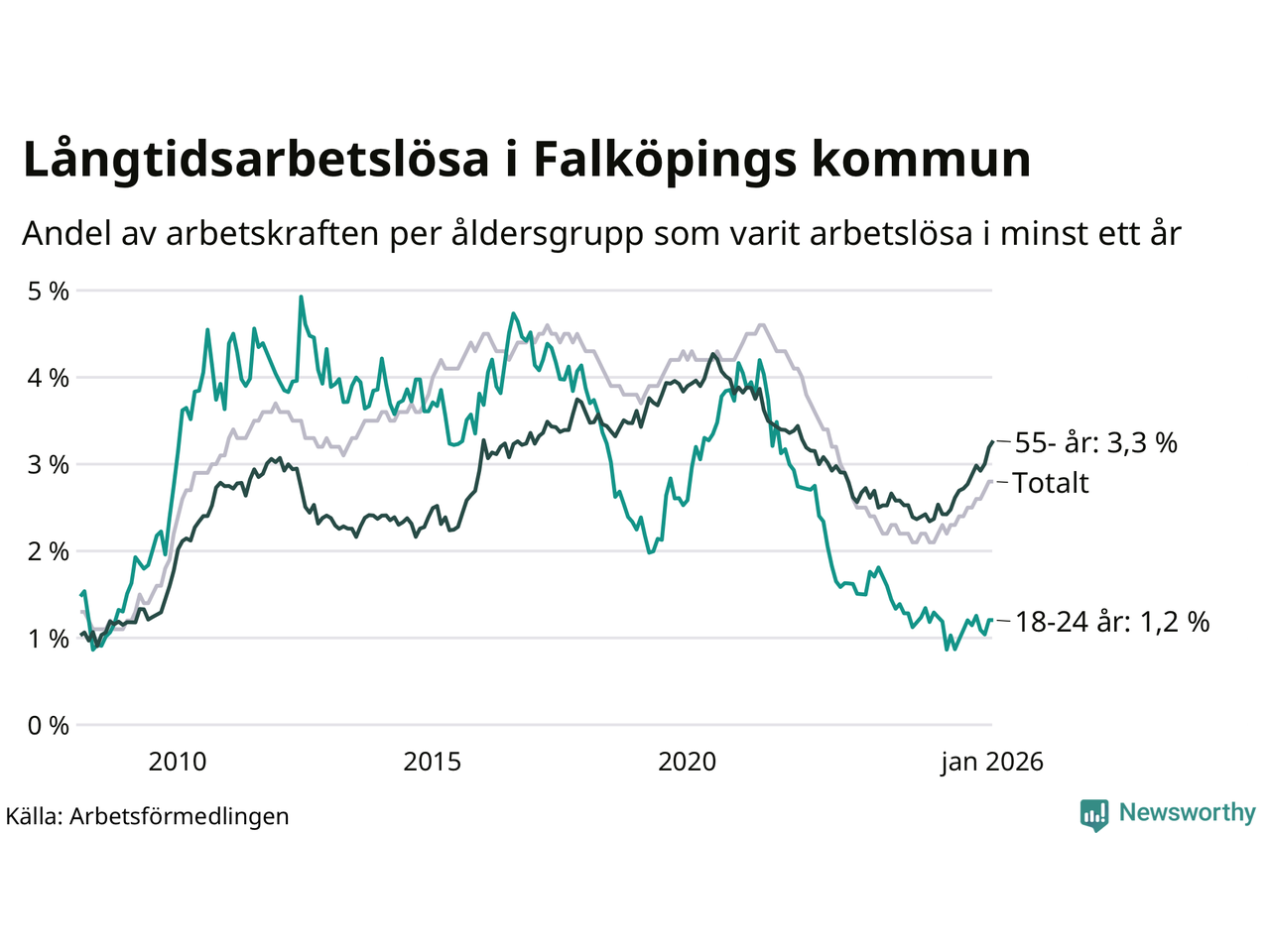 | Andel arbetslösa i minst två år | 1,2 % | 1,3 % | 1,6 % |