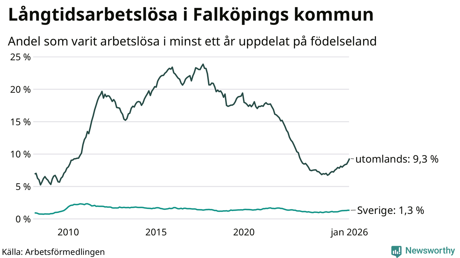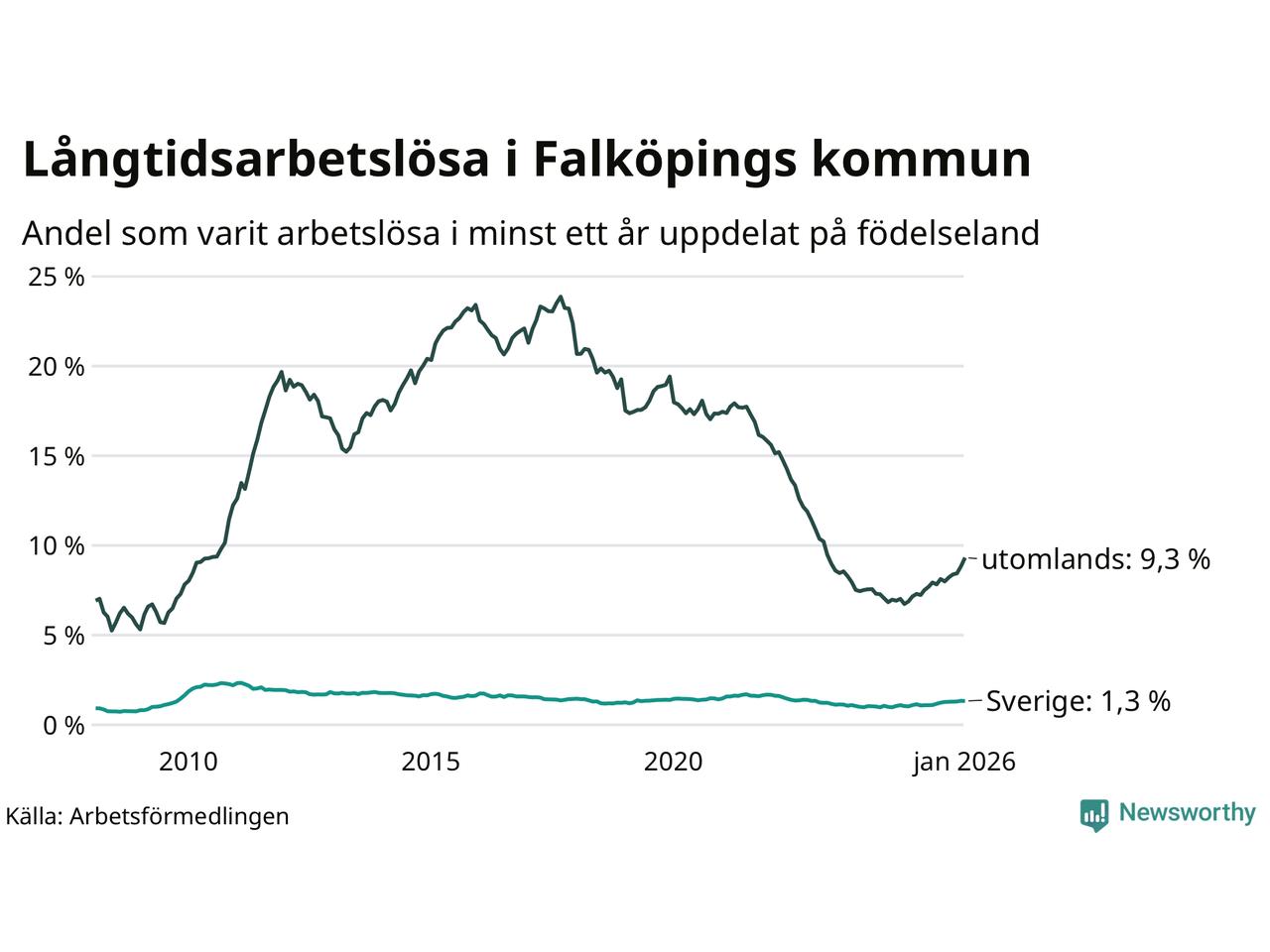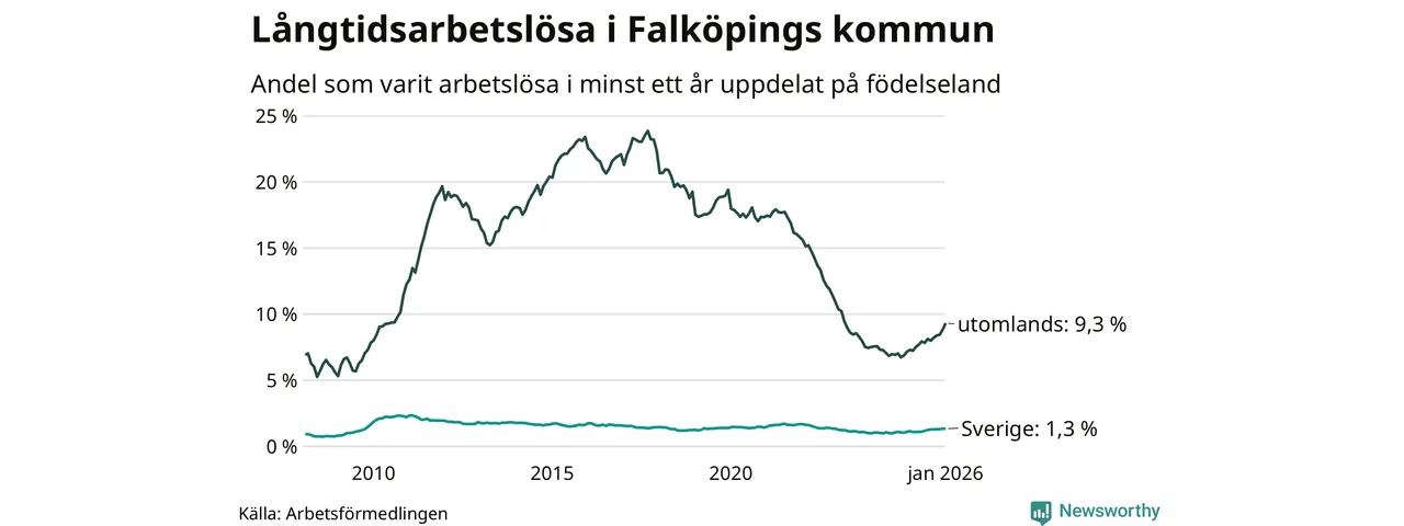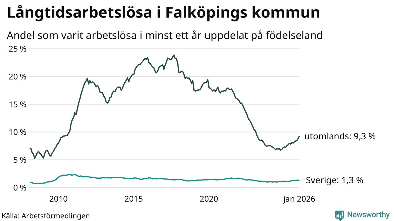171 av de långtidsarbetslösa i Falköping är födda i Sverige, medan 282 är födda utomlands. Det innebär att långtidsarbetslösheten bland Sverigefödda är 1,3 procent, medan den är sju gånger så hög – 9,3 procent – bland födda utomlands. Även i riket som helhet är arbetslösheten högre bland utrikesfödda.