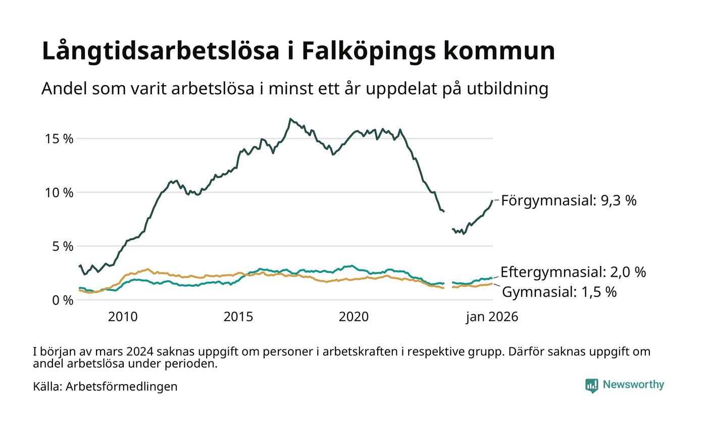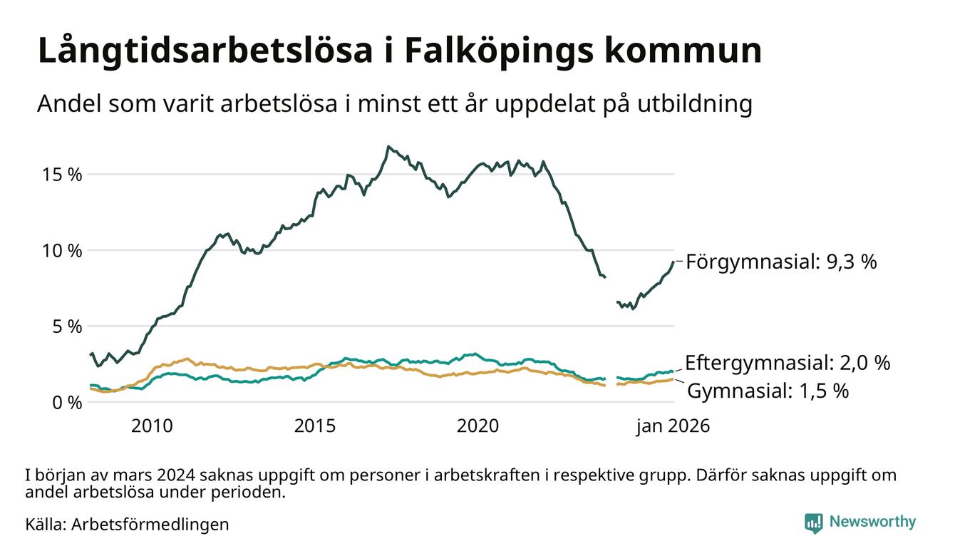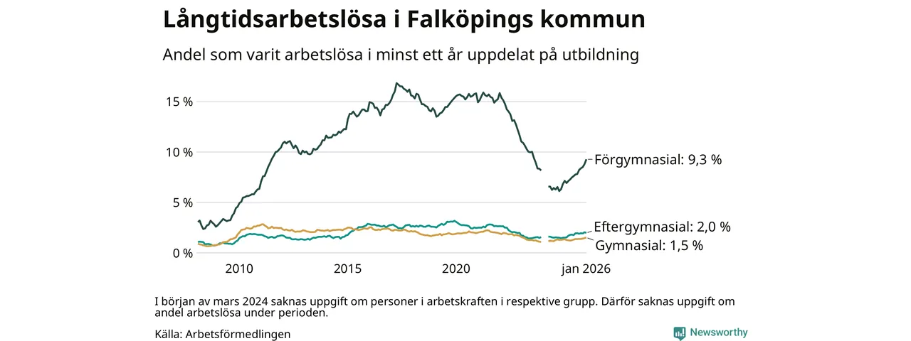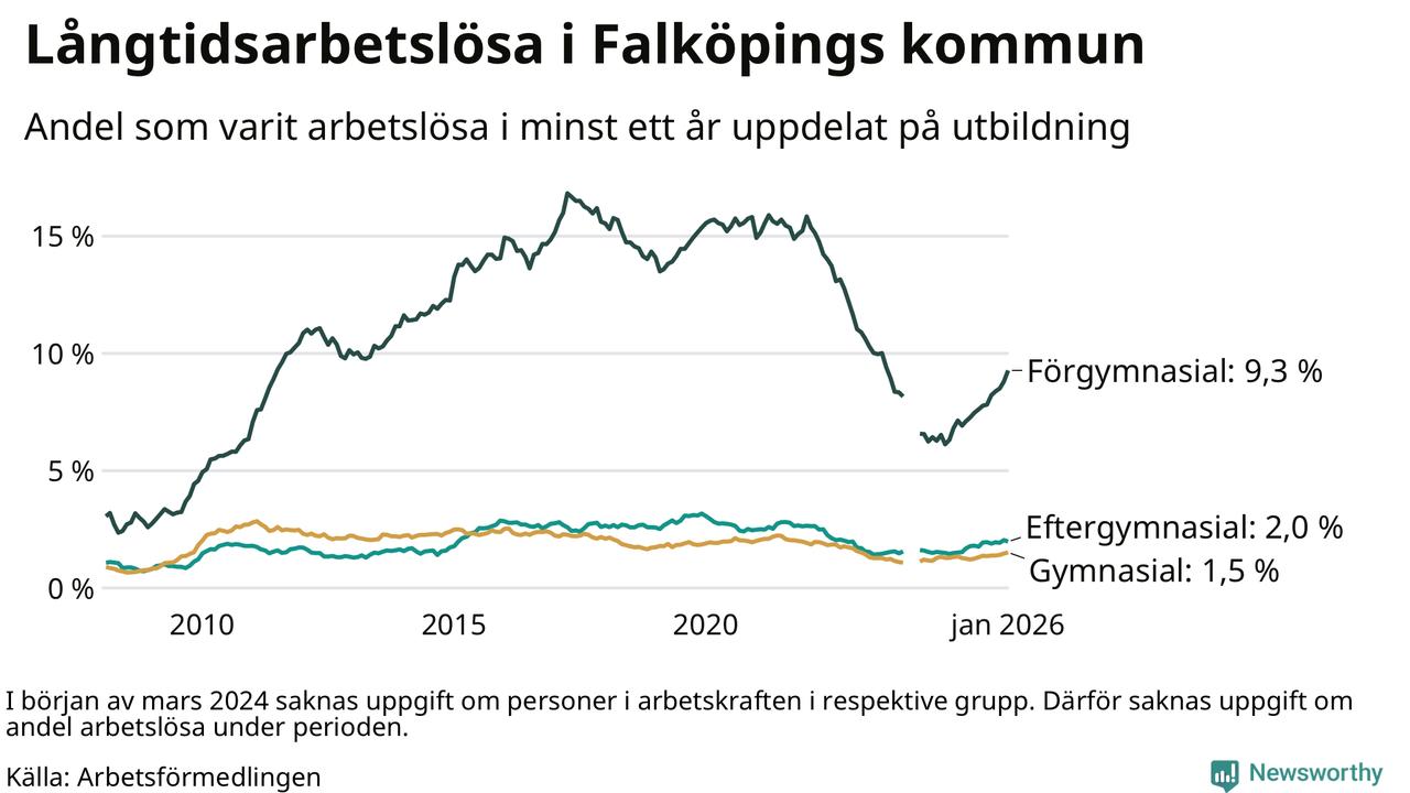 Inte sedan februari 2023 har andelen långtidsarbetslösa varit så hög i Falköping. Det visar Arbetsförmedlingens senaste månadsstatistik.