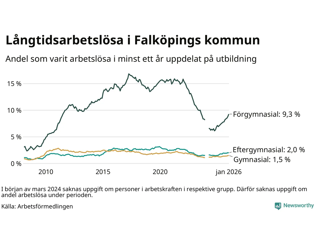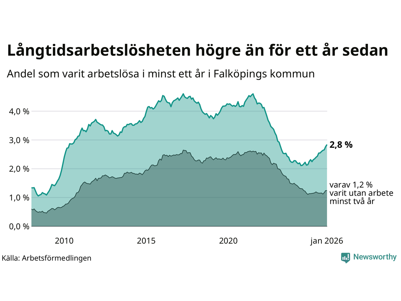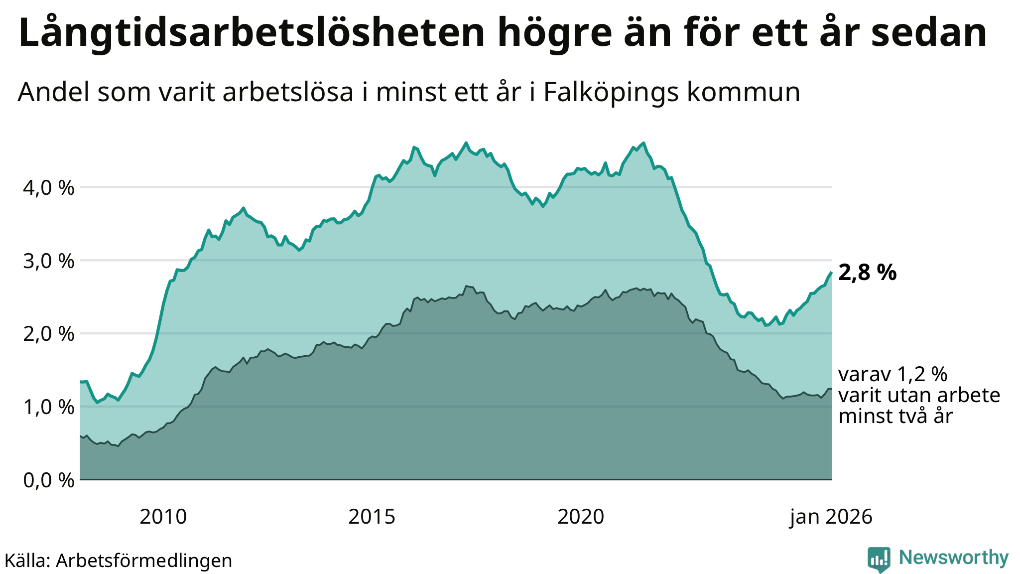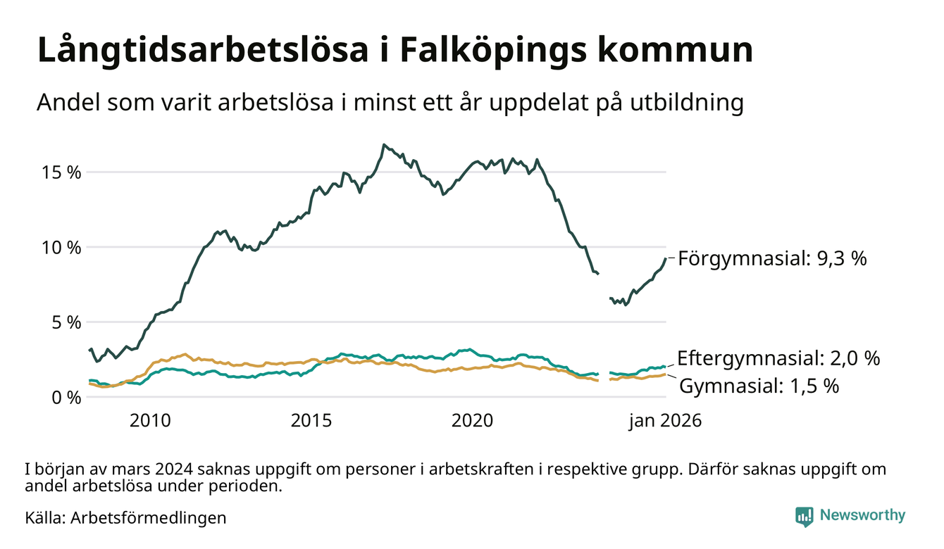 Inte sedan februari 2023 har andelen långtidsarbetslösa varit så hög i Falköping. Det visar Arbetsförmedlingens senaste månadsstatistik.