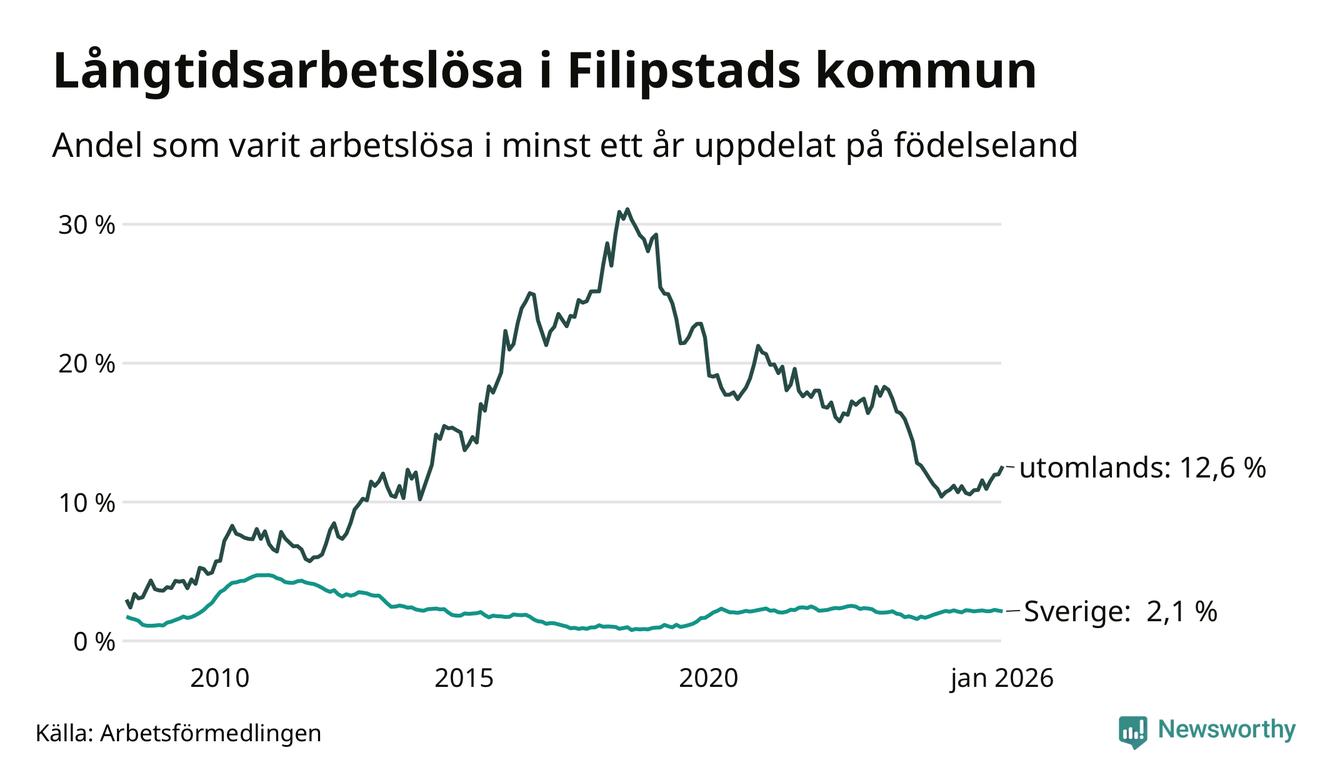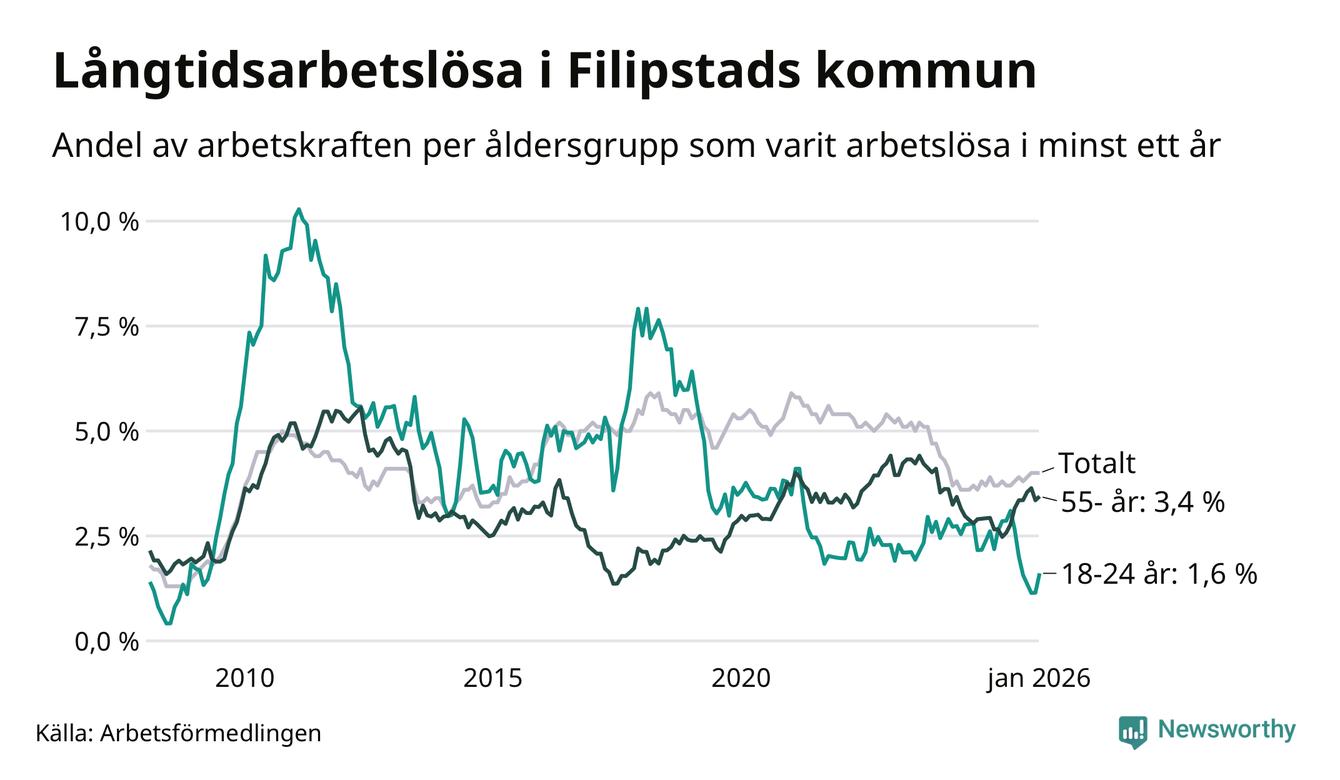 I januari hade 165 Filipstadsbor varit arbetslösa i minst ett år, vilket är fyra fler än månaden innan. 165 personer motsvarar 4,0 procent av arbetskraften i kommunen – andelen långtidsarbetslösa är ungefär på samma nivå som för ett år sedan.