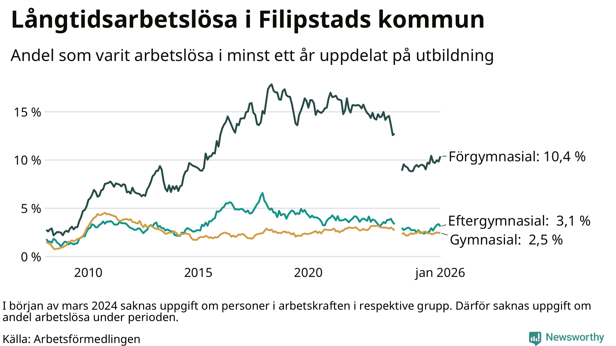 Graf: Andel arbetslösa i Filipstad som varit utan arbete i minst 12 månader