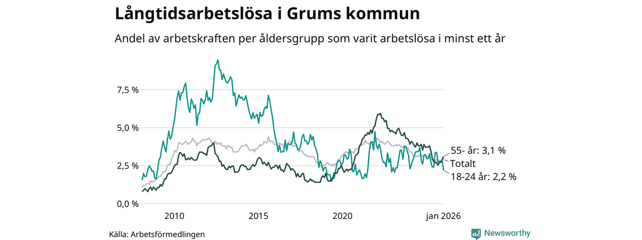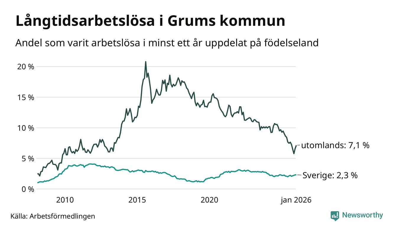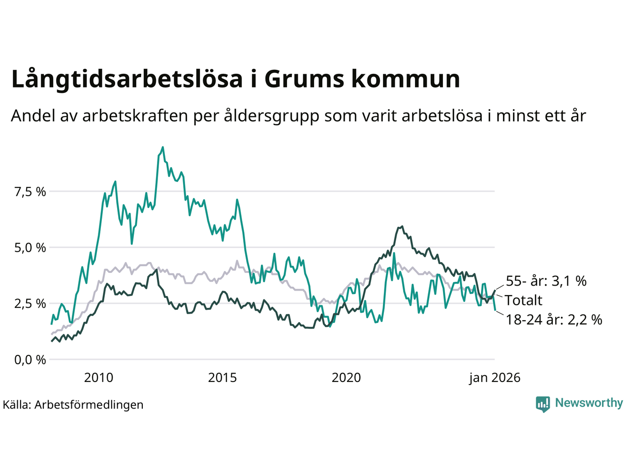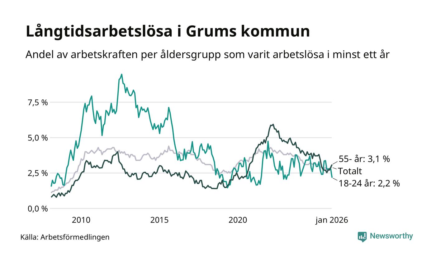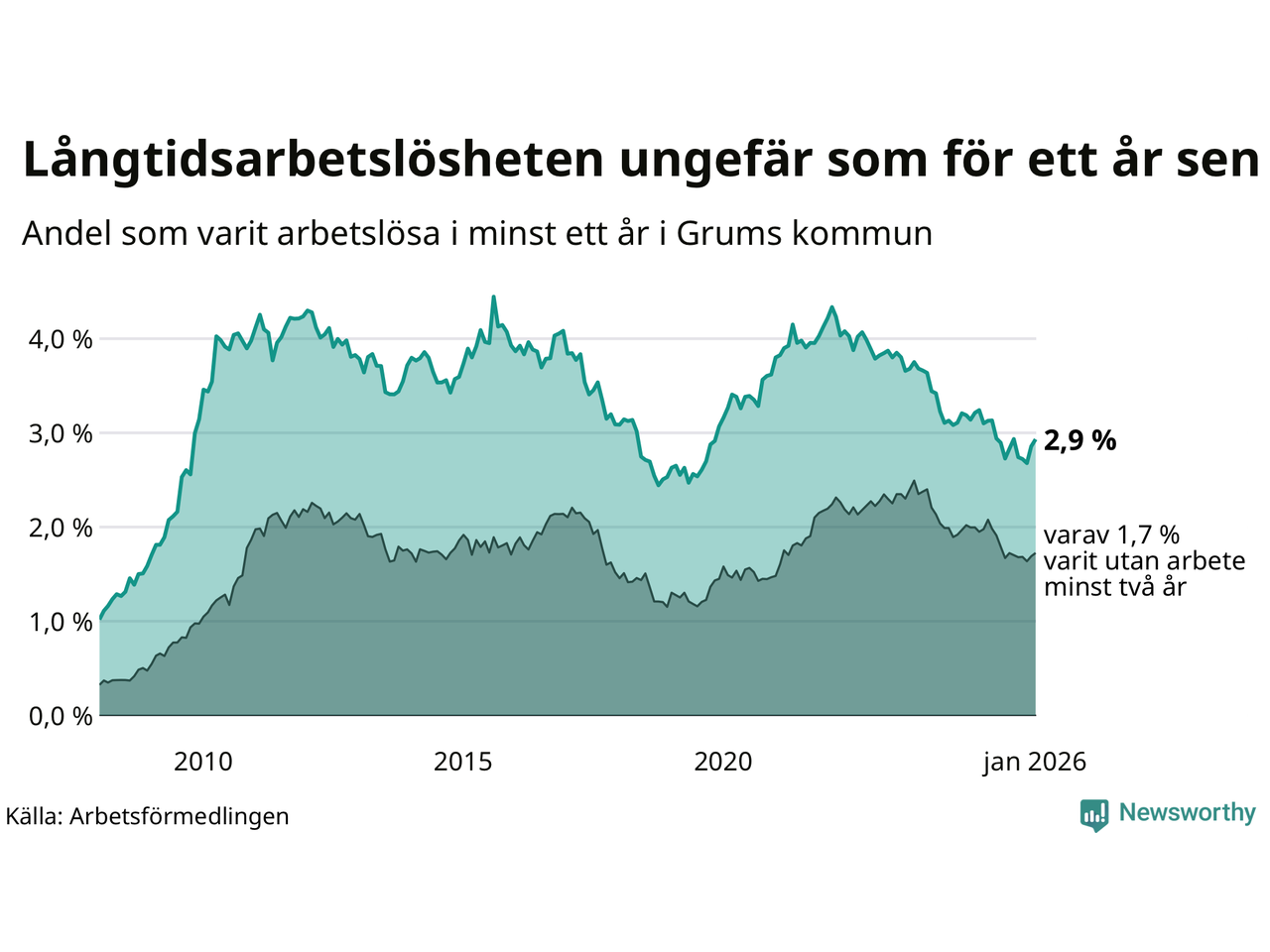 I januari hade 119 Grumsbor varit arbetslösa i minst ett år, vilket är fyra fler än månaden innan. 119 personer motsvarar 2,9 procent av arbetskraften i kommunen – andelen långtidsarbetslösa är ungefär på samma nivå som för ett år sedan.