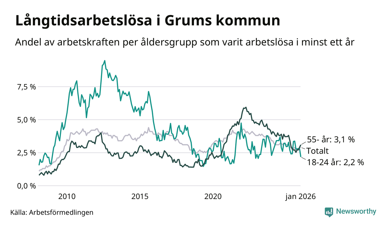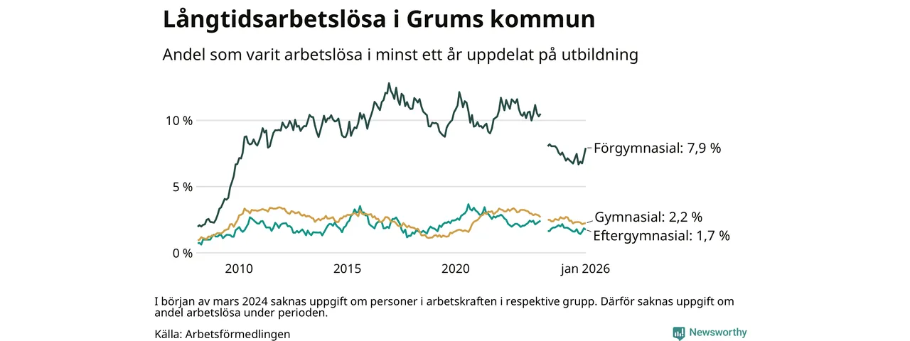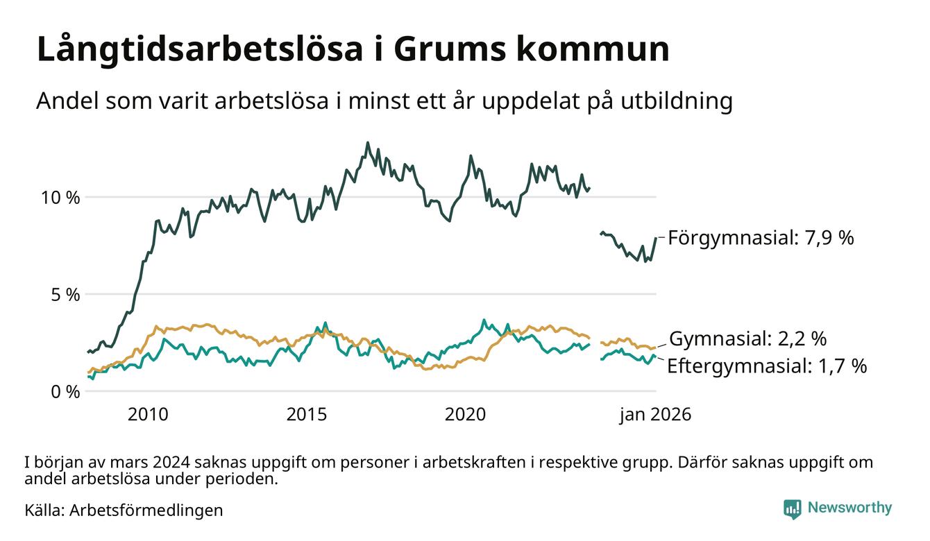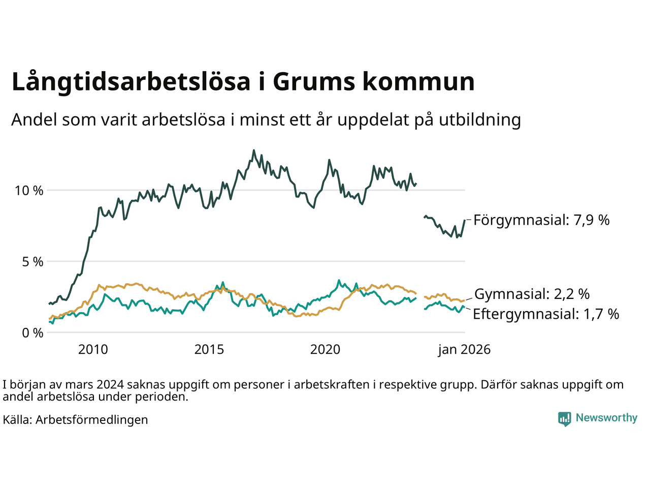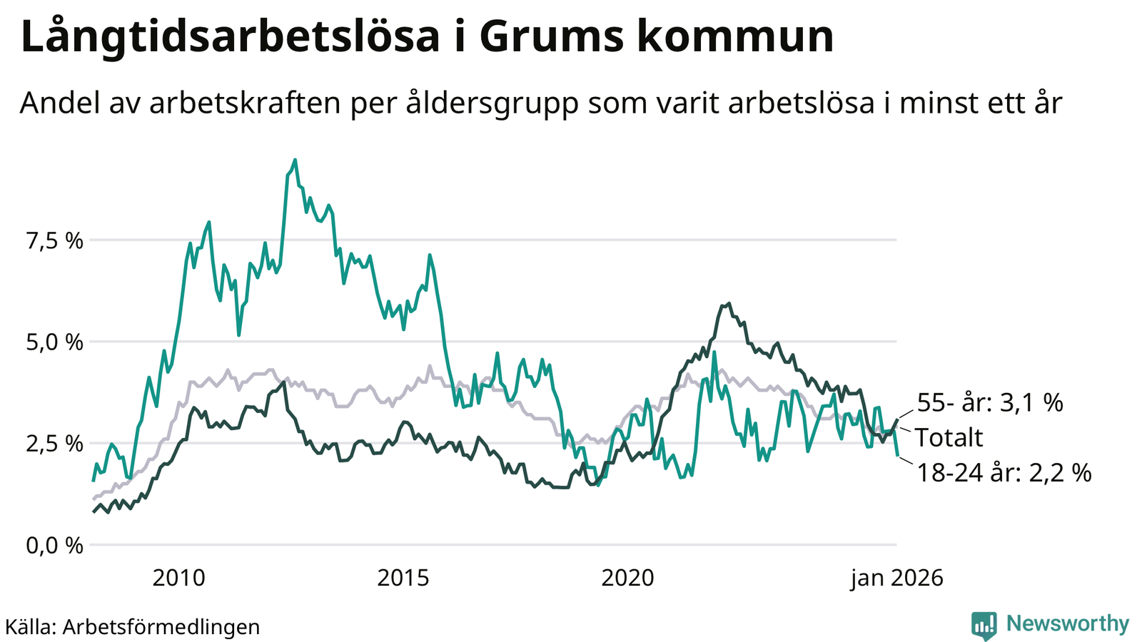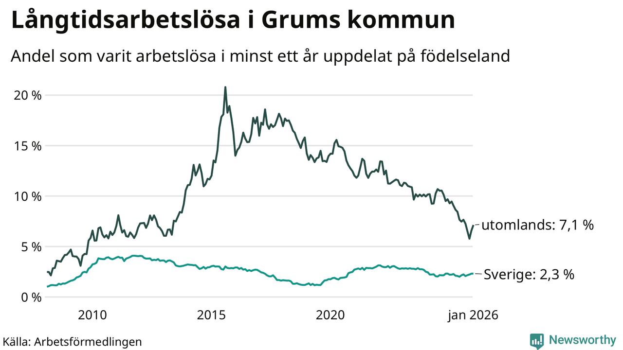 I januari hade 119 Grumsbor varit arbetslösa i minst ett år, vilket är fyra fler än månaden innan. 119 personer motsvarar 2,9 procent av arbetskraften i kommunen – andelen långtidsarbetslösa är ungefär på samma nivå som för ett år sedan.