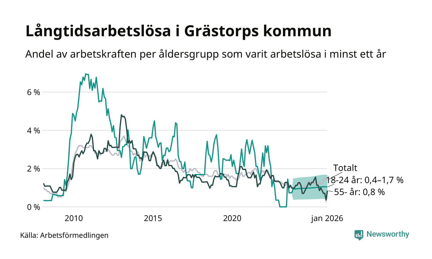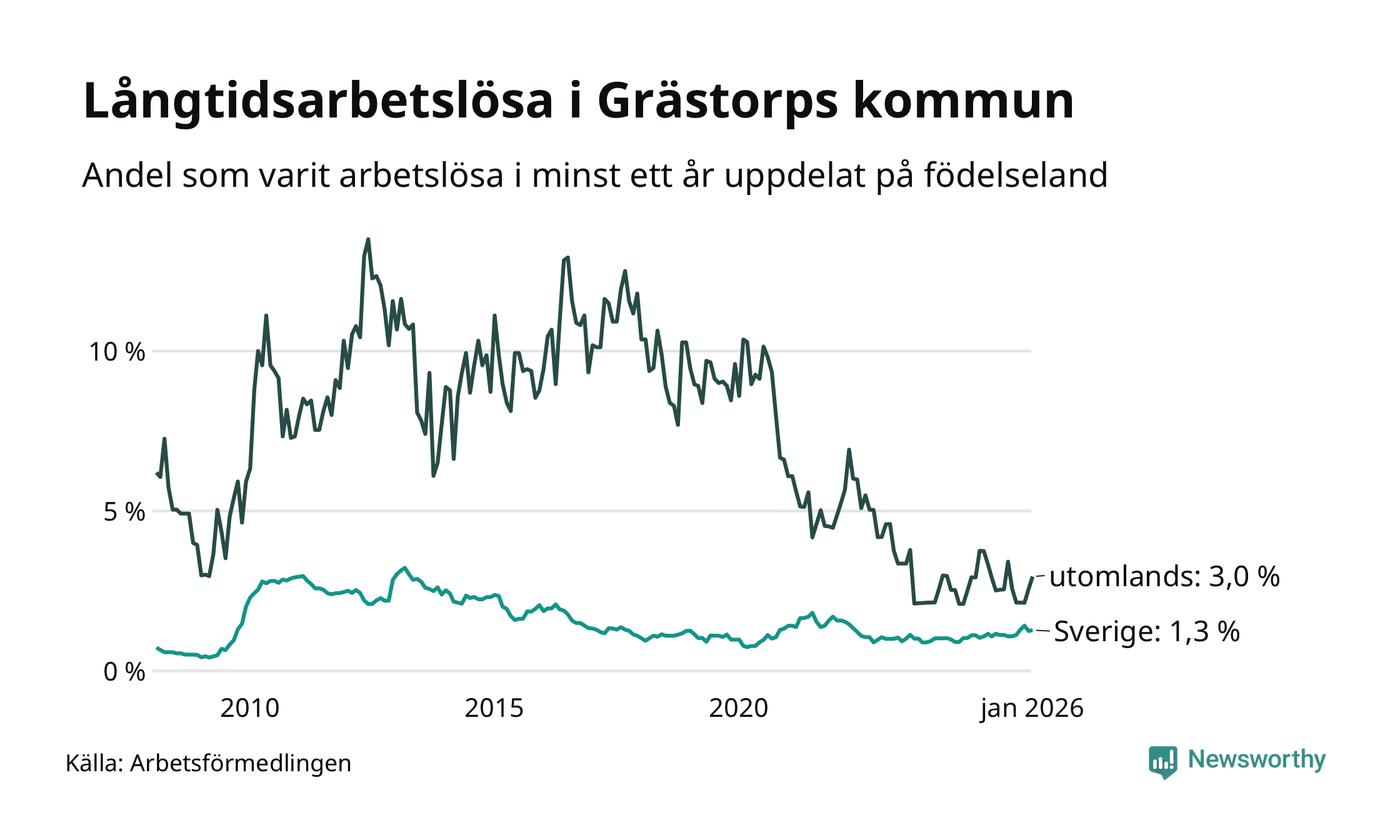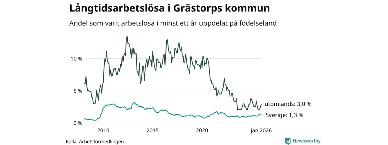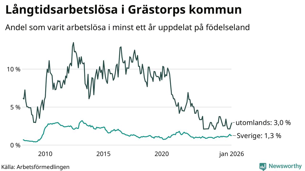 I januari hade 38 Grästorpsbor varit arbetslösa i minst ett år, vilket är två fler än månaden innan. 38 personer motsvarar 1,4 procent av arbetskraften i kommunen – andelen långtidsarbetslösa är ungefär på samma nivå som för ett år sedan.