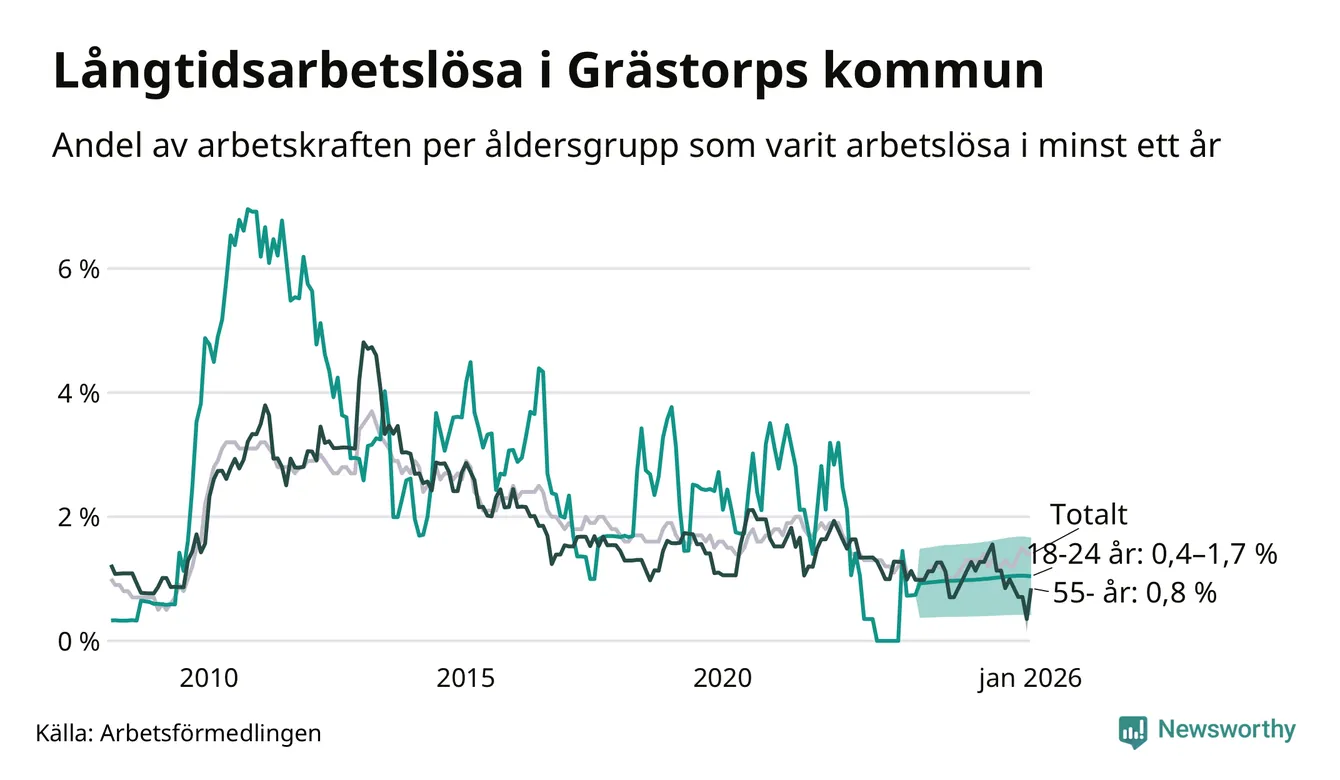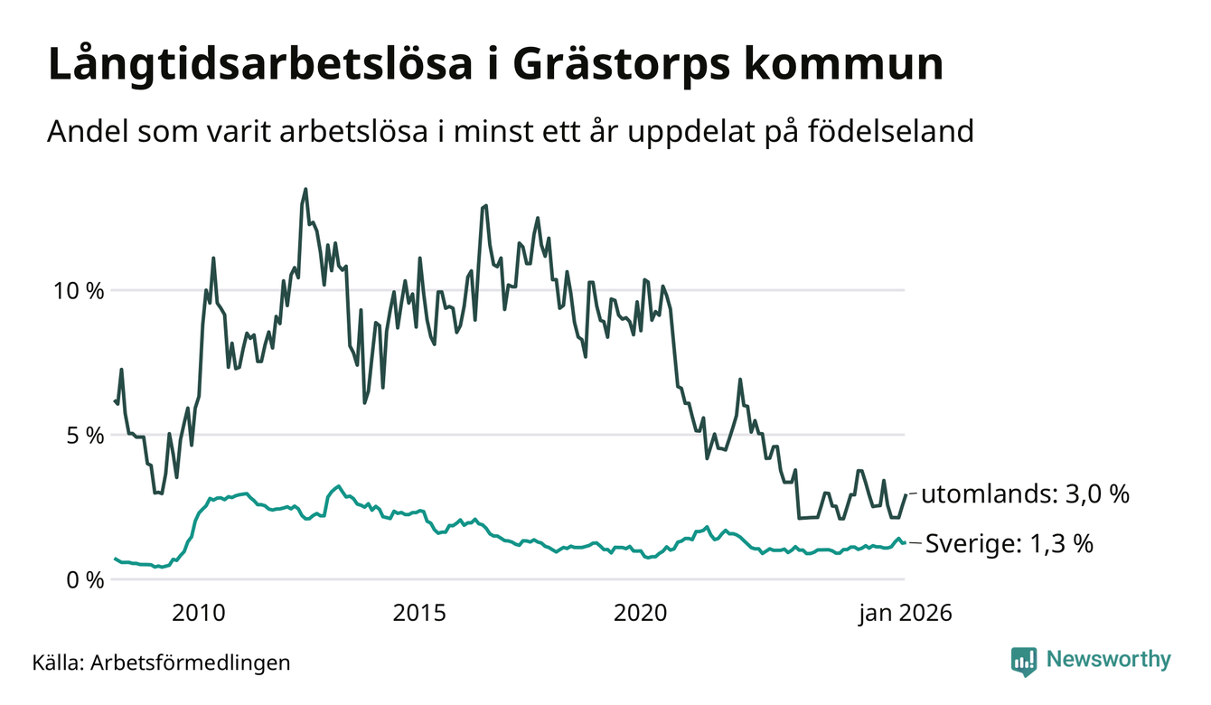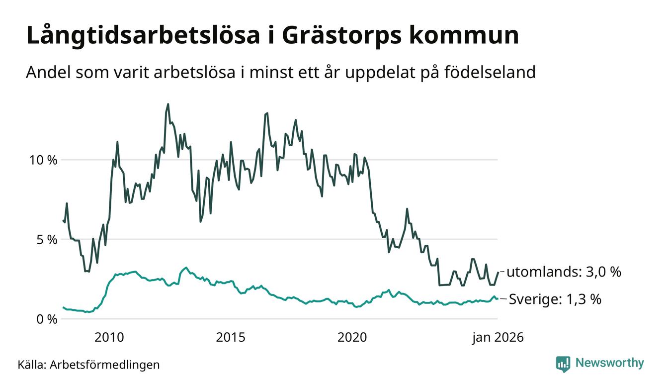 I januari hade 38 Grästorpsbor varit arbetslösa i minst ett år, vilket är två fler än månaden innan. 38 personer motsvarar 1,4 procent av arbetskraften i kommunen – andelen långtidsarbetslösa är ungefär på samma nivå som för ett år sedan.