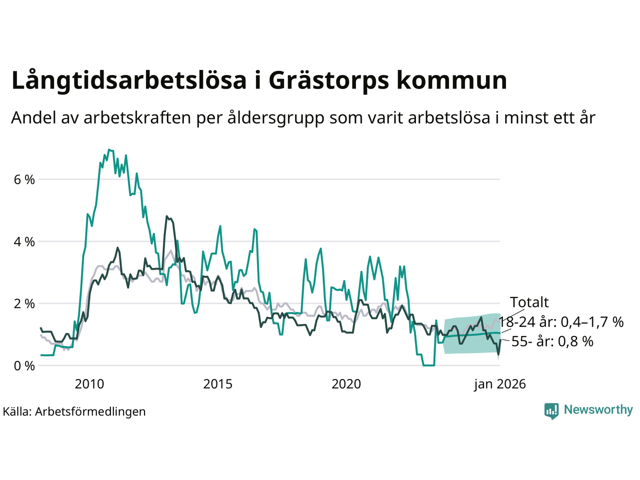 Graf: Andel arbetslösa uppdelat i åldersgrupper i Grästorp