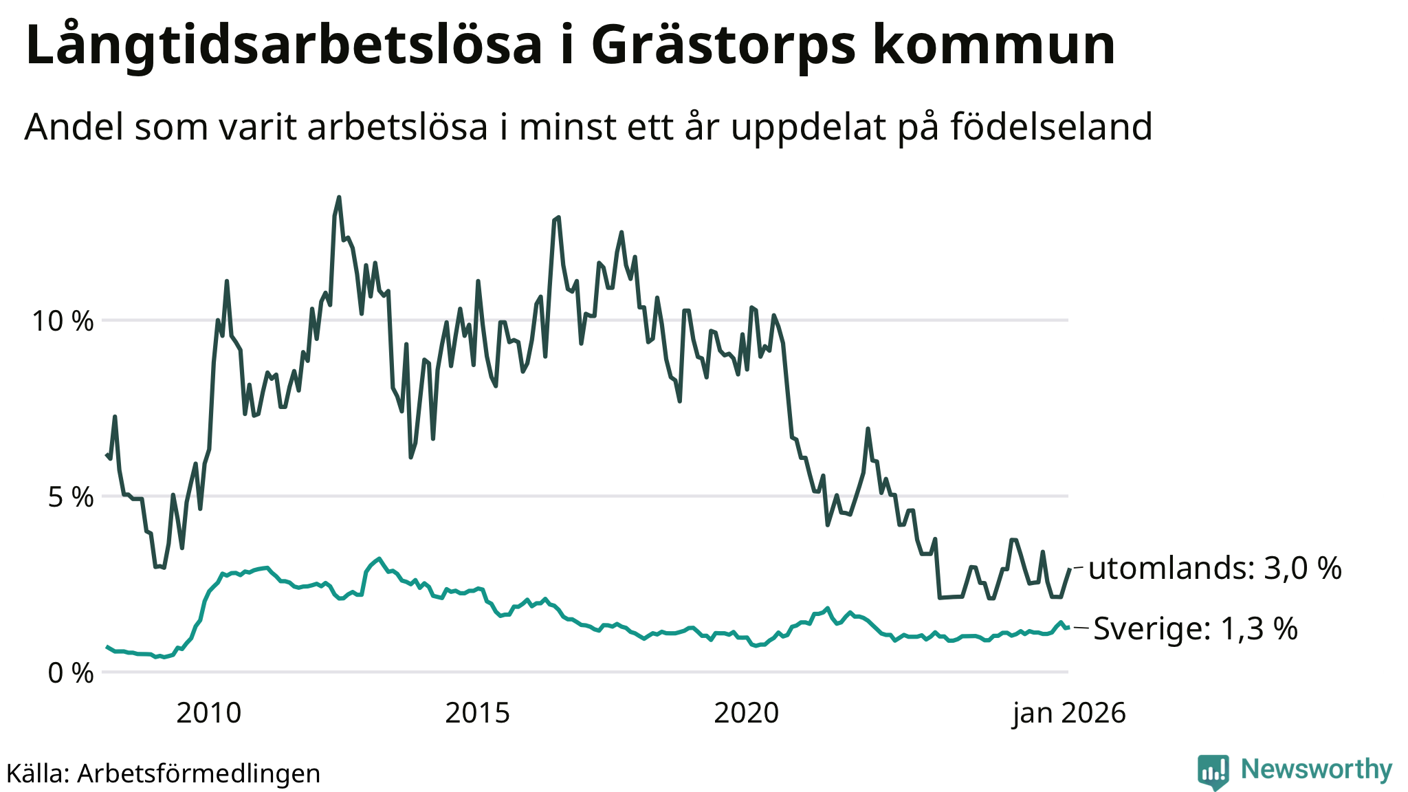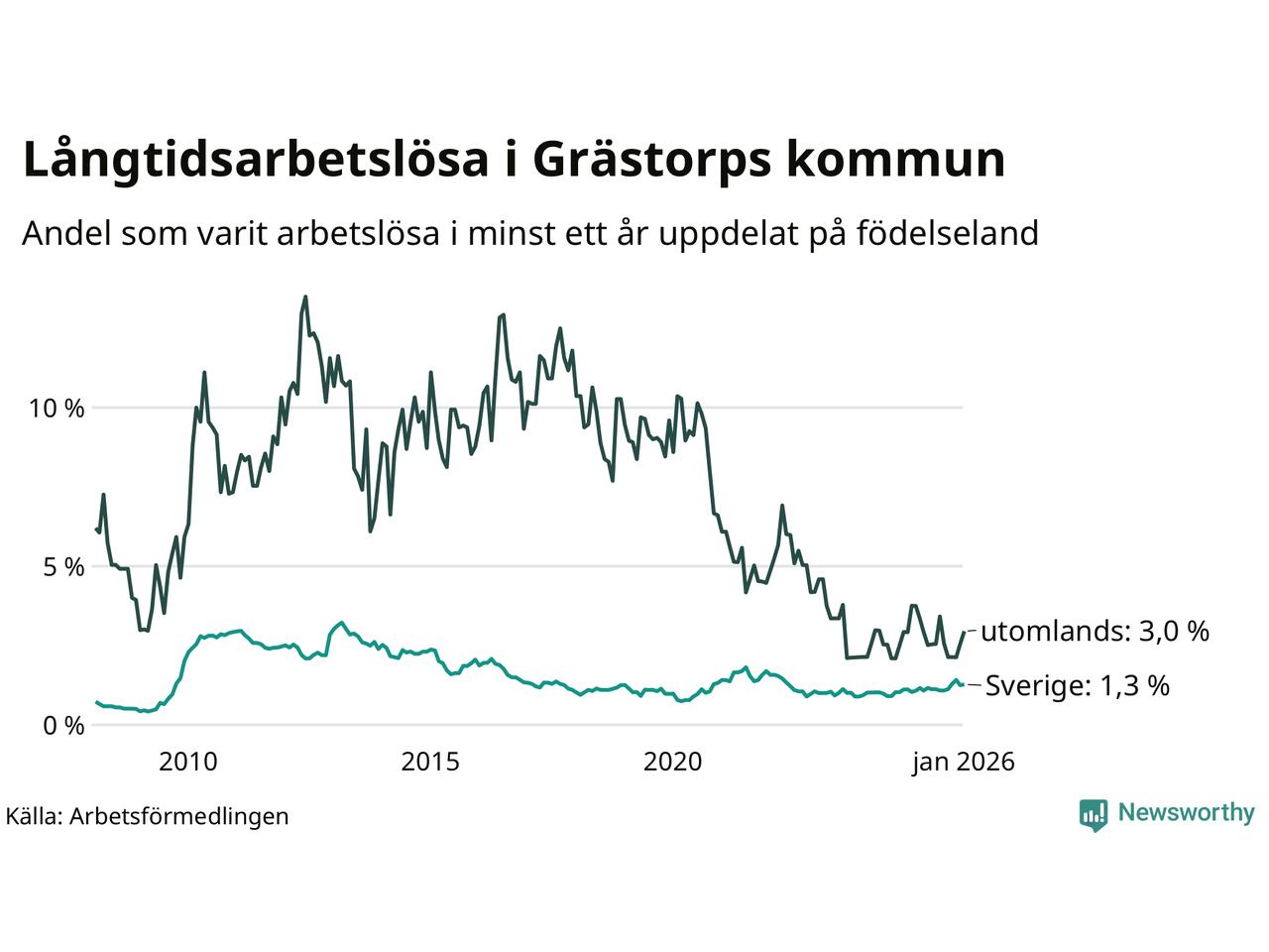 Graf: Andel arbetslösa uppdelat på födelseland i Grästorp