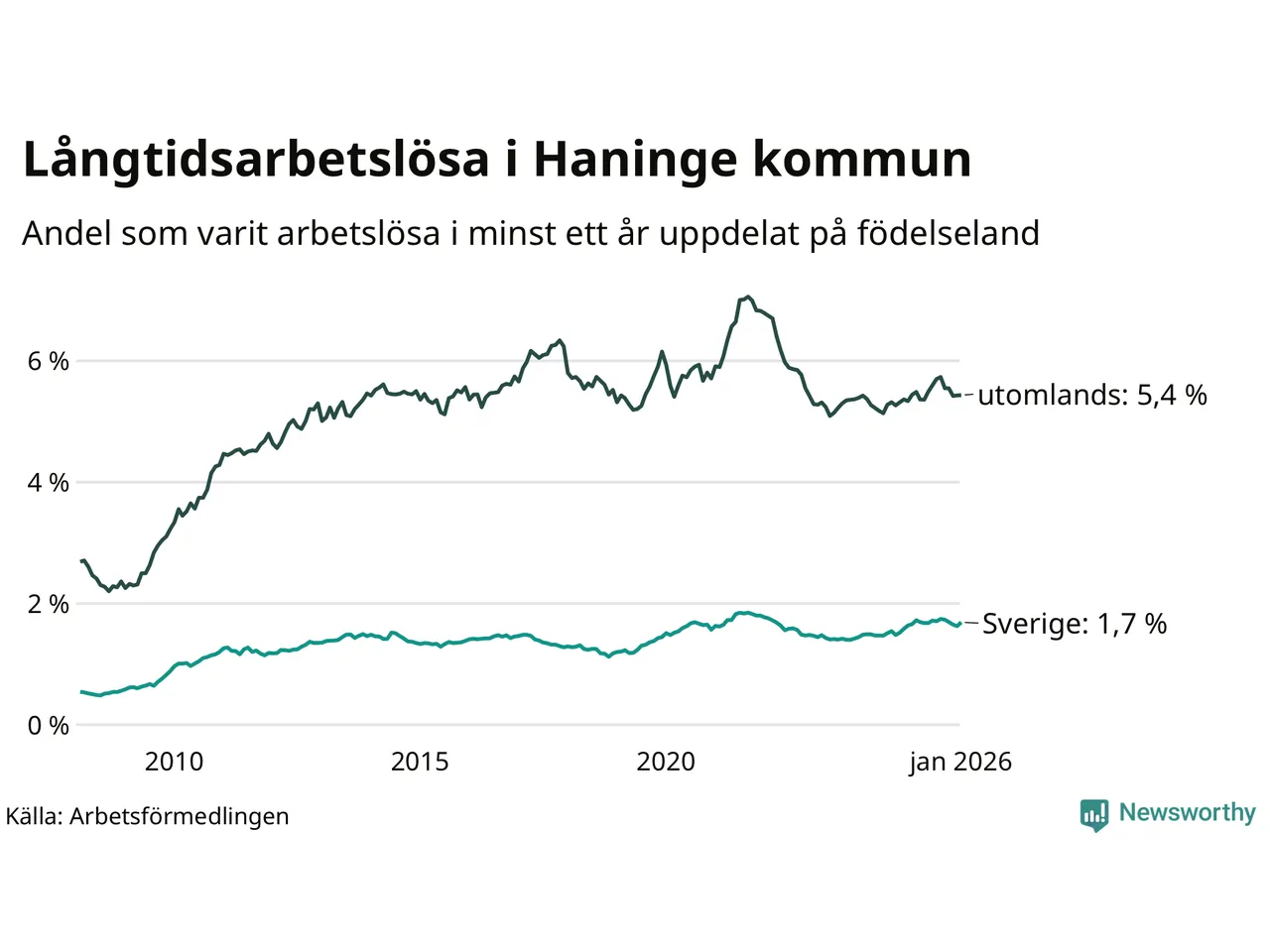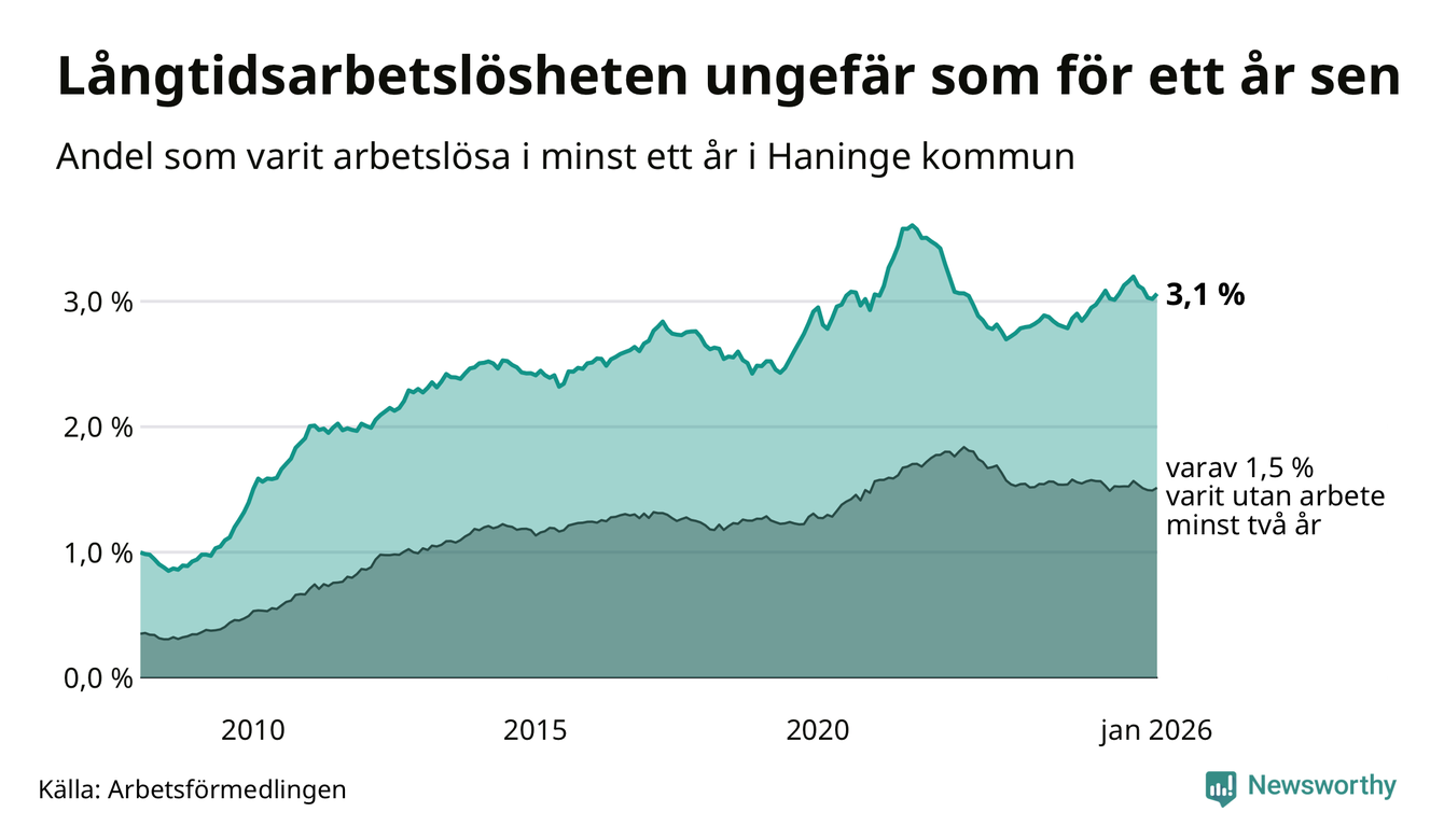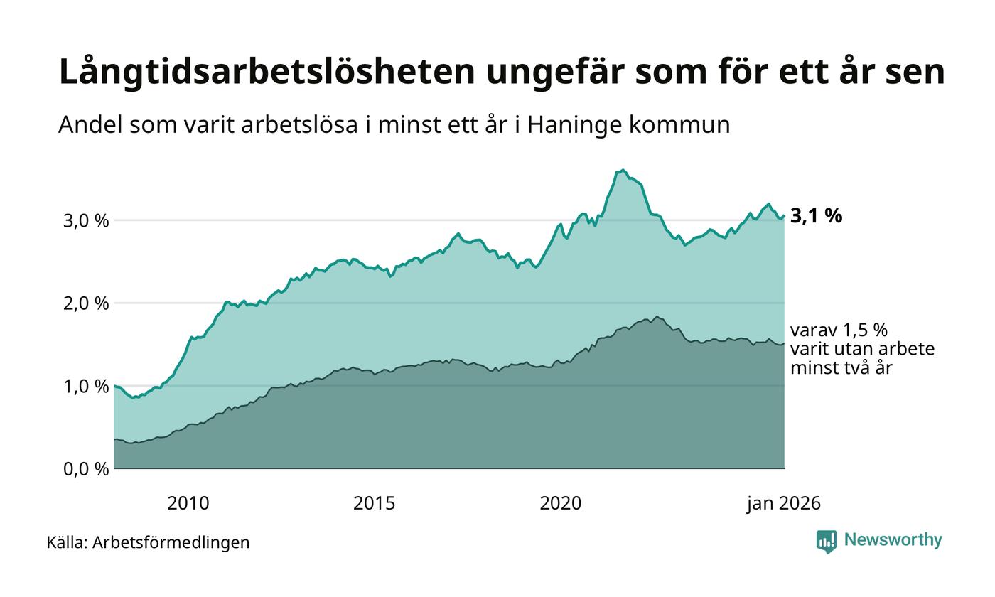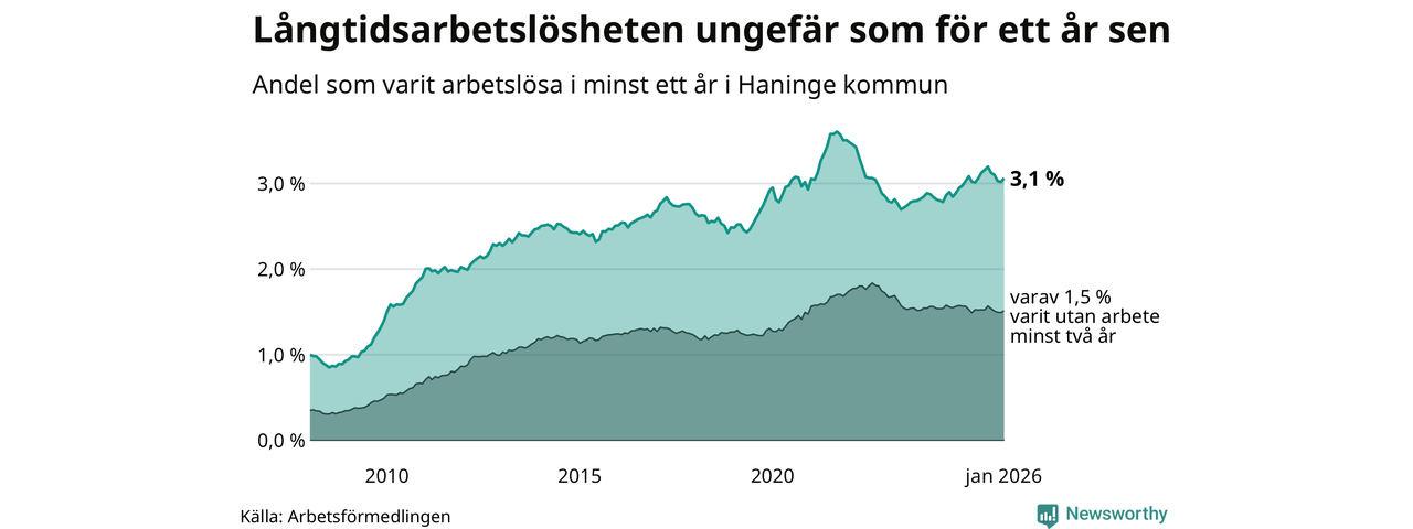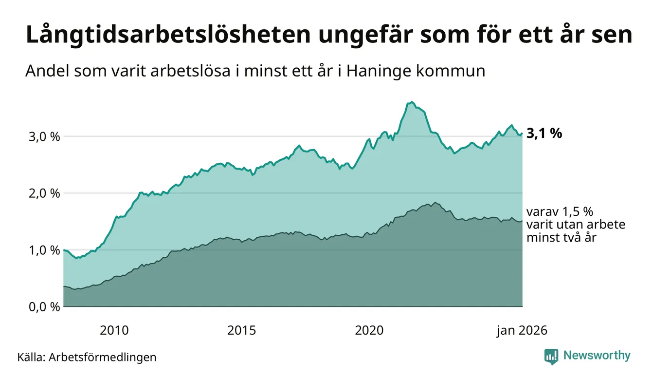 I januari hade 1 646 Haningebor varit arbetslösa i minst ett år, vilket är 33 fler än månaden innan. Det är den första månaden sedan augusti 2025 som antalet arbetslösa ökar. 1 646 personer motsvarar 3,1 procent av arbetskraften i kommunen – andelen långtidsarbetslösa är ungefär på samma nivå som för ett år sedan.