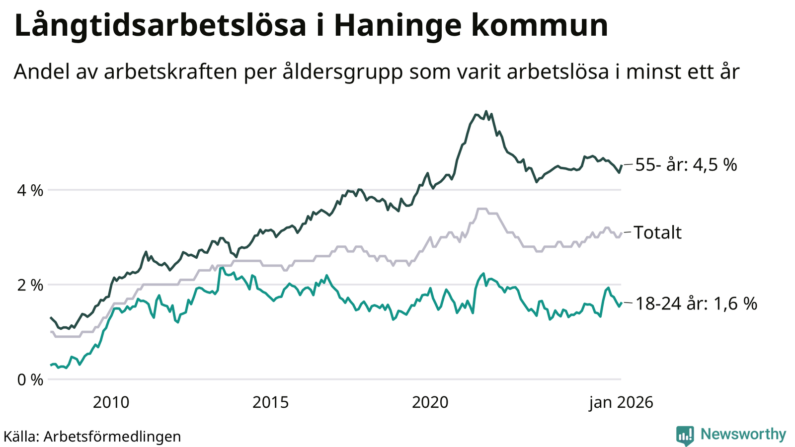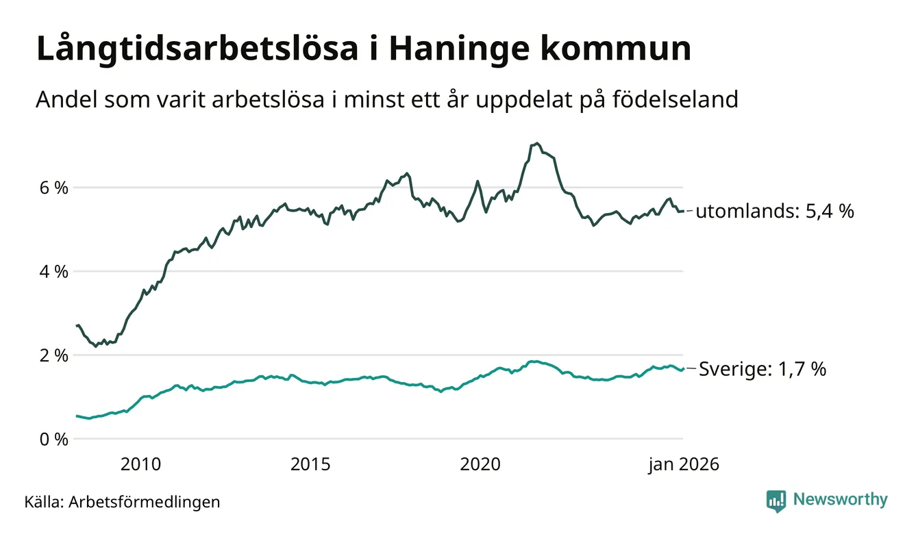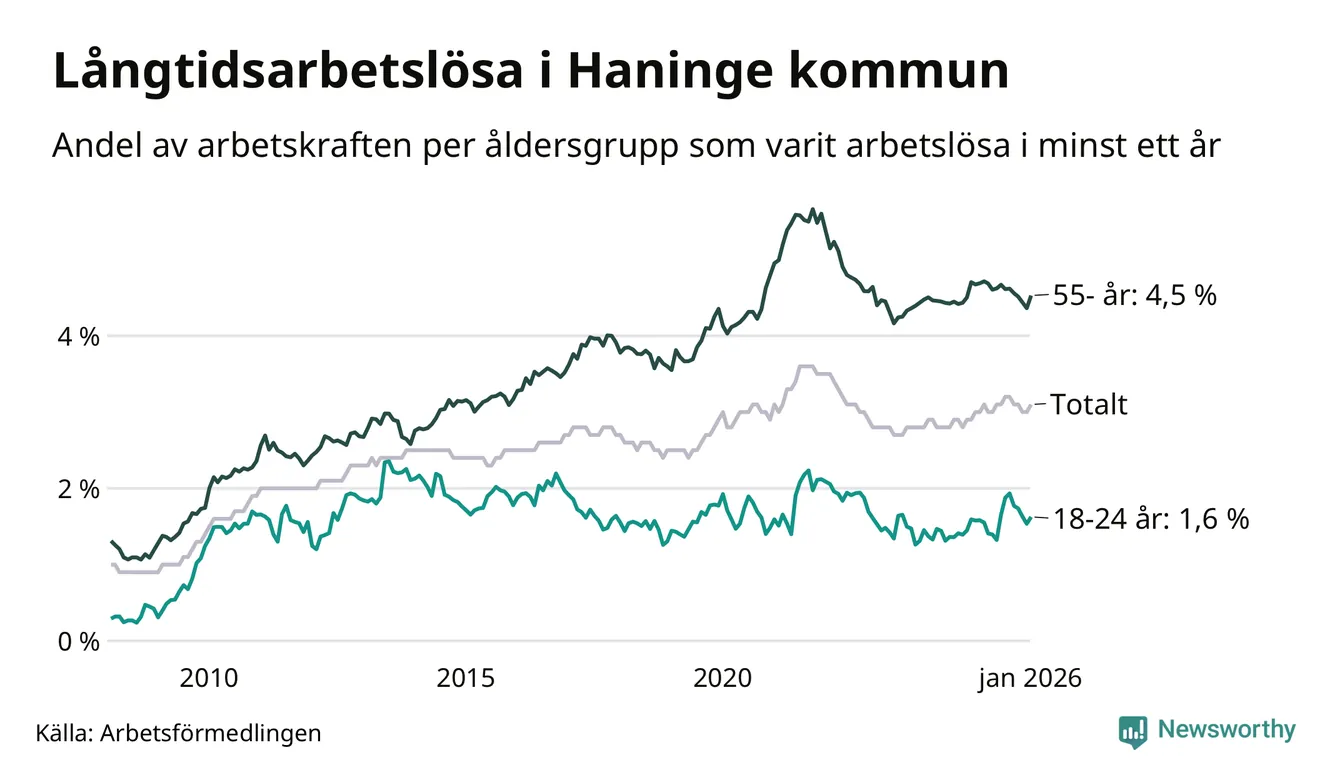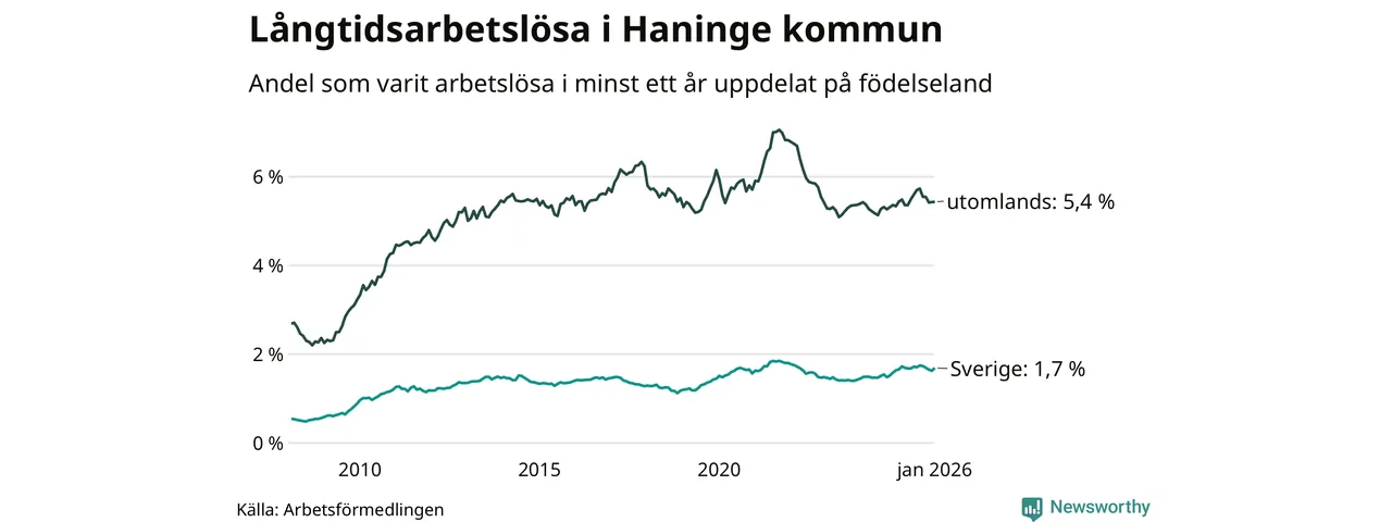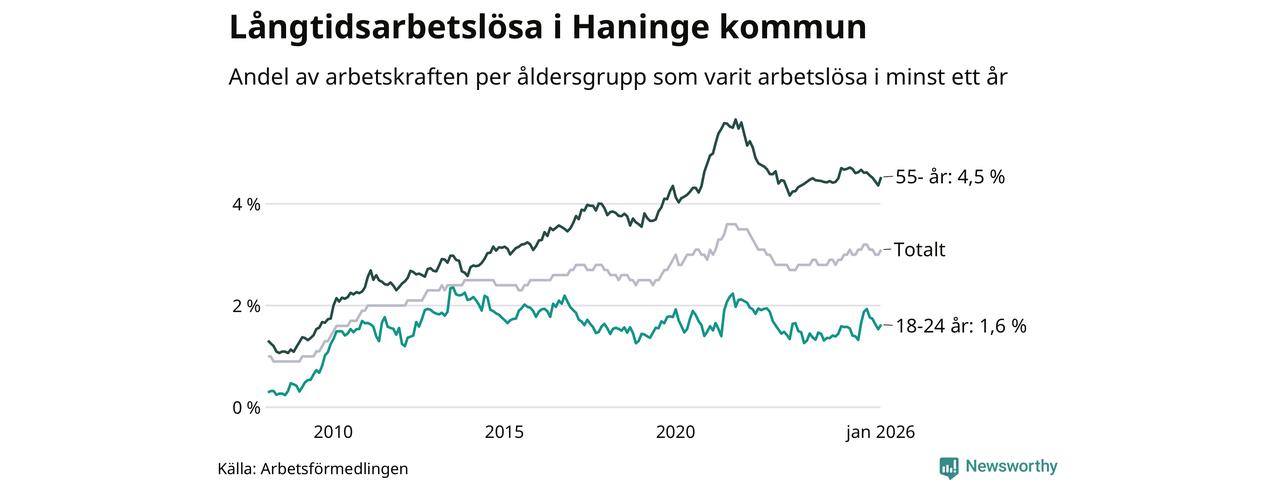 I januari hade 1 646 Haningebor varit arbetslösa i minst ett år, vilket är 33 fler än månaden innan. Det är den första månaden sedan augusti 2025 som antalet arbetslösa ökar. 1 646 personer motsvarar 3,1 procent av arbetskraften i kommunen – andelen långtidsarbetslösa är ungefär på samma nivå som för ett år sedan.