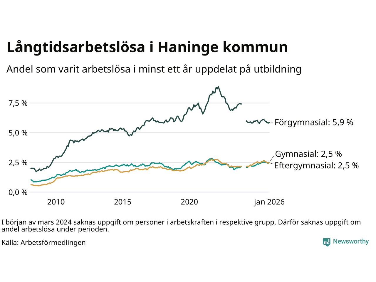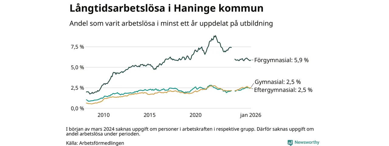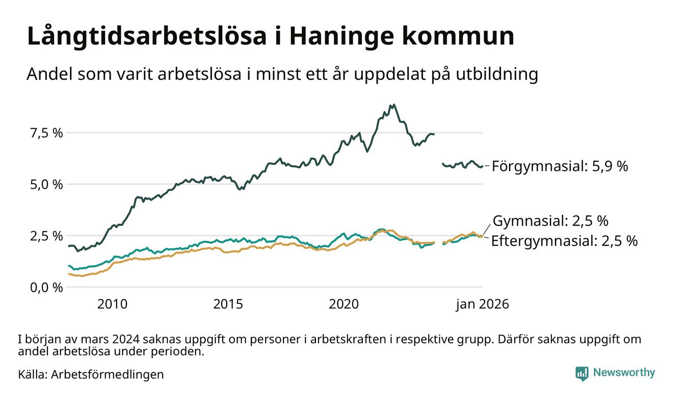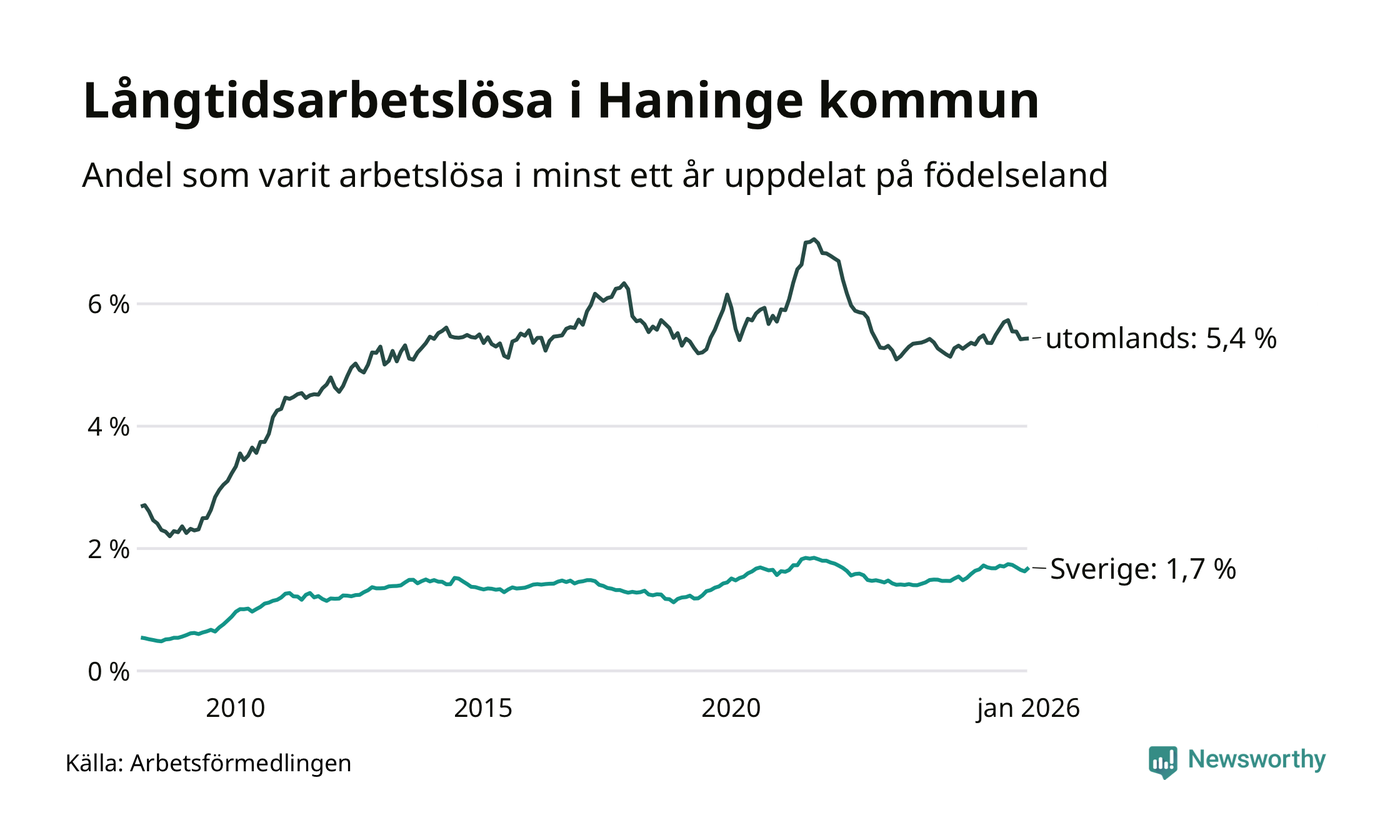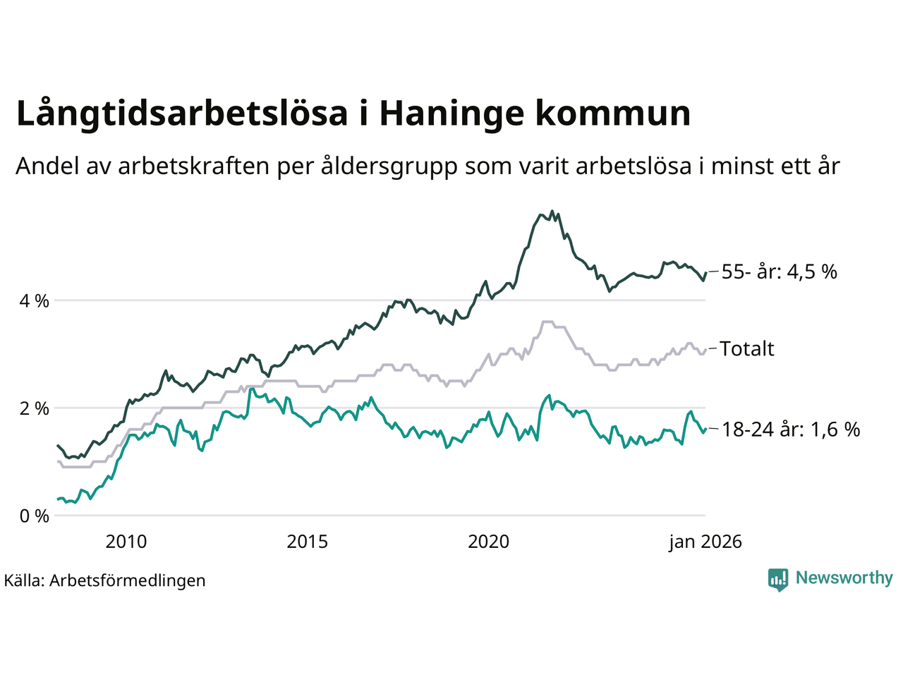 I januari hade 1 646 Haningebor varit arbetslösa i minst ett år, vilket är 33 fler än månaden innan. Det är den första månaden sedan augusti 2025 som antalet arbetslösa ökar. 1 646 personer motsvarar 3,1 procent av arbetskraften i kommunen – andelen långtidsarbetslösa är ungefär på samma nivå som för ett år sedan.