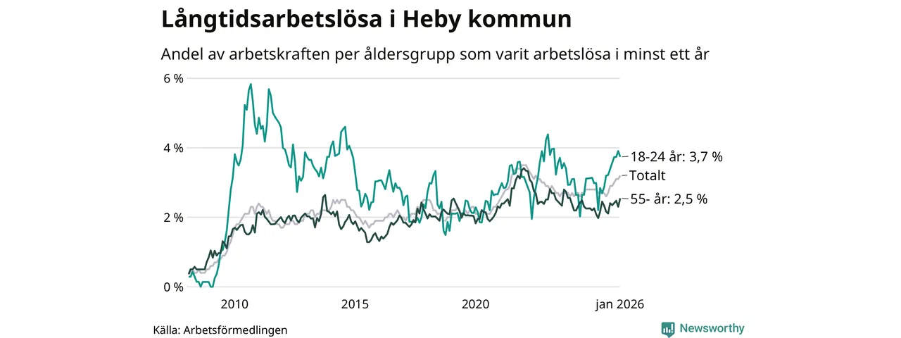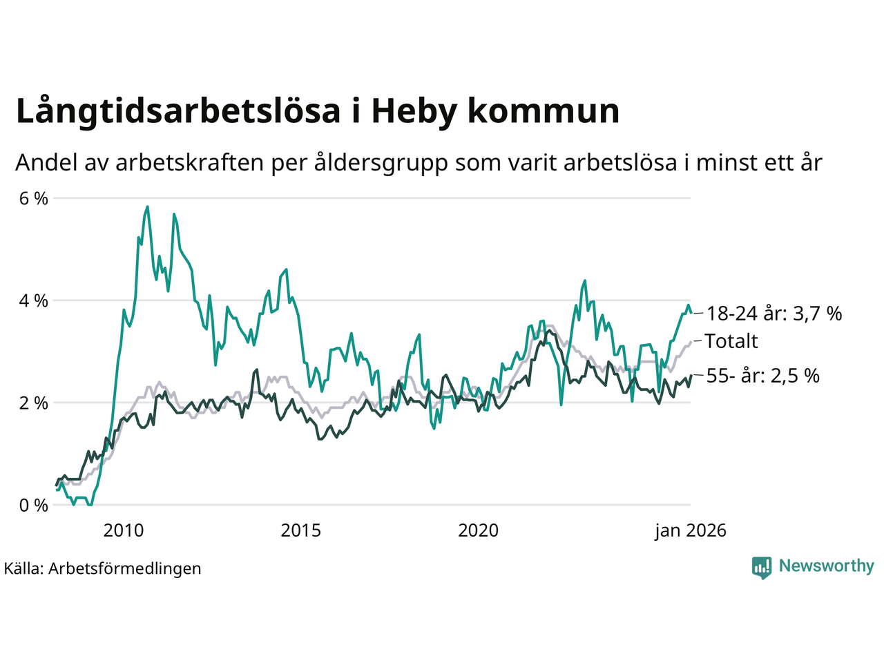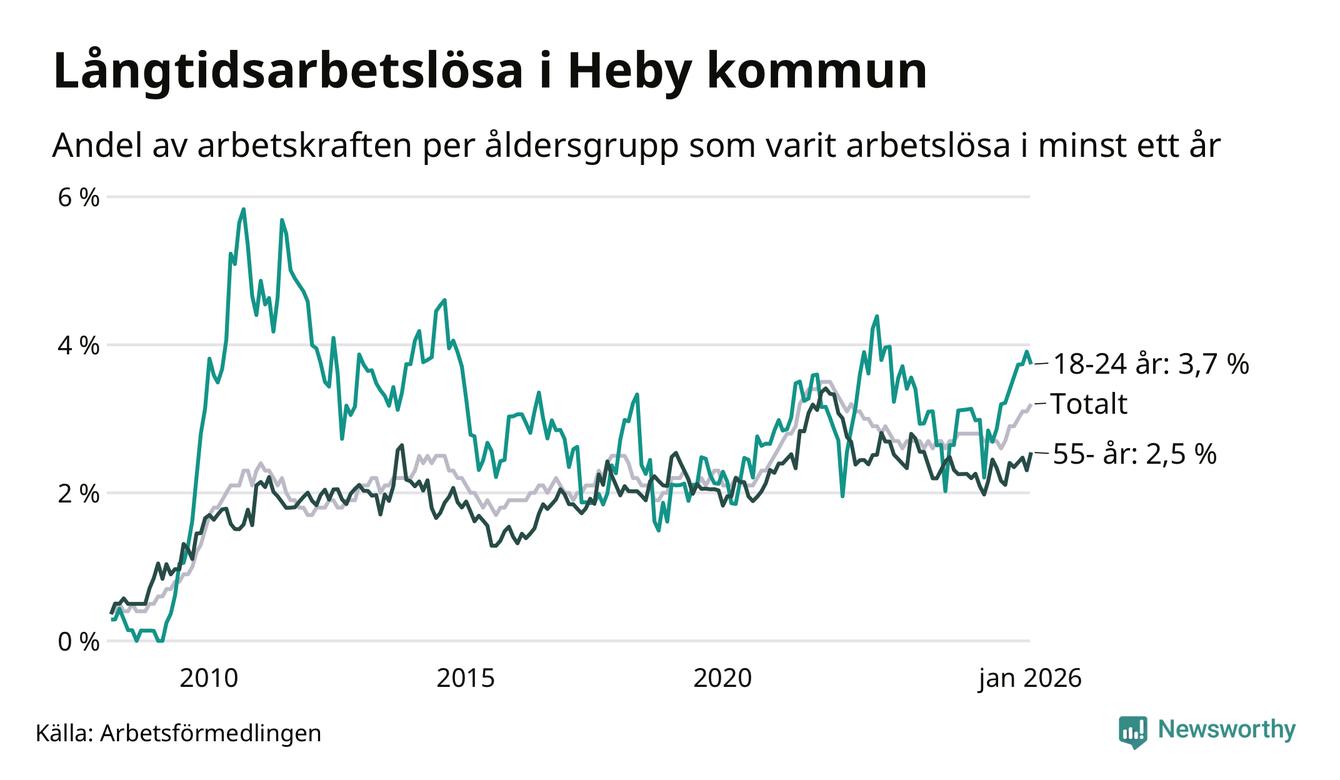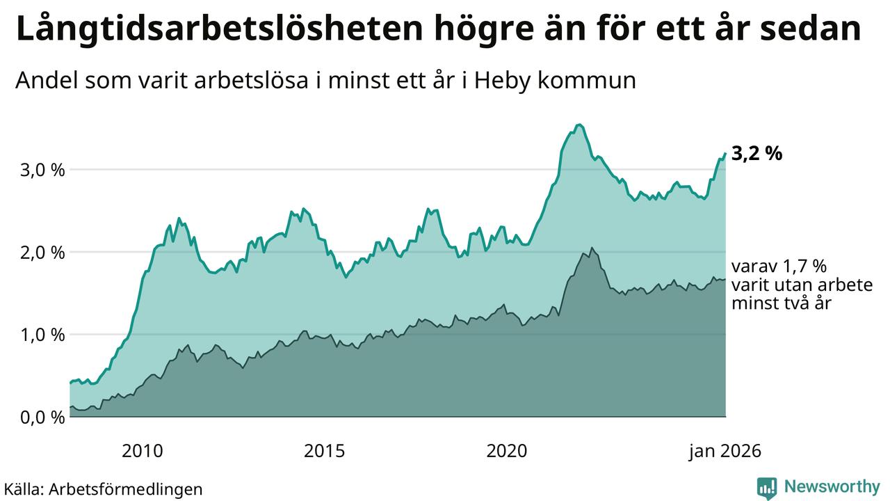 I januari hade 213 Hebybor varit arbetslösa i minst ett år, vilket är åtta fler än månaden innan. 213 personer motsvarar 3,2 procent av arbetskraften i kommunen – andelen långtidsarbetslösa är 0,4 procentenheter högre än samma månad för ett år sedan.