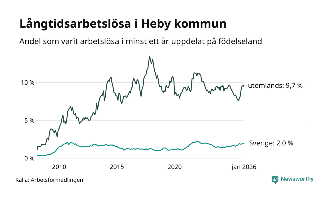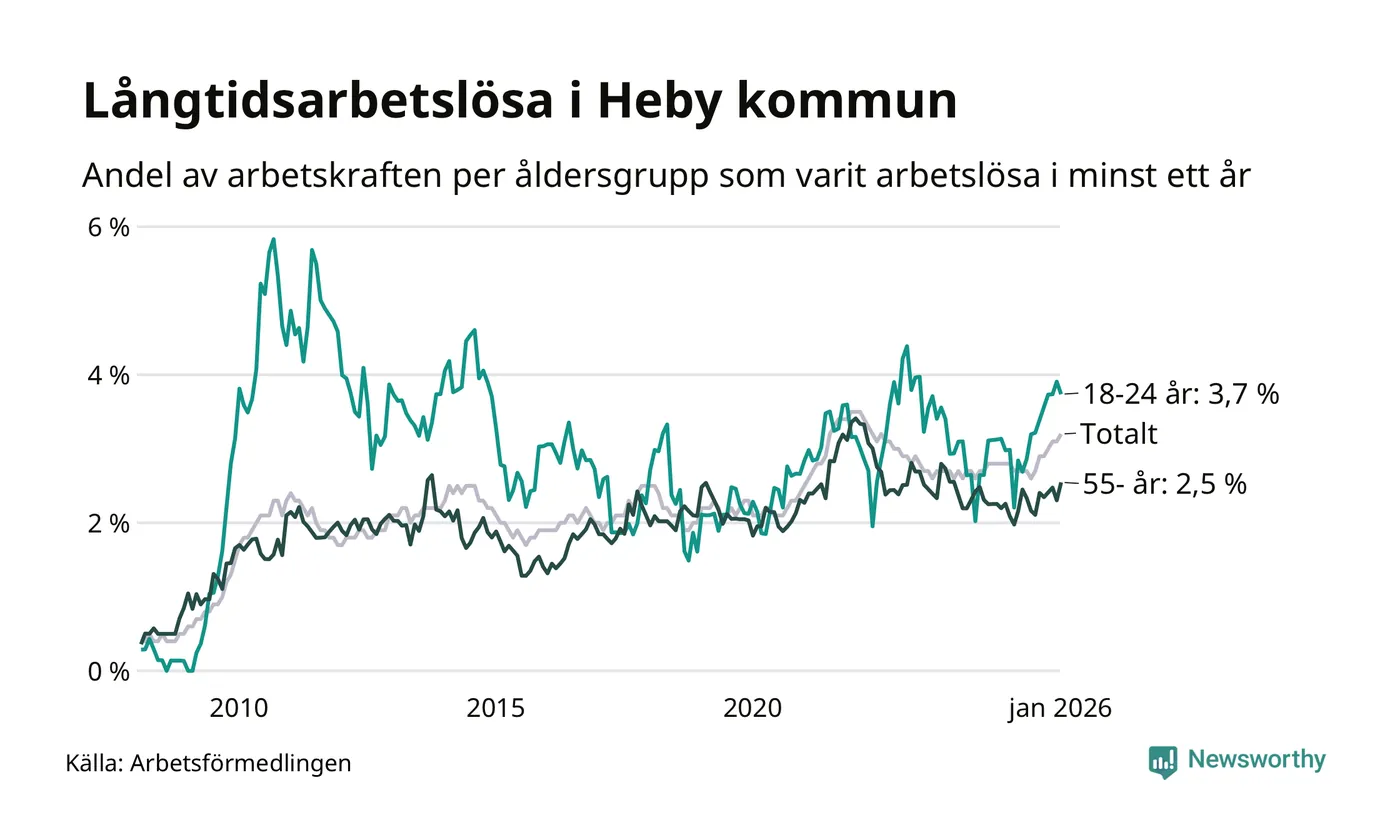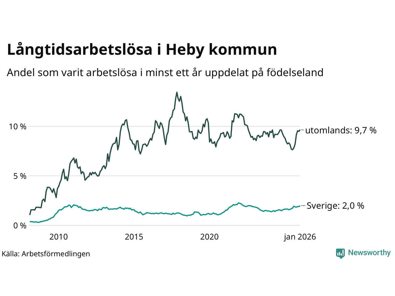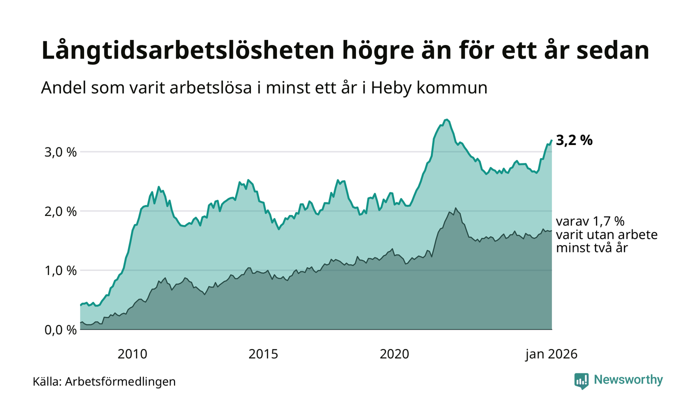 I januari hade 213 Hebybor varit arbetslösa i minst ett år, vilket är åtta fler än månaden innan. 213 personer motsvarar 3,2 procent av arbetskraften i kommunen – andelen långtidsarbetslösa är 0,4 procentenheter högre än samma månad för ett år sedan.