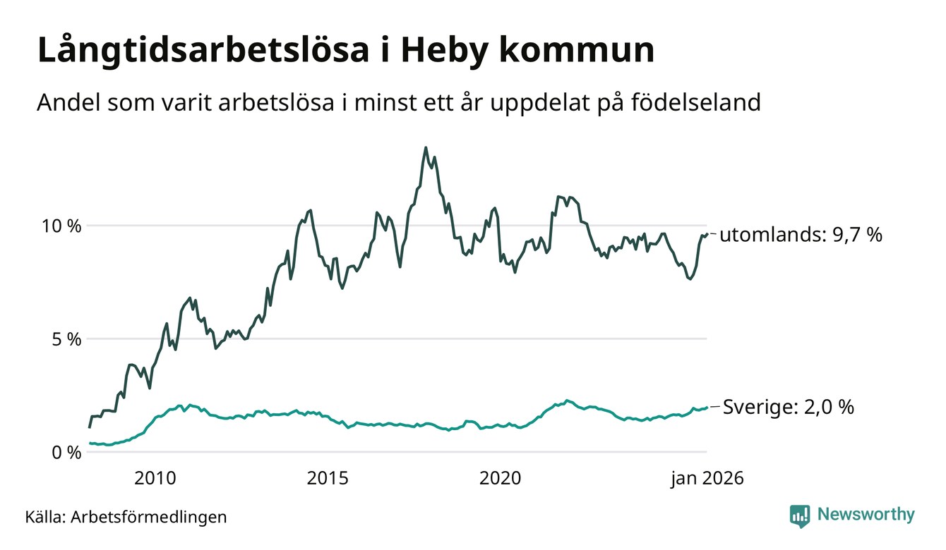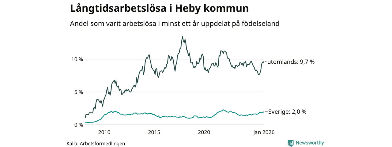 111 av de långtidsarbetslösa i Heby är födda i Sverige, medan 102 är födda utomlands. Det innebär att långtidsarbetslösheten bland Sverigefödda är 2,0 procent, medan den är fem gånger så hög – 9,7 procent – bland födda utomlands. Även i riket som helhet är arbetslösheten högre bland utrikesfödda.
