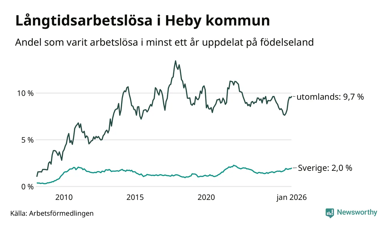 Graf: Andel arbetslösa uppdelat på födelseland i Heby