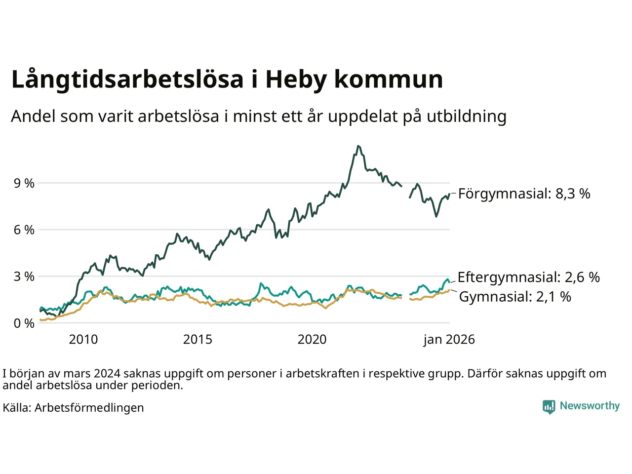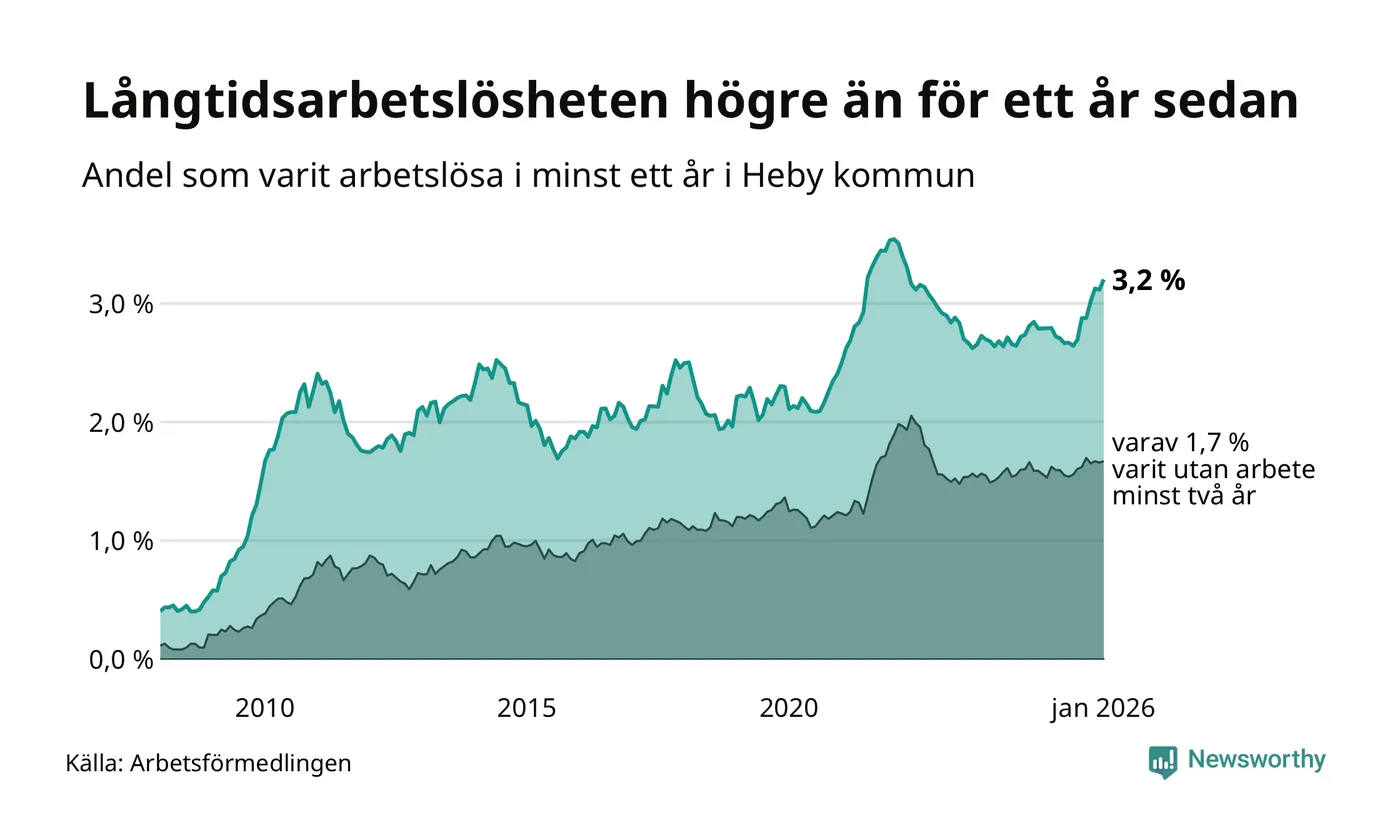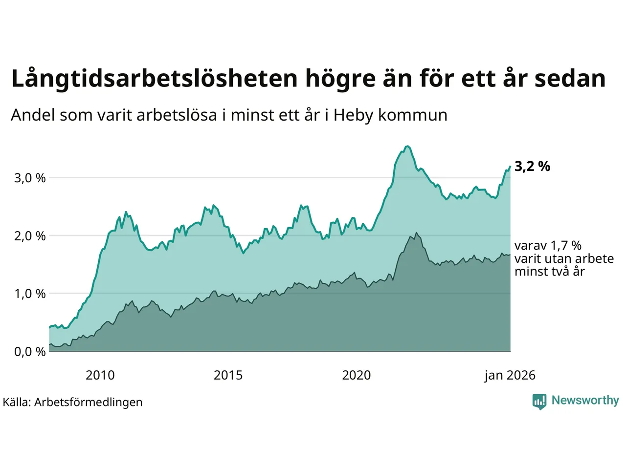 Inte sedan april 2022 har andelen långtidsarbetslösa varit så hög i Heby. Det visar Arbetsförmedlingens senaste månadsstatistik.
