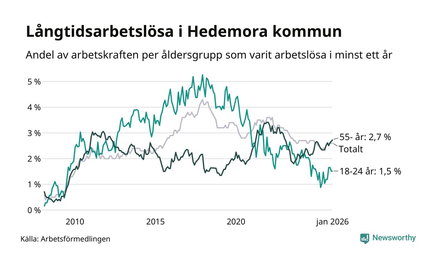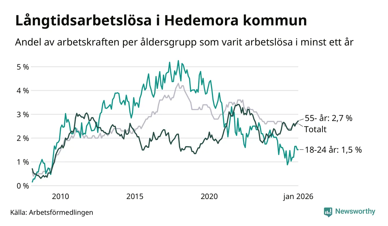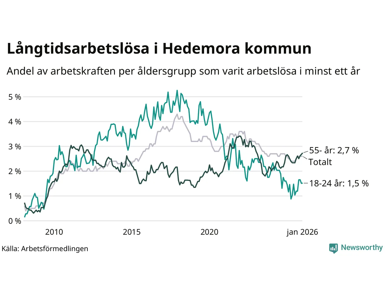 Av de 182 personerna som varit arbetslösa i mer än ett år i Hedemora kommun är 50 personer mellan 55 och 661 år och tio är mellan 18 och 24 år. För den äldre gruppen är andelen arbetslösa 2,7 procent medan den i den yngre gruppen är 1,5 procent. Även i riket som helhet är långtidsarbetslösheten högre i gruppen äldre.