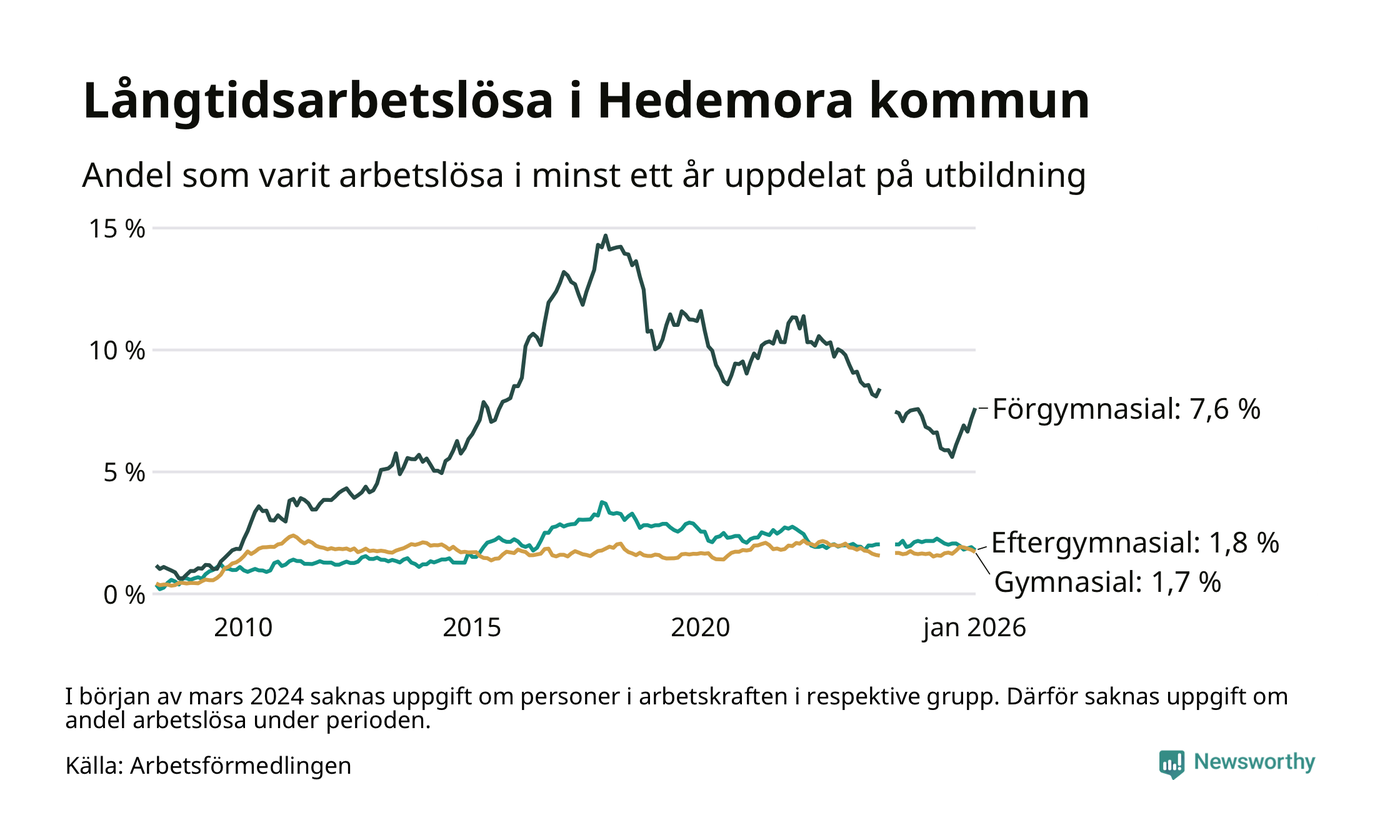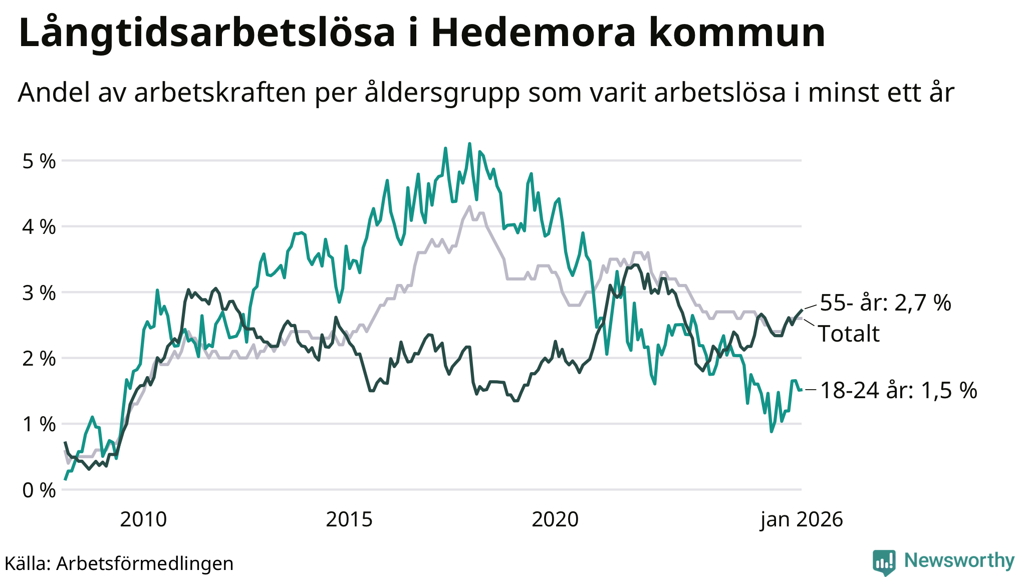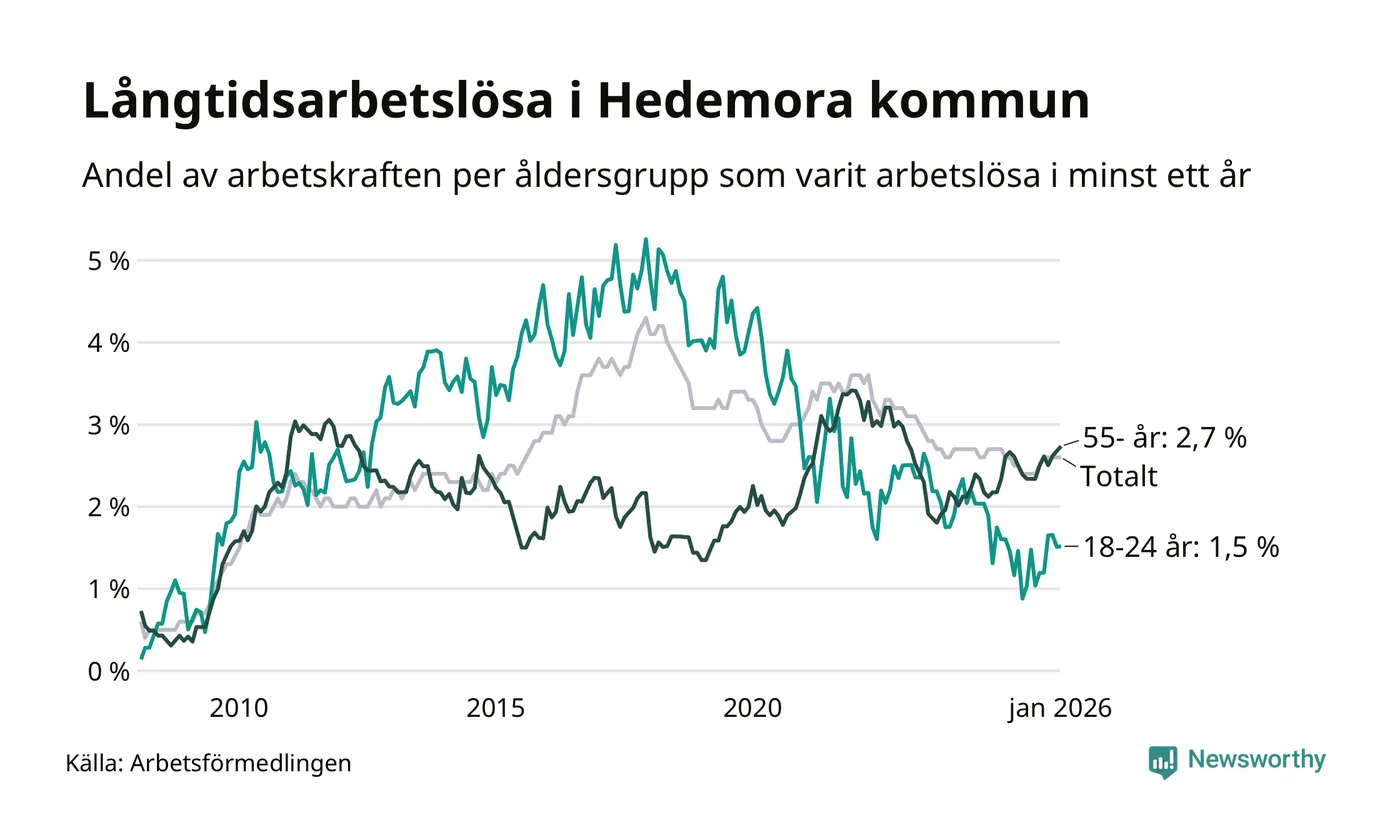 Av de 182 personerna som varit arbetslösa i mer än ett år i Hedemora kommun är 50 personer mellan 55 och 661 år och tio är mellan 18 och 24 år. För den äldre gruppen är andelen arbetslösa 2,7 procent medan den i den yngre gruppen är 1,5 procent. Även i riket som helhet är långtidsarbetslösheten högre i gruppen äldre.