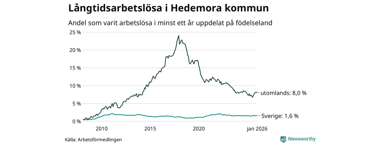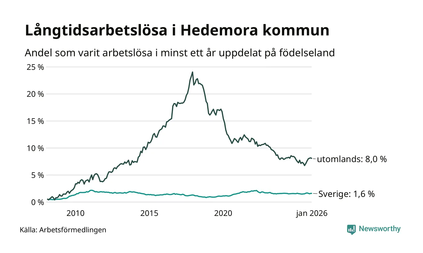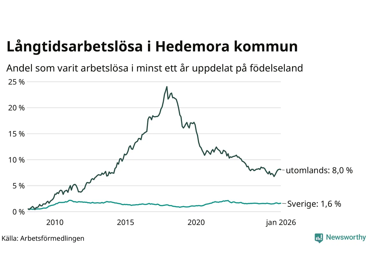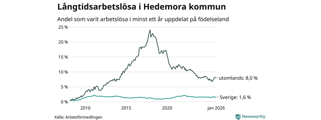 94 av de långtidsarbetslösa i Hedemora är födda i Sverige, medan 88 är födda utomlands. Det innebär att långtidsarbetslösheten bland Sverigefödda är 1,6 procent, medan den är fem gånger så hög – 8,0 procent – bland födda utomlands. Även i riket som helhet är arbetslösheten högre bland utrikesfödda.