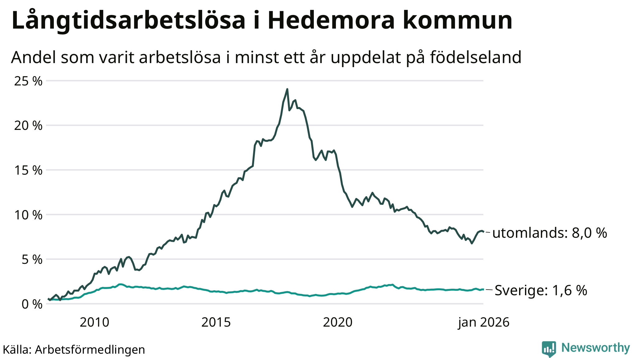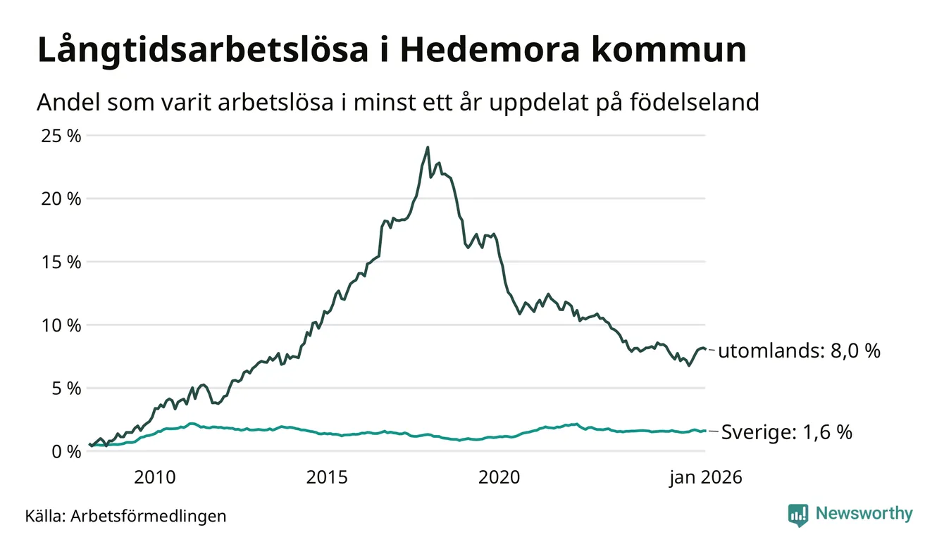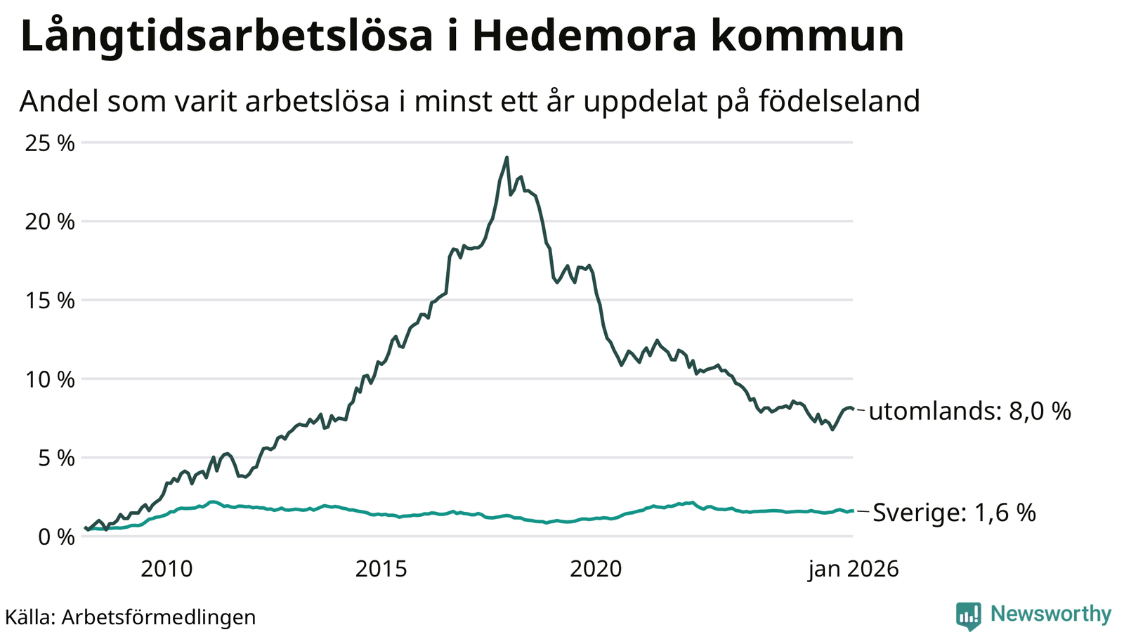 94 av de långtidsarbetslösa i Hedemora är födda i Sverige, medan 88 är födda utomlands. Det innebär att långtidsarbetslösheten bland Sverigefödda är 1,6 procent, medan den är fem gånger så hög – 8,0 procent – bland födda utomlands. Även i riket som helhet är arbetslösheten högre bland utrikesfödda.