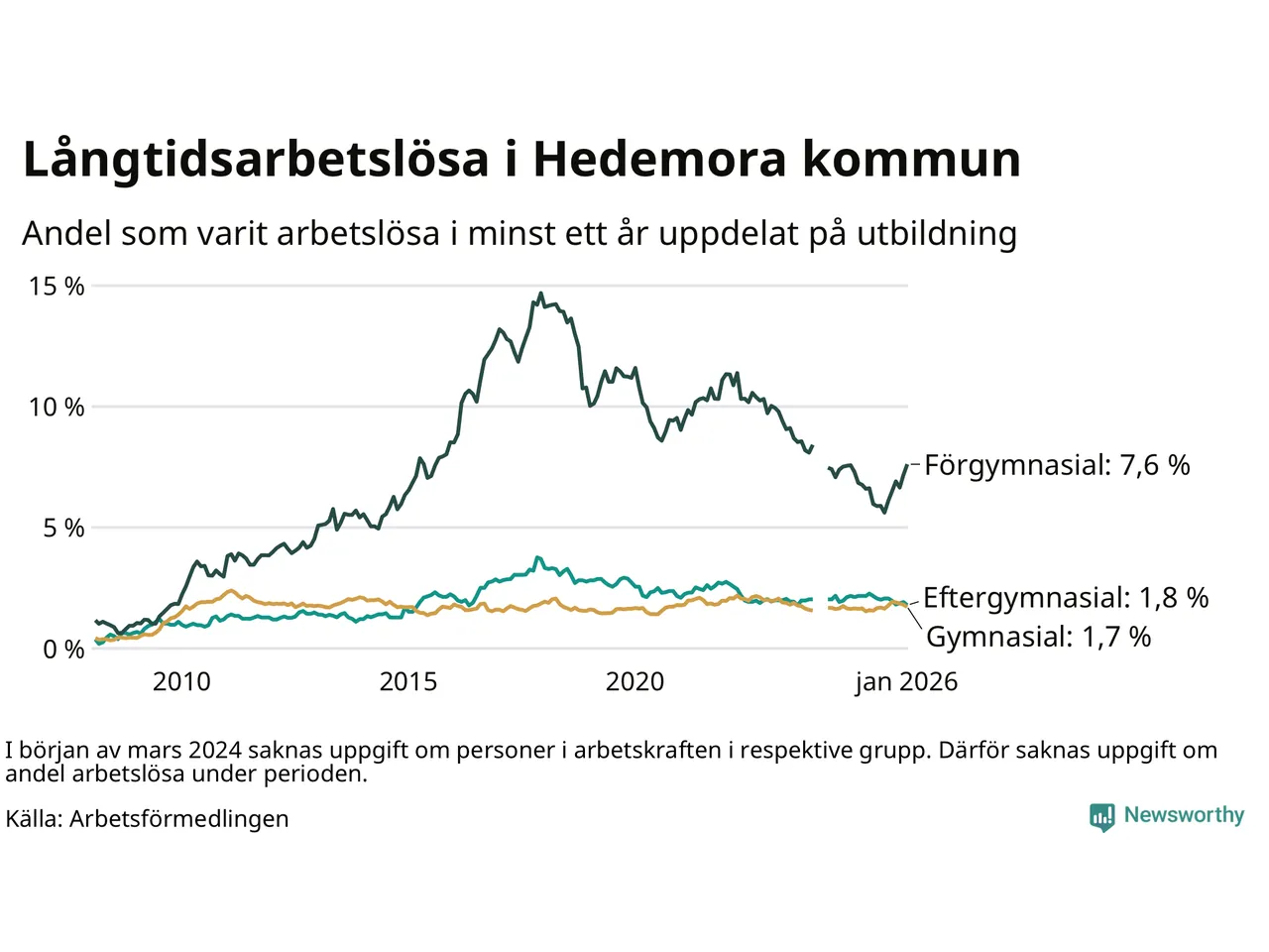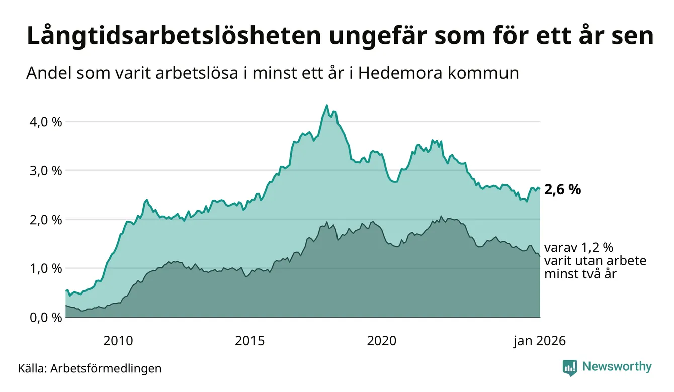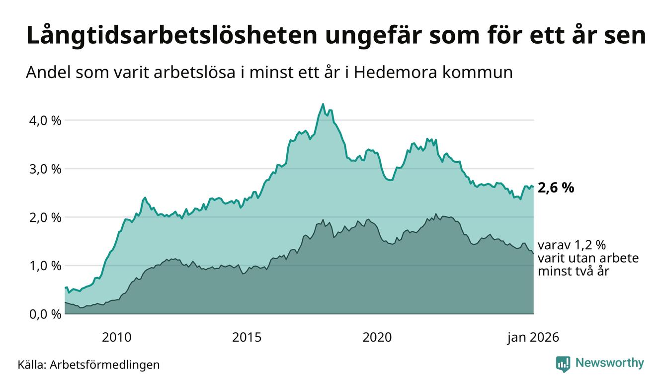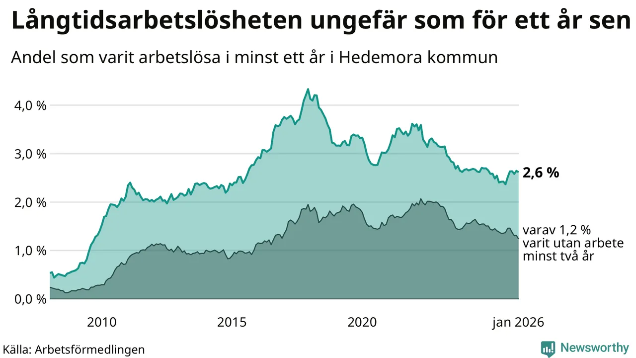 I januari hade 182 Hedemorabor varit arbetslösa i minst ett år, vilket är lika många som månaden innan. 182 personer motsvarar 2,6 procent av arbetskraften i kommunen – andelen långtidsarbetslösa är ungefär på samma nivå som för ett år sedan.