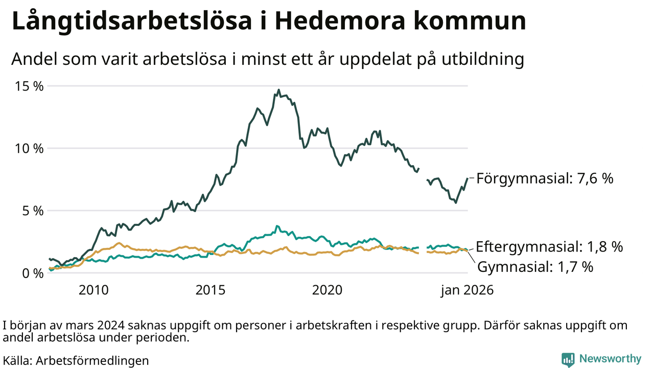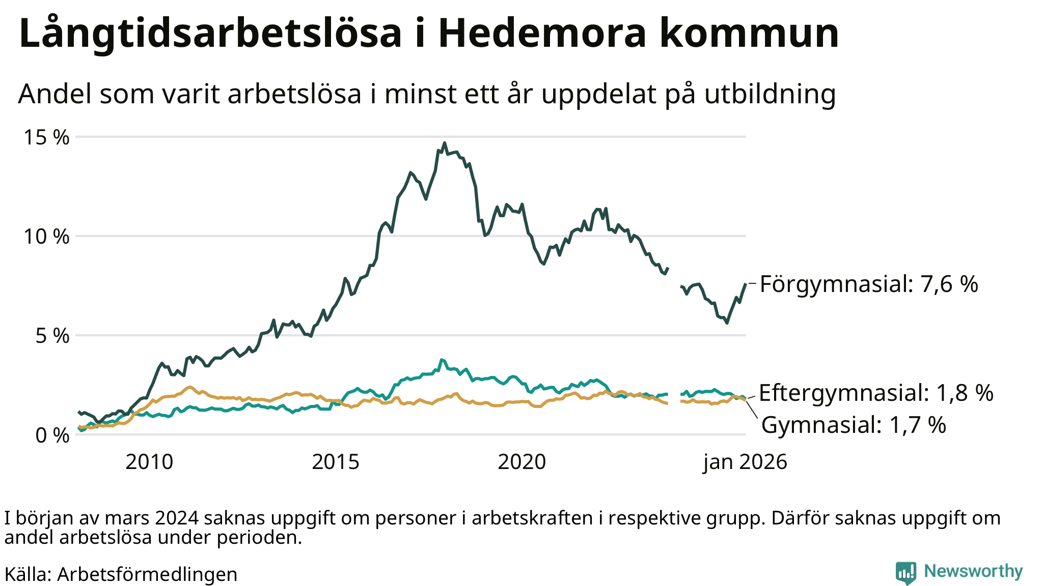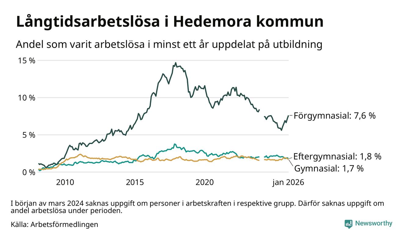 I januari hade 182 Hedemorabor varit arbetslösa i minst ett år, vilket är lika många som månaden innan. 182 personer motsvarar 2,6 procent av arbetskraften i kommunen – andelen långtidsarbetslösa är ungefär på samma nivå som för ett år sedan.